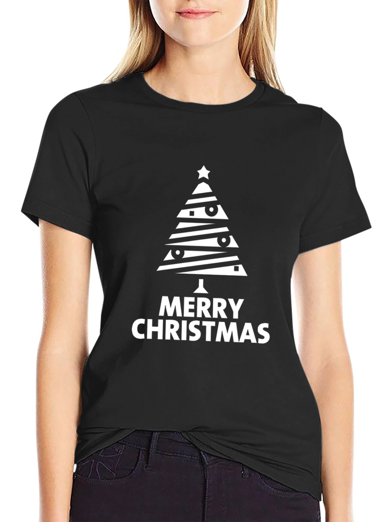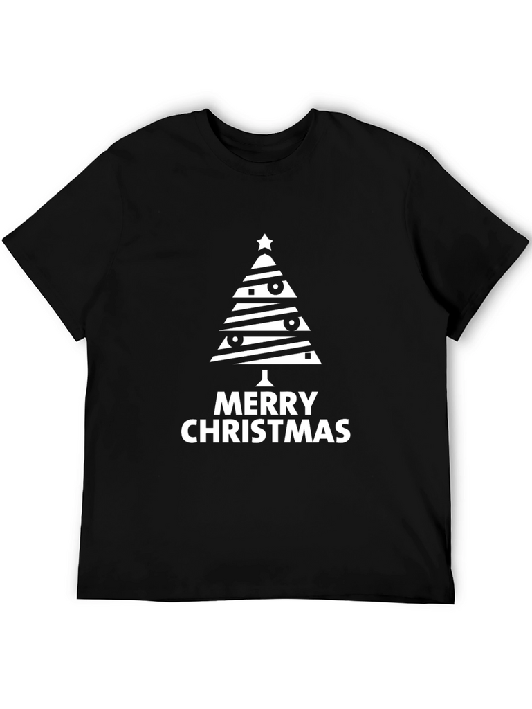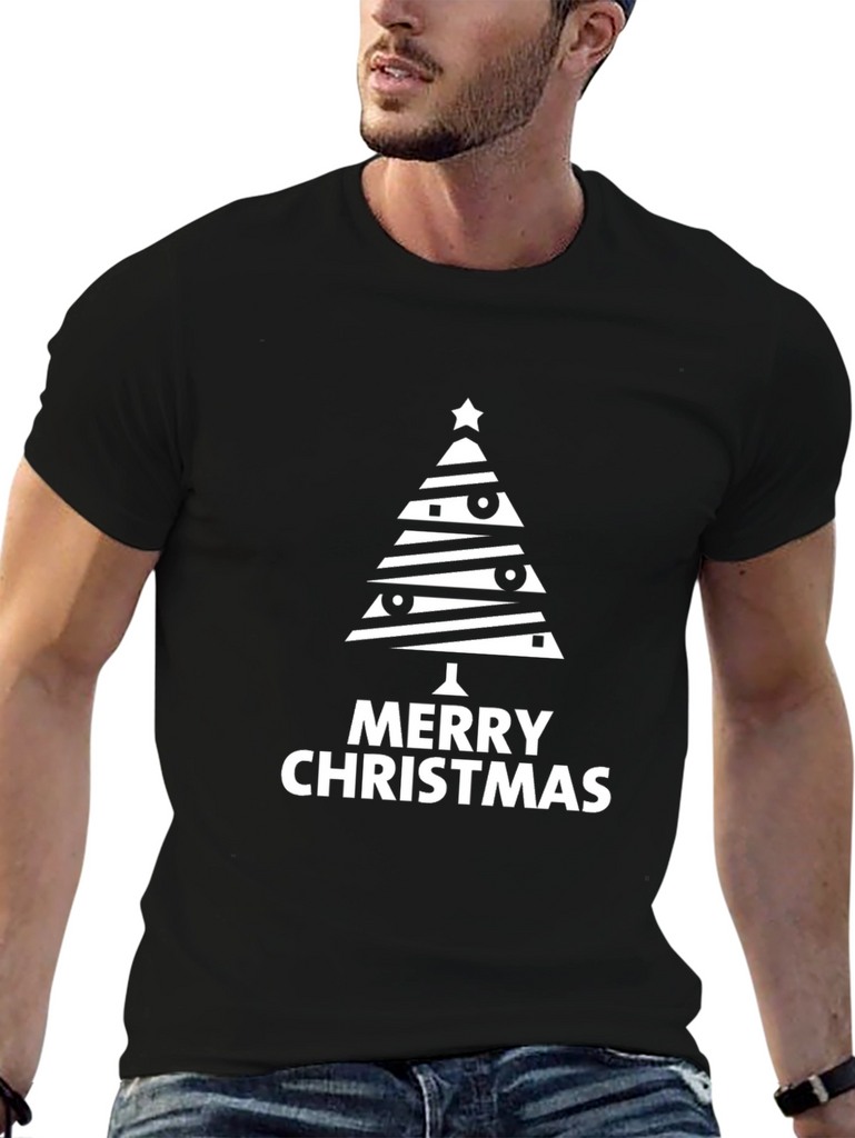 Spread holiday cheer with this stylish black t-shirt featuring a unique Christmas tree graphic. The tree design is modern and eye-catching, with horizontal stripes, festive ornaments, and a star on top. 'Merry Christmas' is printed boldly beneath the tree, making it perfect for the holiday season. Made from a comfortable material, this tee is ideal for casual wear during Christmas parties, family gatherings, or even as a fun everyday statement piece. Celebrate in style and show off your Christmas spirit with this must-have holiday t-shirt!
