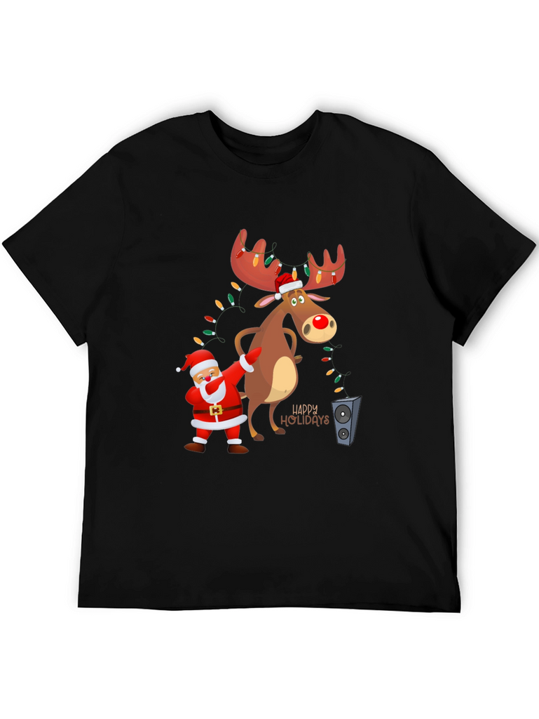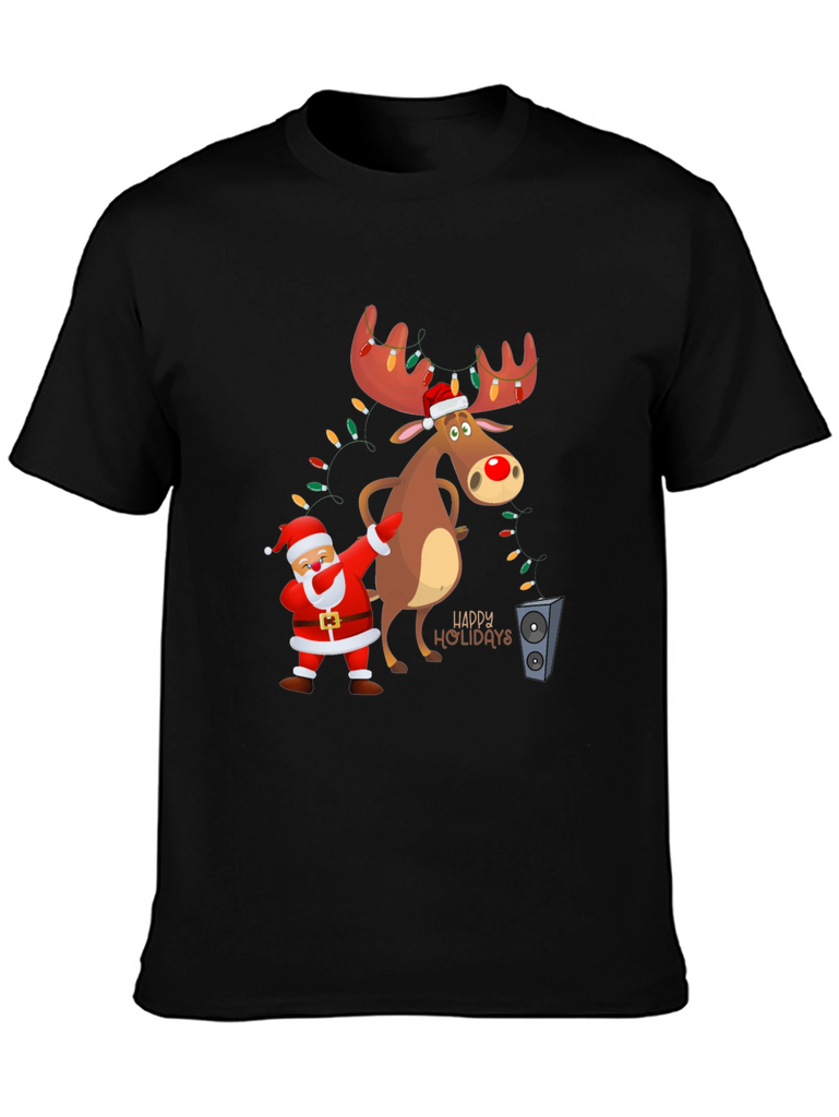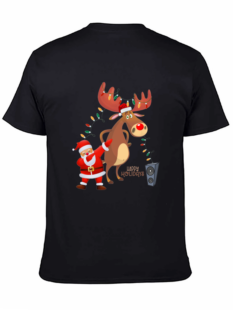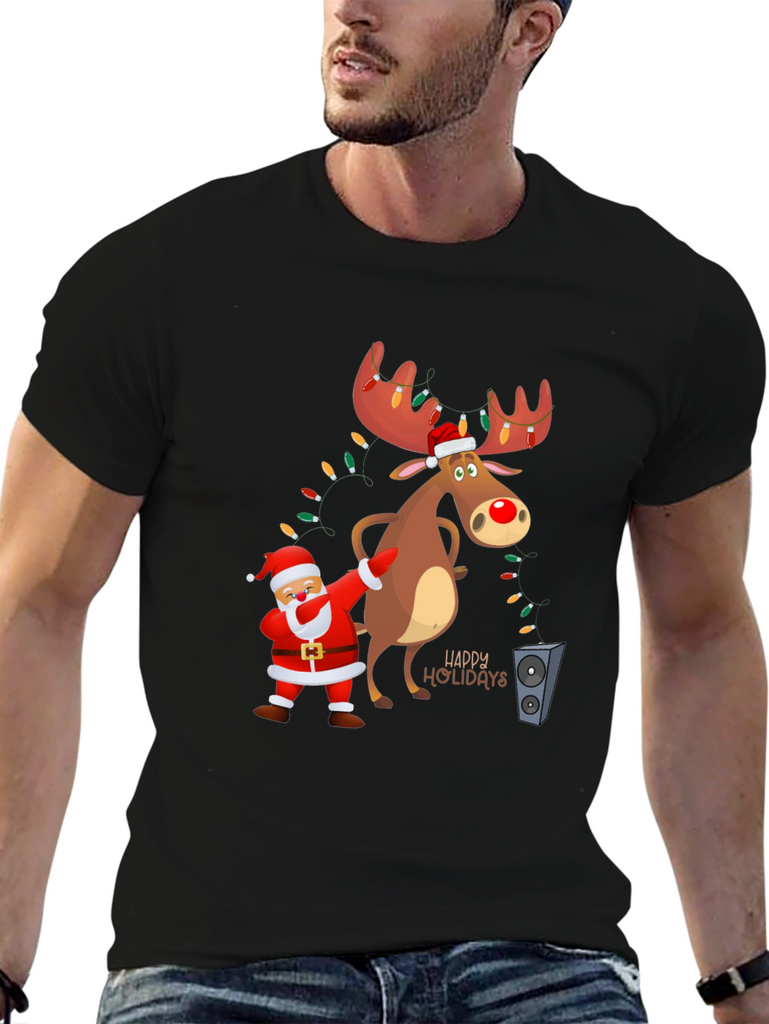 Get into the holiday spirit with this fun and festive t-shirt! The black tee features a cartoon graphic of Santa doing a dab next to a reindeer with light-adorned antlers. The design includes "Happy Holidays" lettering, adding to the cheerful vibe. Made from a soft fabric, this shirt is perfect for casual holiday gatherings, Christmas parties, or just spreading some holiday cheer. Its playful design makes it a great conversation starter. Comfortable and eye-catching, this t-shirt is a must-have for the holiday season!