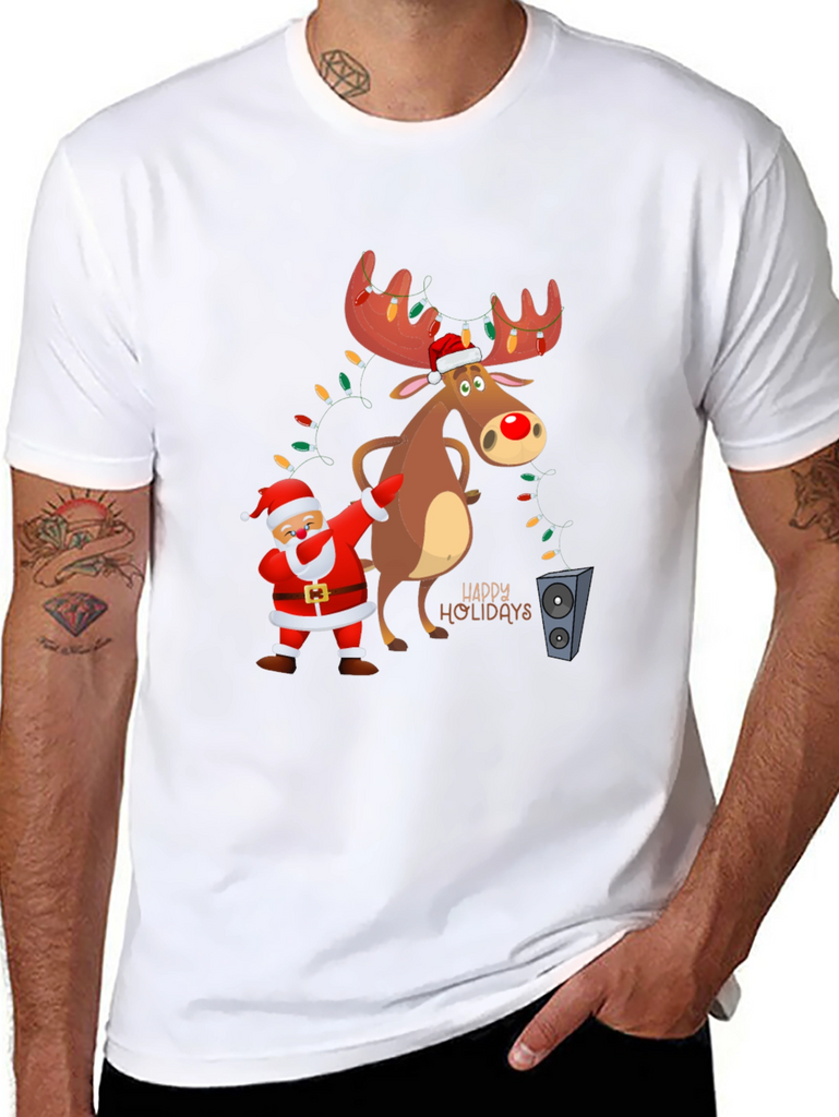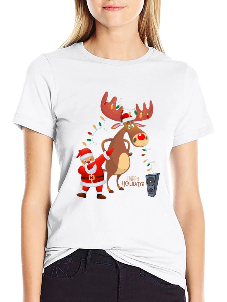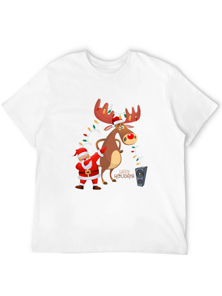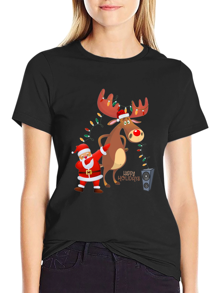 Get into the holiday spirit with this fun and festive t-shirt! The black tee features a cartoon graphic of Santa doing a dab next to a reindeer with light-adorned antlers. The design includes "Happy Holidays" lettering, adding to the cheerful vibe. Made from a soft fabric, this shirt is perfect for casual holiday gatherings, Christmas parties, or just spreading some holiday cheer. Its playful design makes it a great conversation starter. Comfortable and eye-catching, this t-shirt is a must-have for the holiday season!