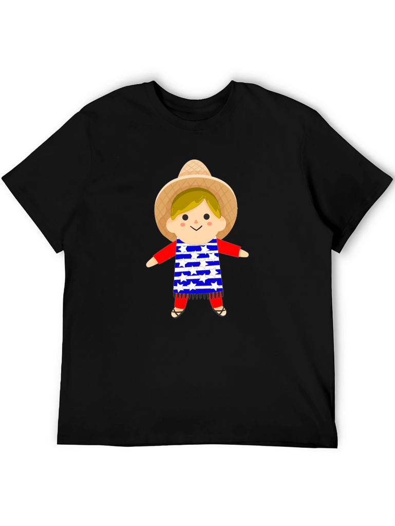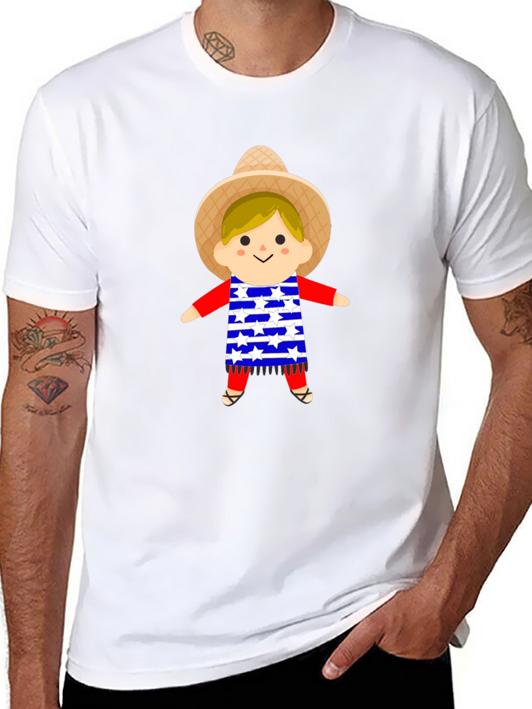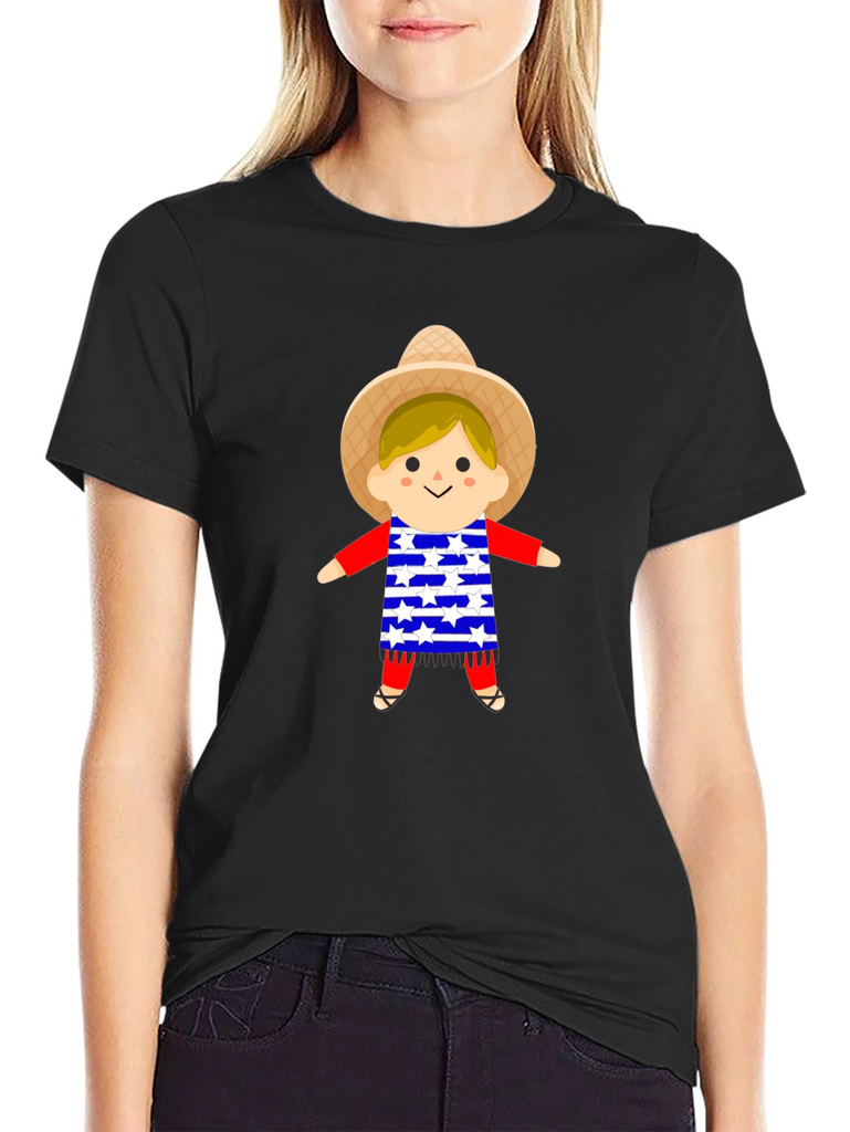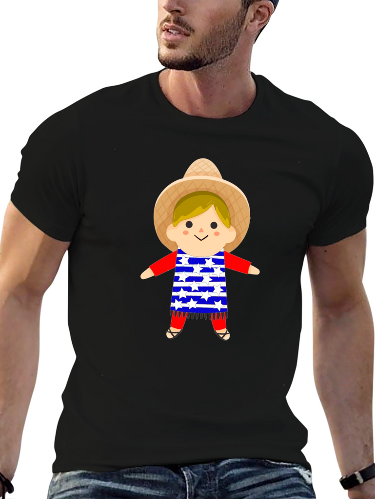 Show off your patriotic side with this unique t-shirt featuring a charming doll graphic. The doll is adorned in a straw hat and a festive outfit with blue stripes and white stars, reminiscent of the American flag. Red accents on the sleeves and pants add a playful pop of color. This eye-catching design is printed on a comfortable black t-shirt, perfect for casual wear or celebrating American holidays. Express your individuality and love for your country with this fun and stylish tee!