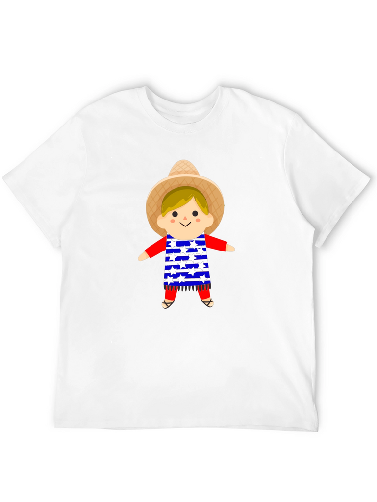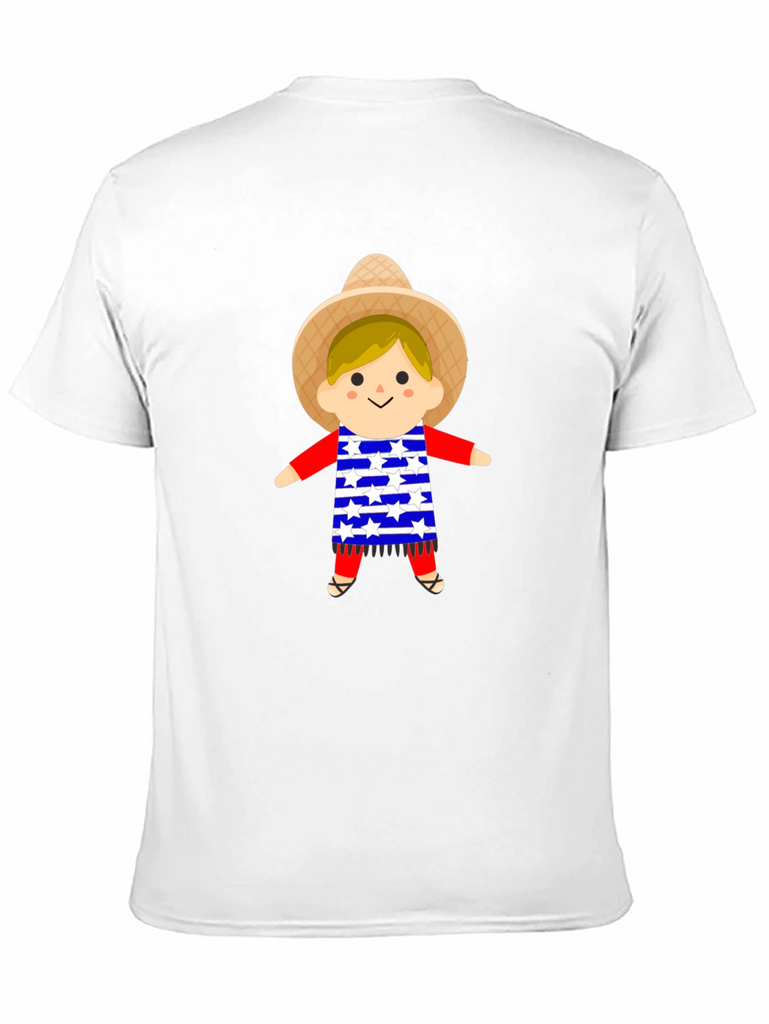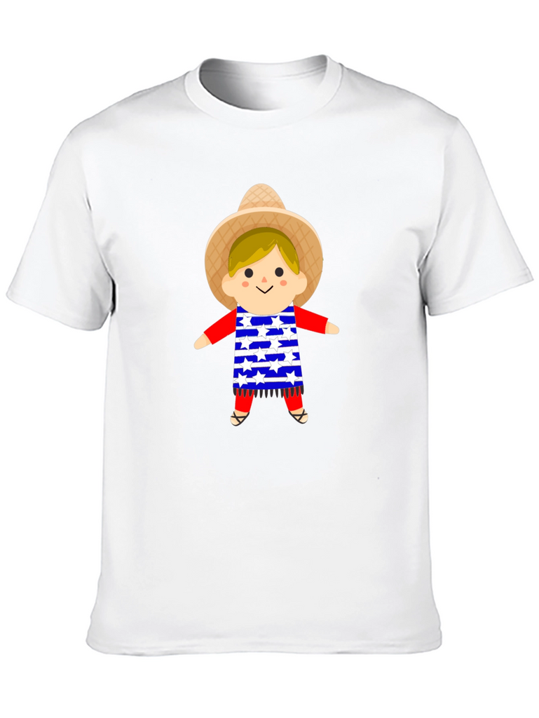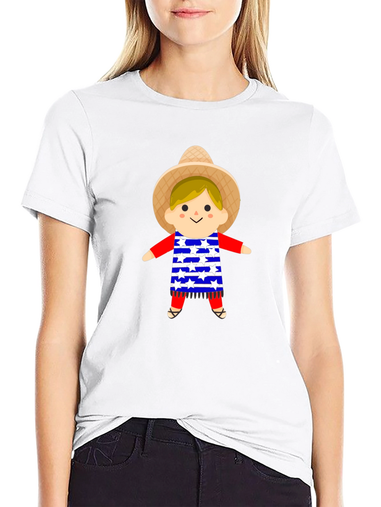 Show off your patriotic side with this unique t-shirt featuring a charming doll graphic. The doll is adorned in a straw hat and a festive outfit with blue stripes and white stars, reminiscent of the American flag. Red accents on the sleeves and pants add a playful pop of color. This eye-catching design is printed on a comfortable black t-shirt, perfect for casual wear or celebrating American holidays. Express your individuality and love for your country with this fun and stylish tee!