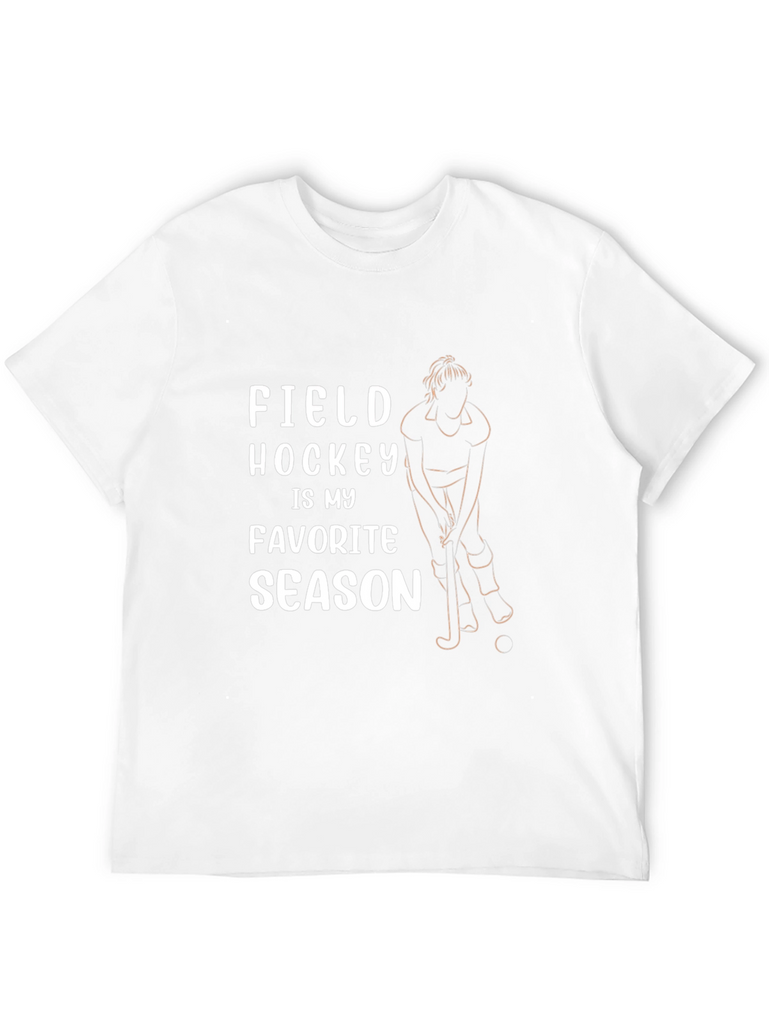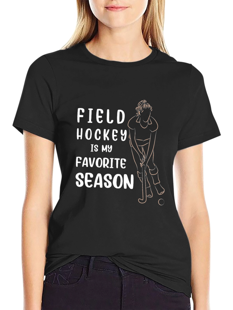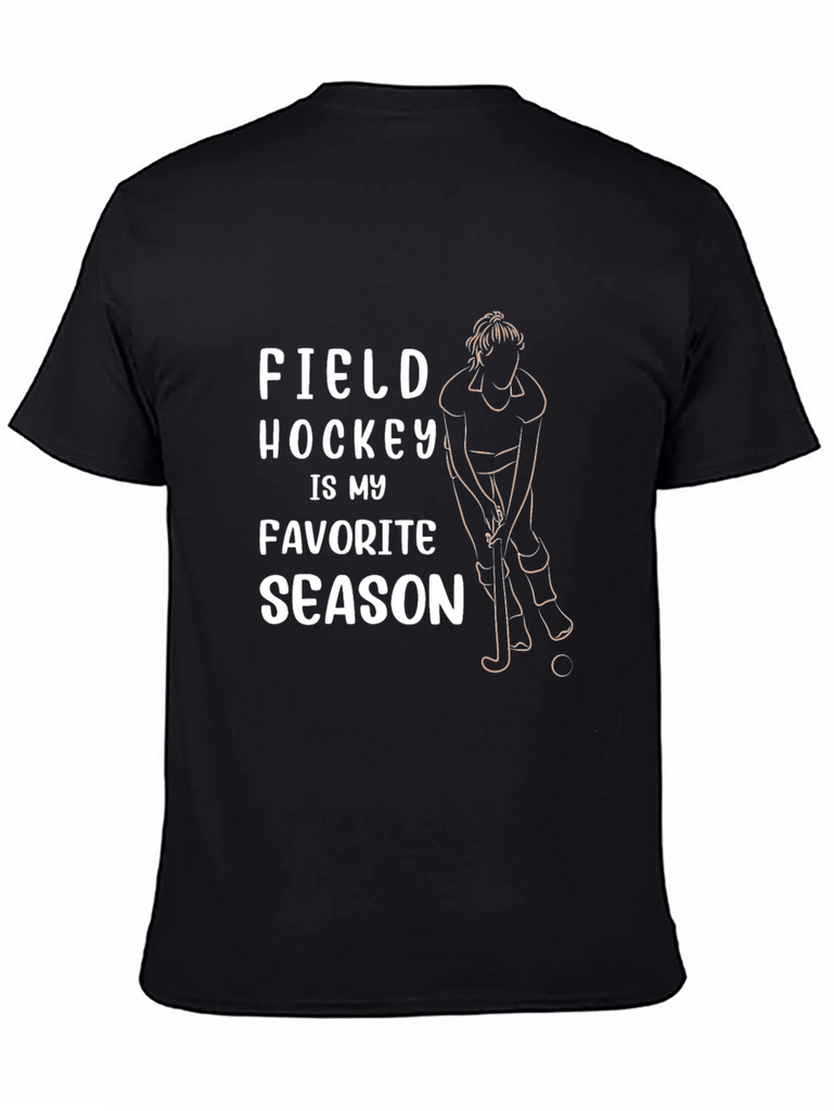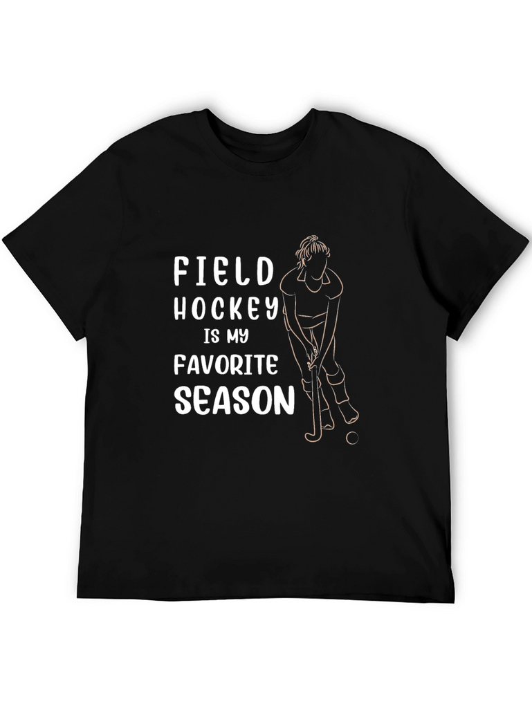 Showcase your love for field hockey with this stylish black graphic tee. The shirt features a bold white design with the statement "Field Hockey Is My Favorite Season" alongside an illustration of a field hockey player. Made from comfortable fabric, this t-shirt is perfect for everyday wear or showing your support at games. The classic fit and versatile design make it a great addition to any wardrobe. Whether you're a player or a fan, this shirt is a must-have for the field hockey enthusiast. Get yours today and celebrate your favorite season!