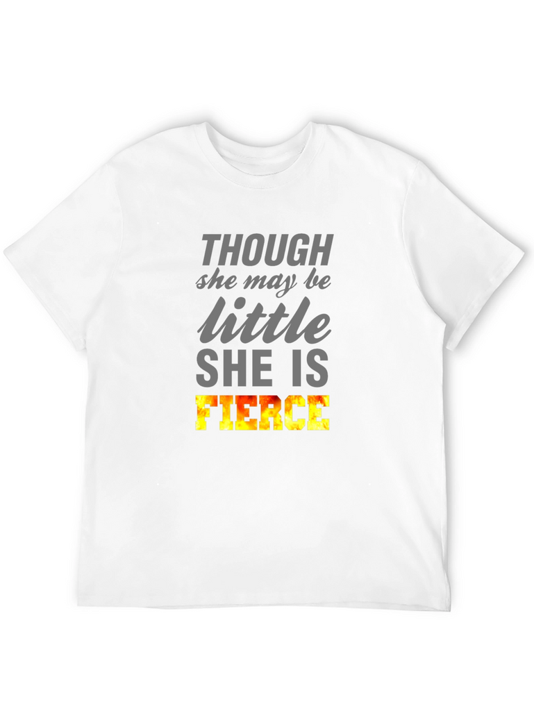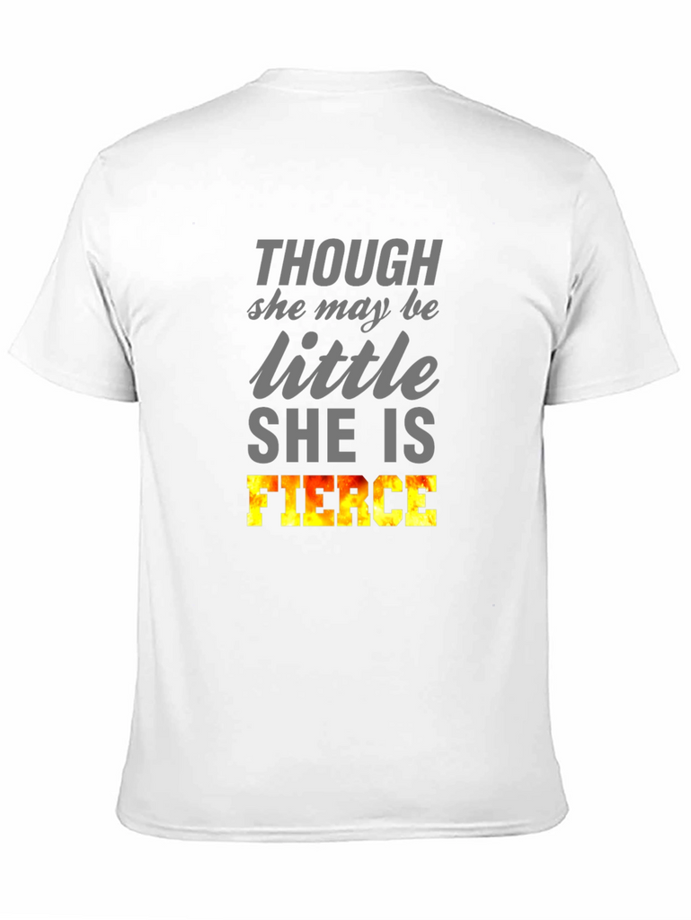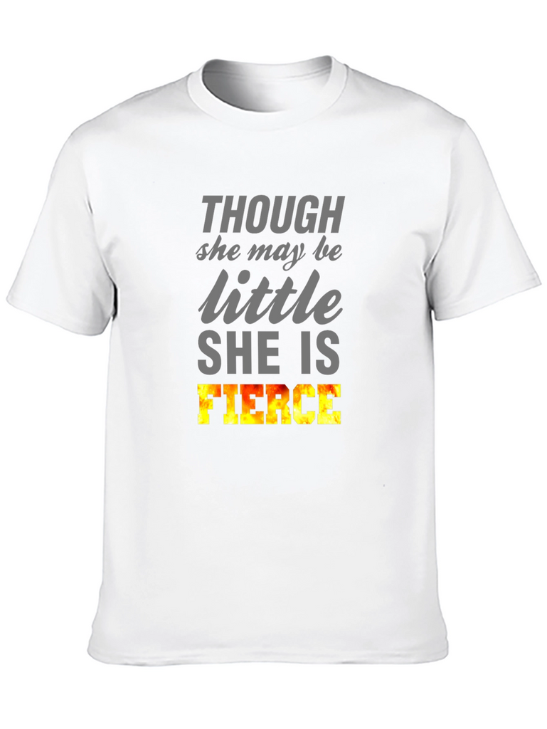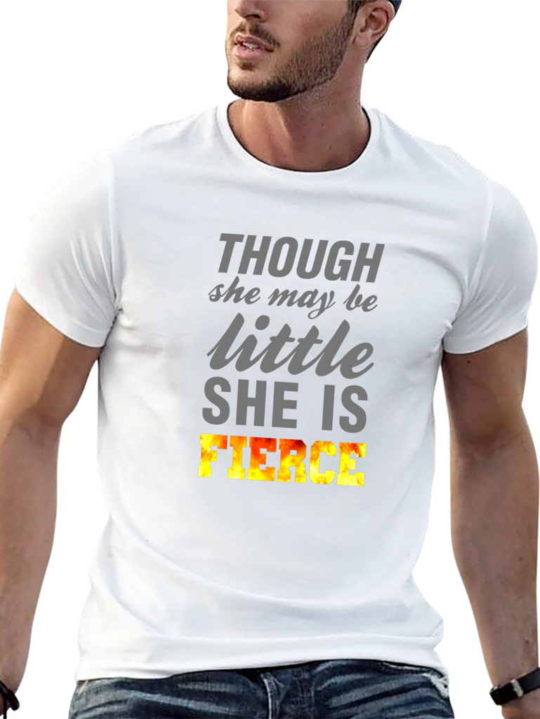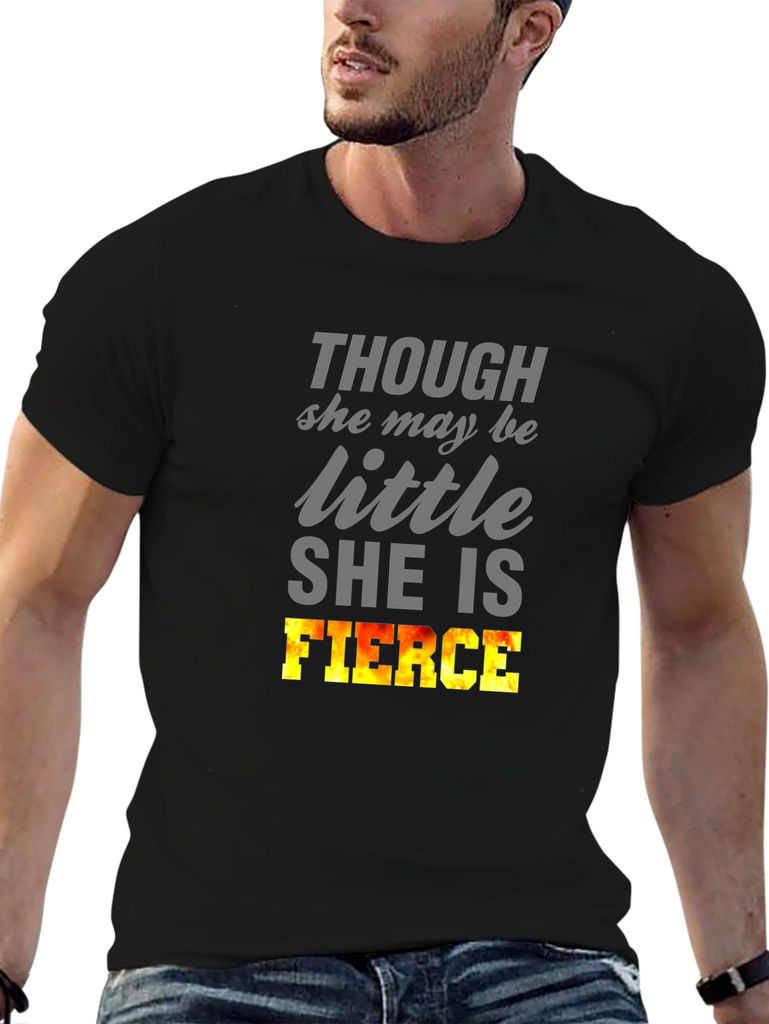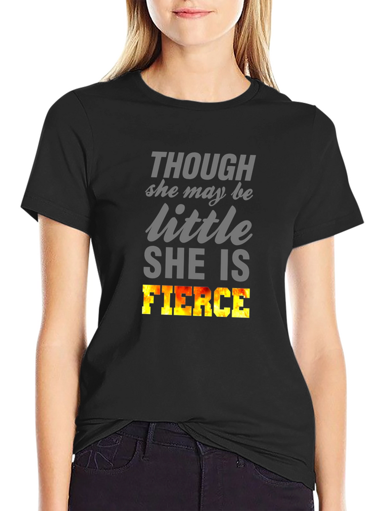 Show off your inner strength with this bold black T-shirt. Featuring the empowering words "THOUGH she may be little SHE IS FIERCE," this tee is perfect for women who embrace their power. The word 'FIERCE' is designed with a flame-like gradient, giving it a visual boost. Ideal for casual outings, gym sessions, or expressing your confidence wherever you go. Made from a soft, comfortable fabric, this short-sleeved shirt offers a relaxed fit for all-day wear. Let your style speak volumes with this statement piece!