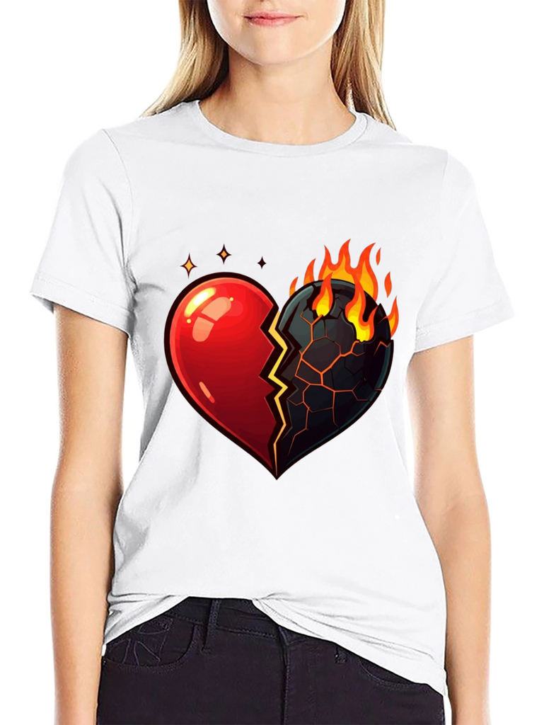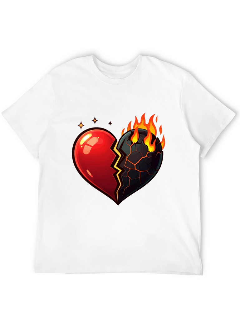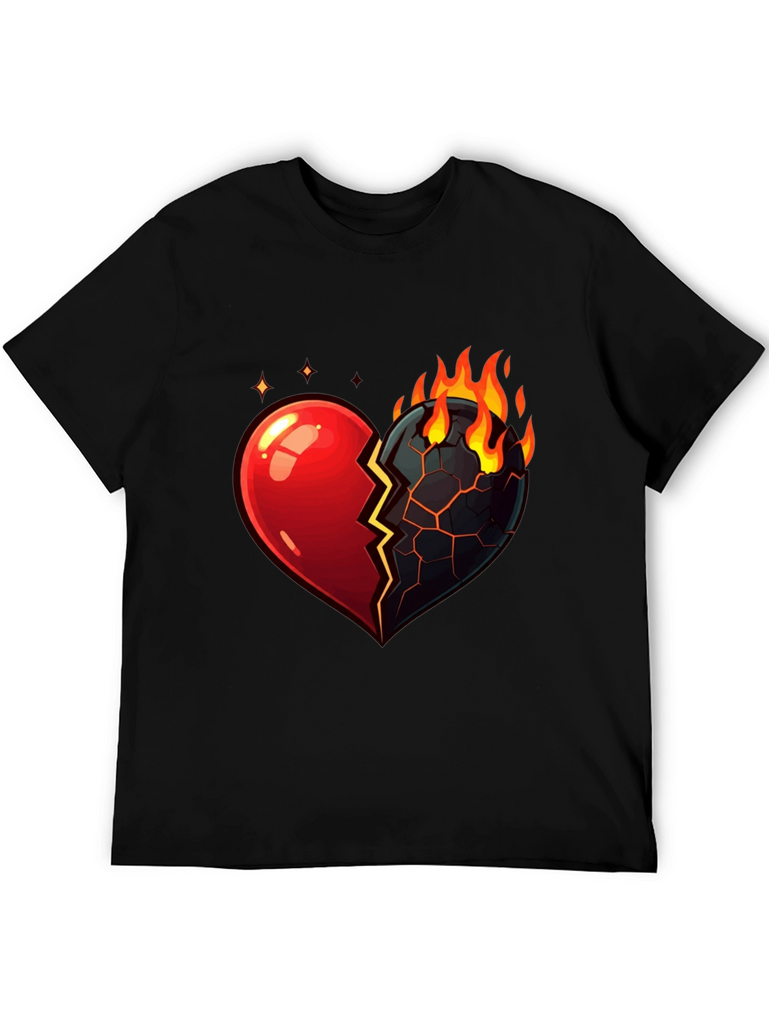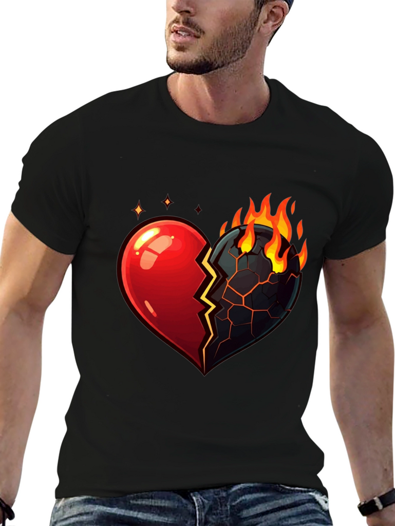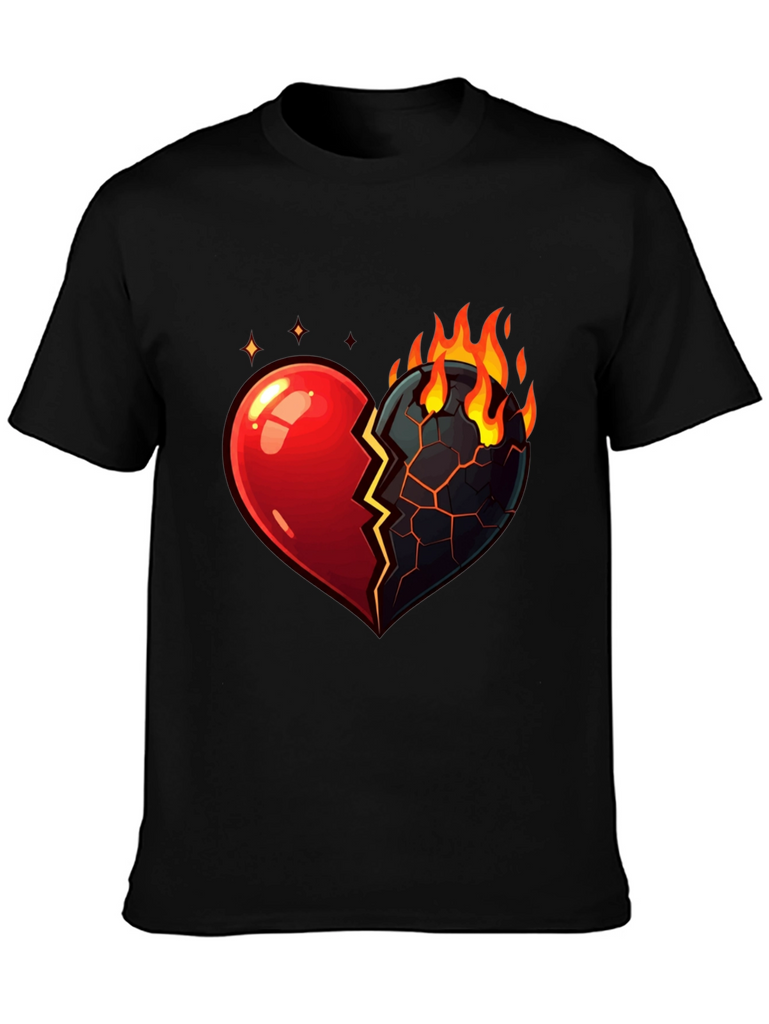 This eye-catching black t-shirt features a bold graphic of a stylized broken heart. One half is a vibrant red, while the other is a dark, cracked stone effect engulfed in flames. The design is modern and striking. The tee appears to be made from a soft and comfortable fabric, making it perfect for everyday wear. Wear it to express your unique style or as a statement piece. Ideal for casual outings, concerts, or just lounging at home. This tee will definitely turn heads and spark conversations.