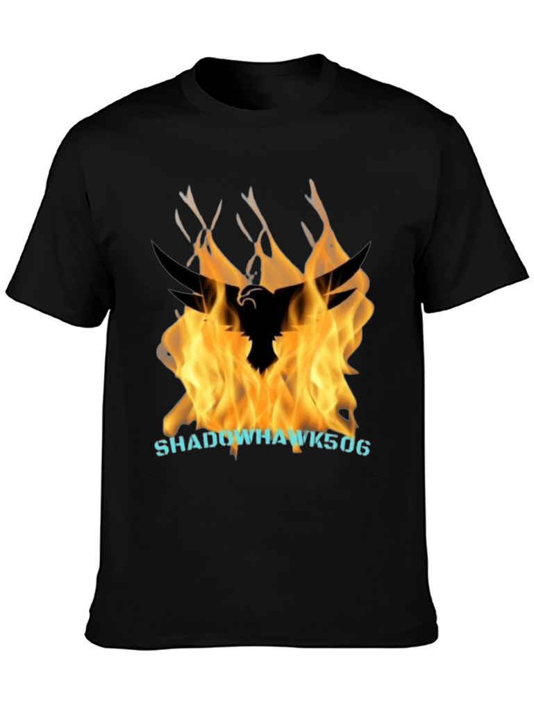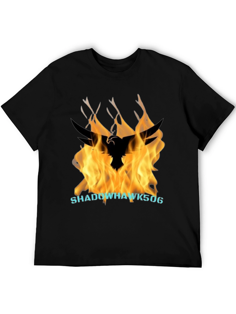 Elevate your style with this striking black t-shirt featuring a bold graphic print. A shadowhawk design leaps from a vibrant flame background, making a powerful statement. The design is complemented by a bright name graphic. Crafted from a comfortable, breathable fabric, this tee is perfect for casual wear or making a bold impression. The classic crew neck and short sleeves offer a relaxed fit suitable for everyday activities. Wear your passions proudly with this eye-catching Shadowhawk tee.