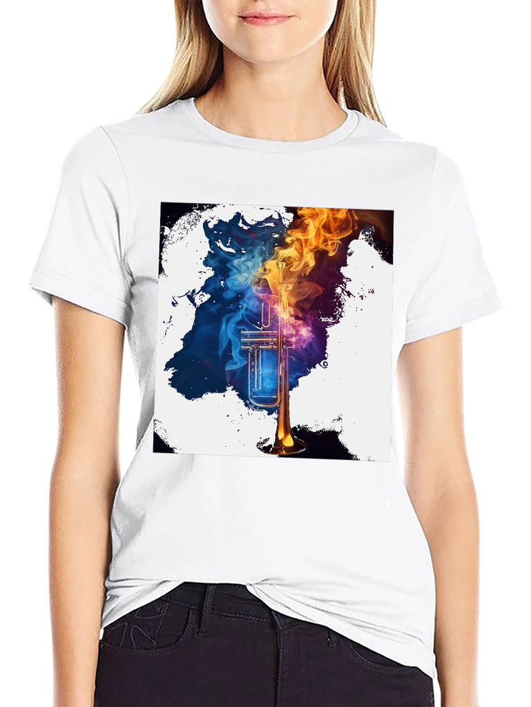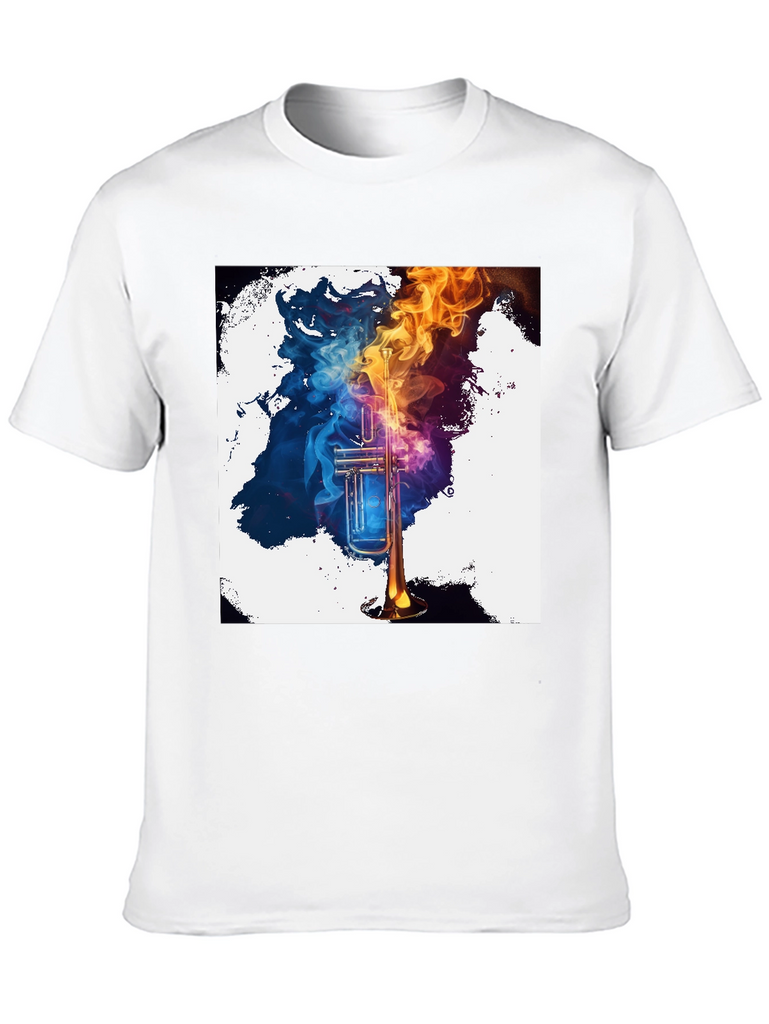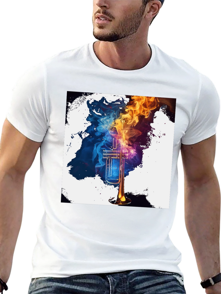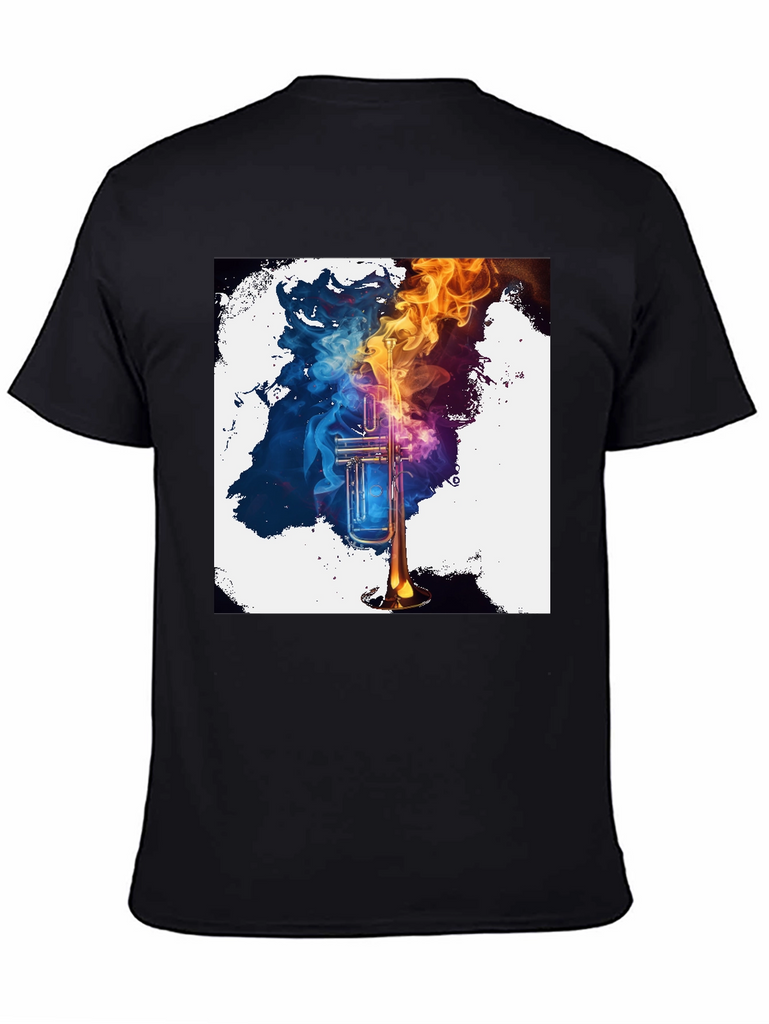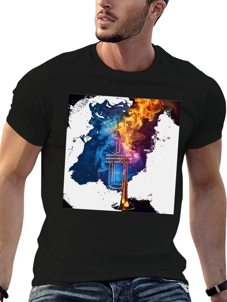 Ignite your passion for music with this eye-catching black t-shirt featuring a vibrant trumpet design. The graphic showcases a stunning trumpet enveloped in a blend of cool blue and fiery orange hues, creating a captivating visual effect. Made from comfortable and breathable fabric, this tee is perfect for everyday wear or making a statement at music events. Express your love for jazz, classical, or any genre with this unique and stylish shirt. A must-have for musicians and music enthusiasts alike, this t-shirt lets you wear your heart on your sleeve - or rather, on your chest!
