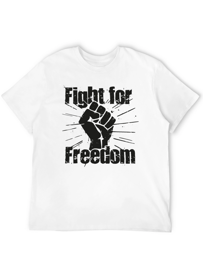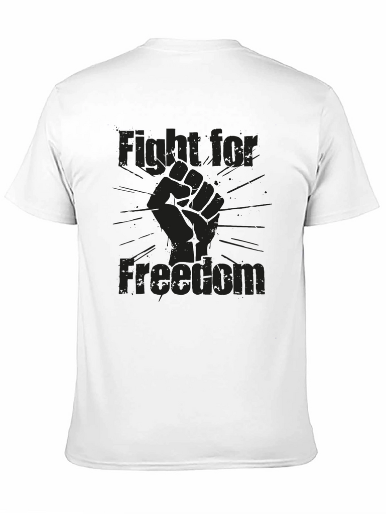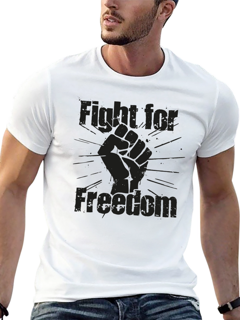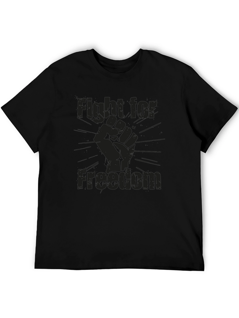 Make a statement with this bold black graphic tee. Featuring a striking 'Fight for Freedom' design with a fist emblem, this t-shirt is perfect for expressing your beliefs. The classic fit and comfortable fabric ensure all-day wearability, making it ideal for casual outings, rallies, or everyday style. Pair it with jeans or shorts for an effortlessly cool look. Let your wardrobe reflect your values with this impactful and stylish graphic tee.