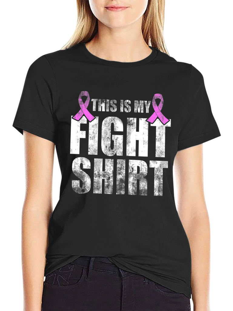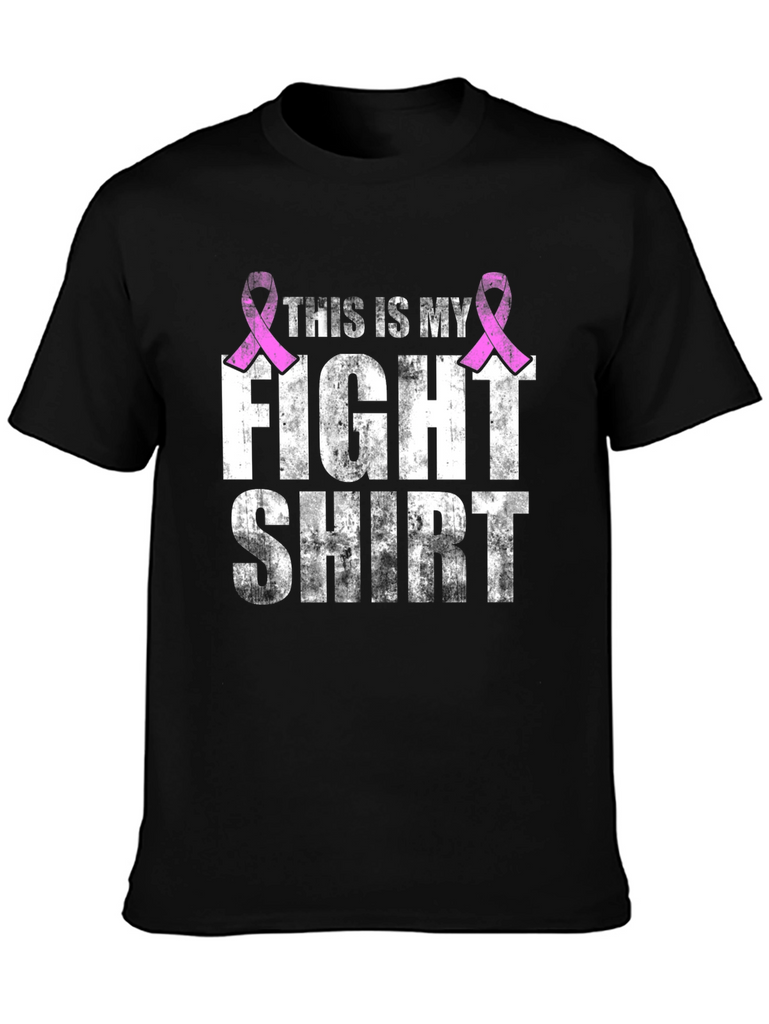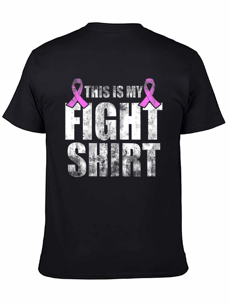 Show your support with this bold black t-shirt. The distressed white lettering declares 'This is my fight shirt', adorned with two pink breast cancer awareness ribbons. This tee is perfect for raising awareness at walks, events, or simply as a statement of solidarity. Durable and comfortable, this shirt is a meaningful way to make a difference. Wear your support with pride and help spread the message of hope and strength.