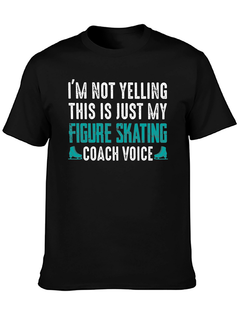 This black t-shirt features a humorous graphic design, perfect for figure skating coaches or fans. The text reads, "I'M NOT YELLING THIS IS JUST MY FIGURE SKATING COACH VOICE," in bold white and blue-green lettering, accompanied by small images of ice skates. Made from a comfortable-looking fabric, this shirt is ideal for casual wear, practice sessions, or showing support at competitions. It's a great conversation starter and a fun way to express your passion for figure skating. A stylish and comfortable addition to any skating enthusiast's wardrobe.