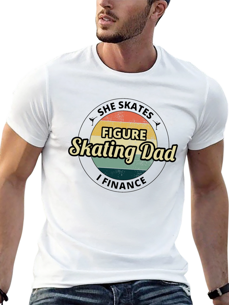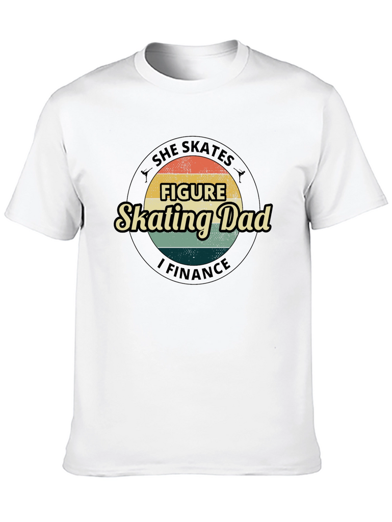 Show your support with this "She Skates Figure Skating Dad I Finance" T-shirt. This classic black tee features a vintage-style graphic with a distressed, circular design. The bold, eye-catching text is perfect for any proud skating dad. Made from a comfortable, breathable fabric, this shirt is ideal for everyday wear. Whether you're at the rink, running errands, or just relaxing at home, this tee is a great way to express your dedication. A perfect gift for the supportive father of a figure skater.