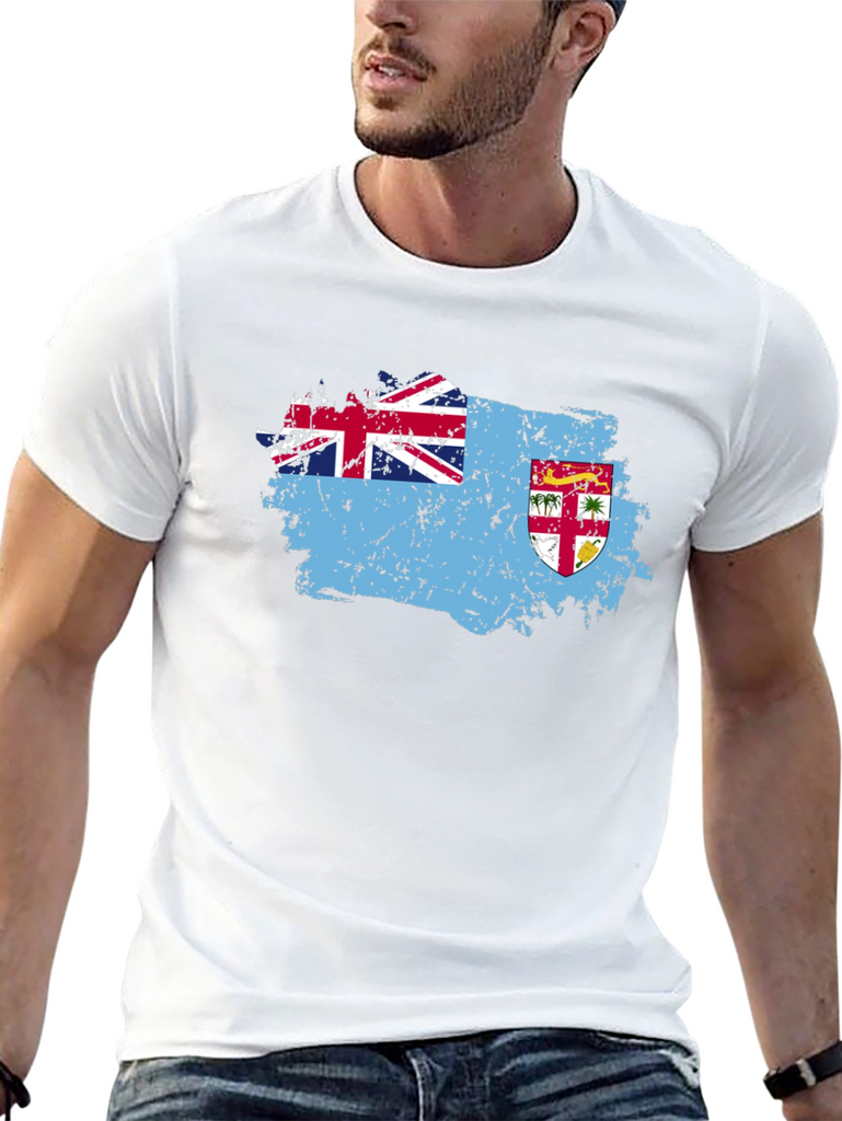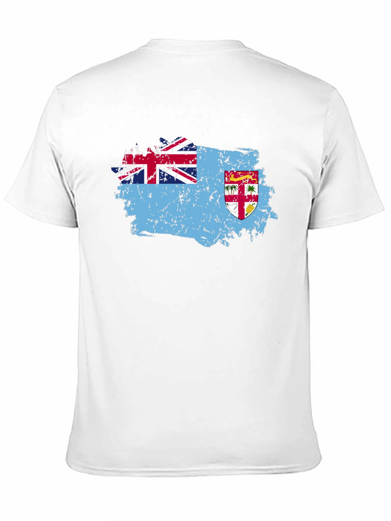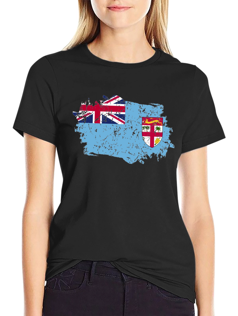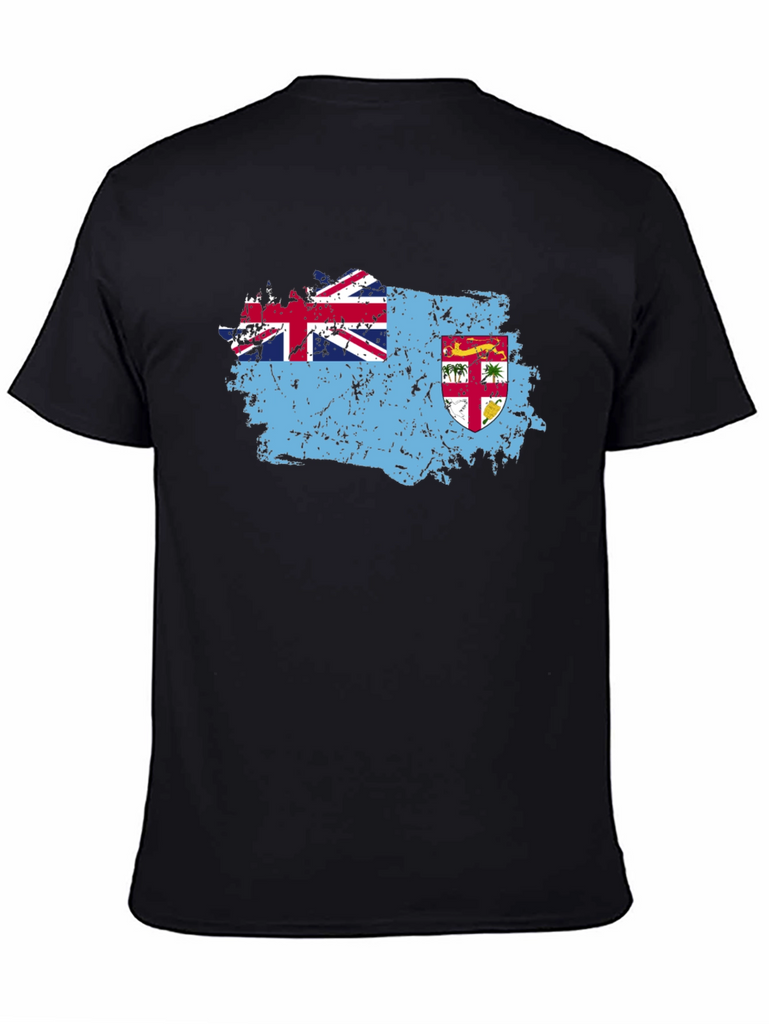 Show your Fijian pride with this unique t-shirt! The shirt features a distressed-style graphic of the Fiji flag, giving it a cool, vintage look. The design is printed on a soft, comfortable black fabric. This tee is perfect for casual wear, sporting events, or as a souvenir. Makes a great gift for Fijians and Fiji enthusiasts alike. Easy to pair with jeans, shorts, or casual bottoms for a stylish and effortless outfit. Wear your Fijian heritage with pride!