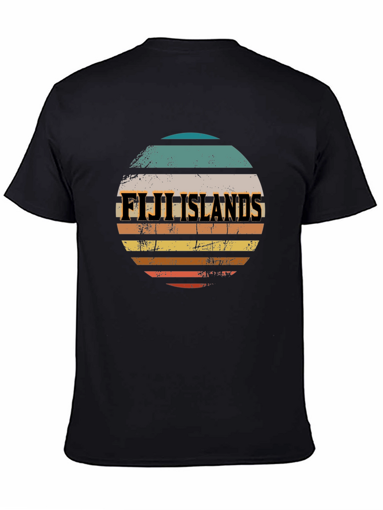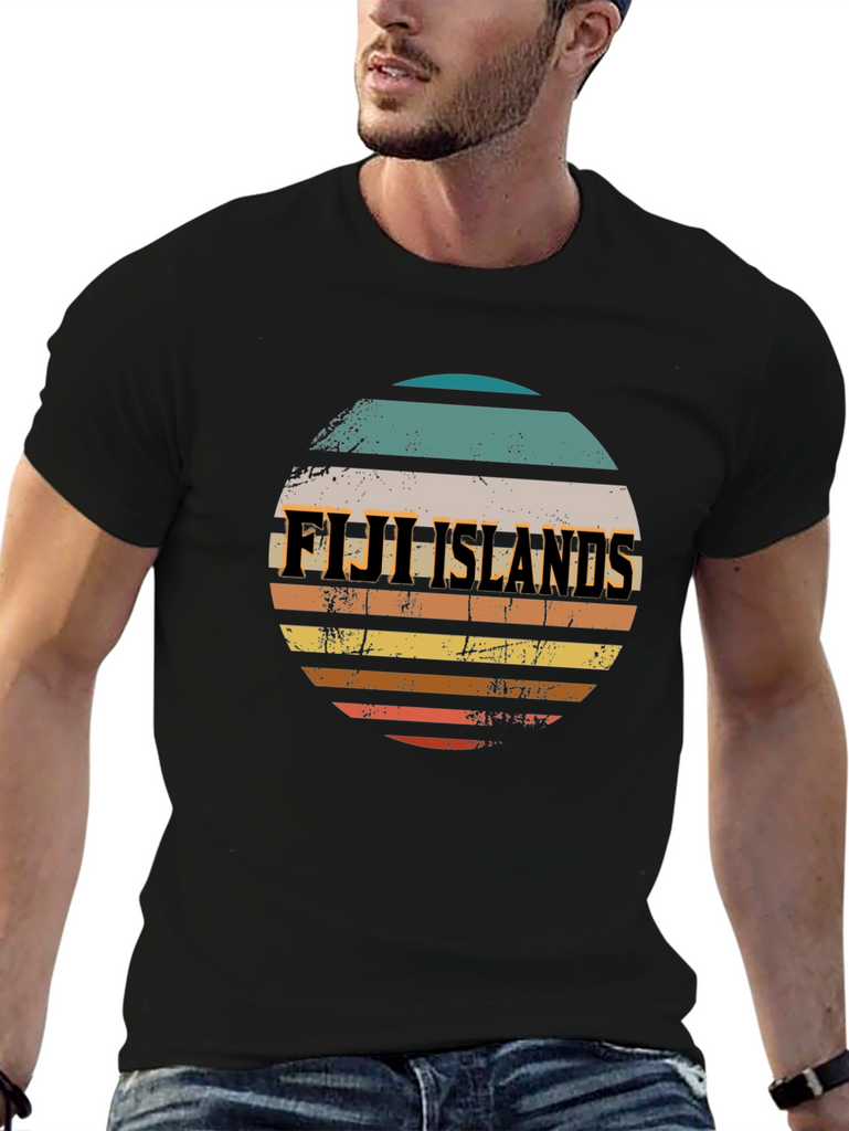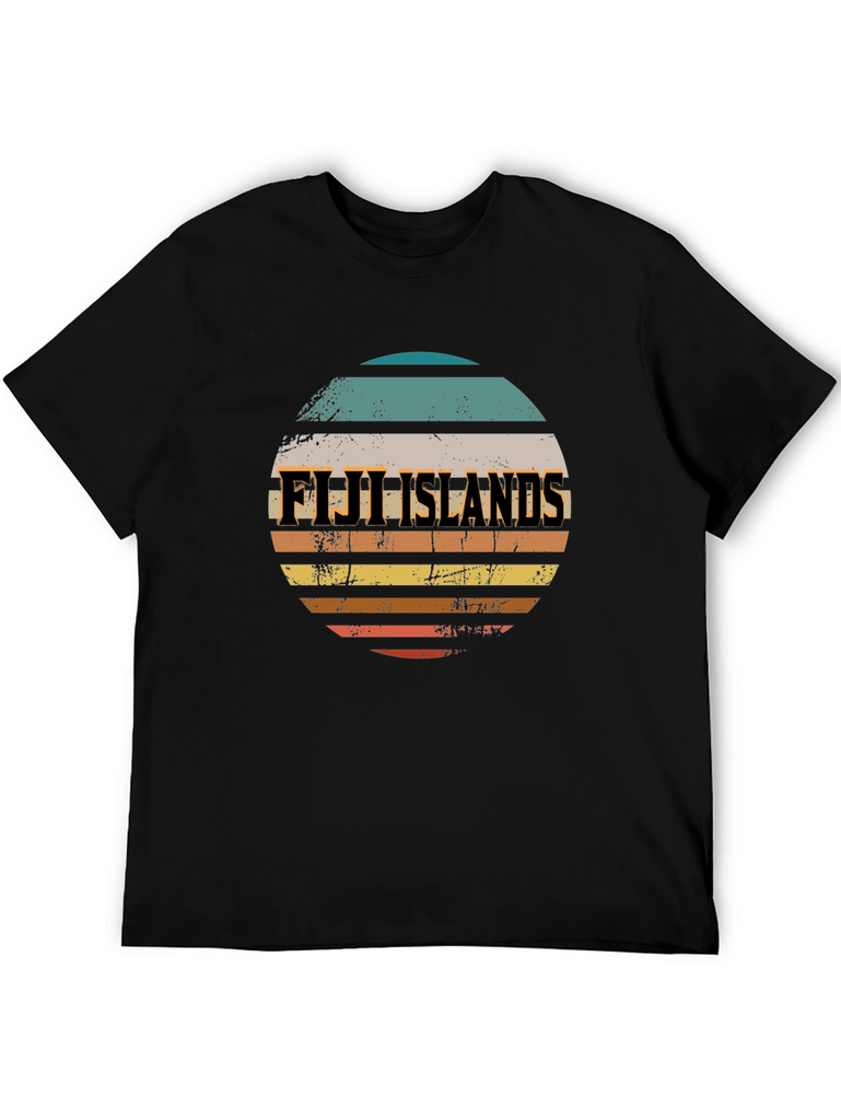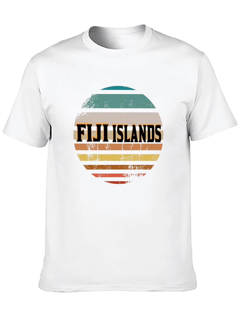 Showcase your love for Fiji Islands with this vintage-inspired graphic t-shirt. The design features a circular retro sunset with horizontal stripes in teal, tan, yellow, and orange. "FIJI ISLANDS" is printed in bold, distressed lettering across the center. Made from a comfortable, breathable fabric, this tee is perfect for casual wear, vacations, or as a souvenir. The dark color of the shirt makes the graphic pop, while the classic fit ensures all-day comfort. Whether you're exploring new places or simply relaxing at home, this stylish t-shirt is a great way to express your love for Fiji.