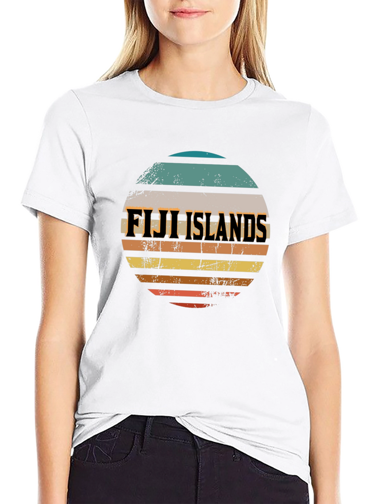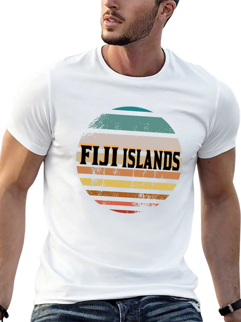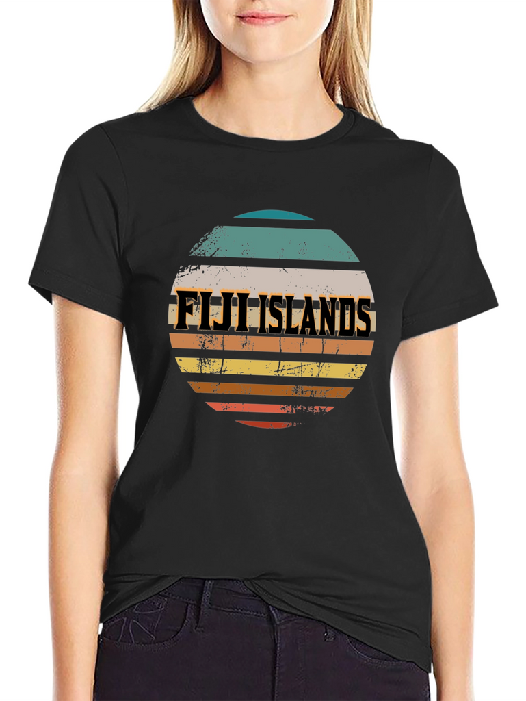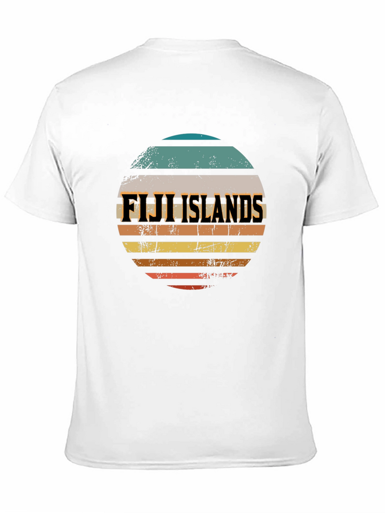 Showcase your love for Fiji Islands with this vintage-inspired graphic t-shirt. The design features a circular retro sunset with horizontal stripes in teal, tan, yellow, and orange. "FIJI ISLANDS" is printed in bold, distressed lettering across the center. Made from a comfortable, breathable fabric, this tee is perfect for casual wear, vacations, or as a souvenir. The dark color of the shirt makes the graphic pop, while the classic fit ensures all-day comfort. Whether you're exploring new places or simply relaxing at home, this stylish t-shirt is a great way to express your love for Fiji.