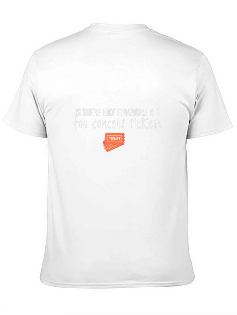 This black t-shirt humorously asks, "Is there like financial aid for concert tickets?" in a playful white font. An orange ticket graphic adds a pop of color. Crafted from a comfortable-looking material, this tee is perfect for music lovers with a sense of humor. Wear it to concerts, casual outings, or anywhere you want to spark a conversation. Show off your love for live music and a lighthearted attitude with this unique and relatable tee. A must-have for any concert enthusiast's wardrobe!