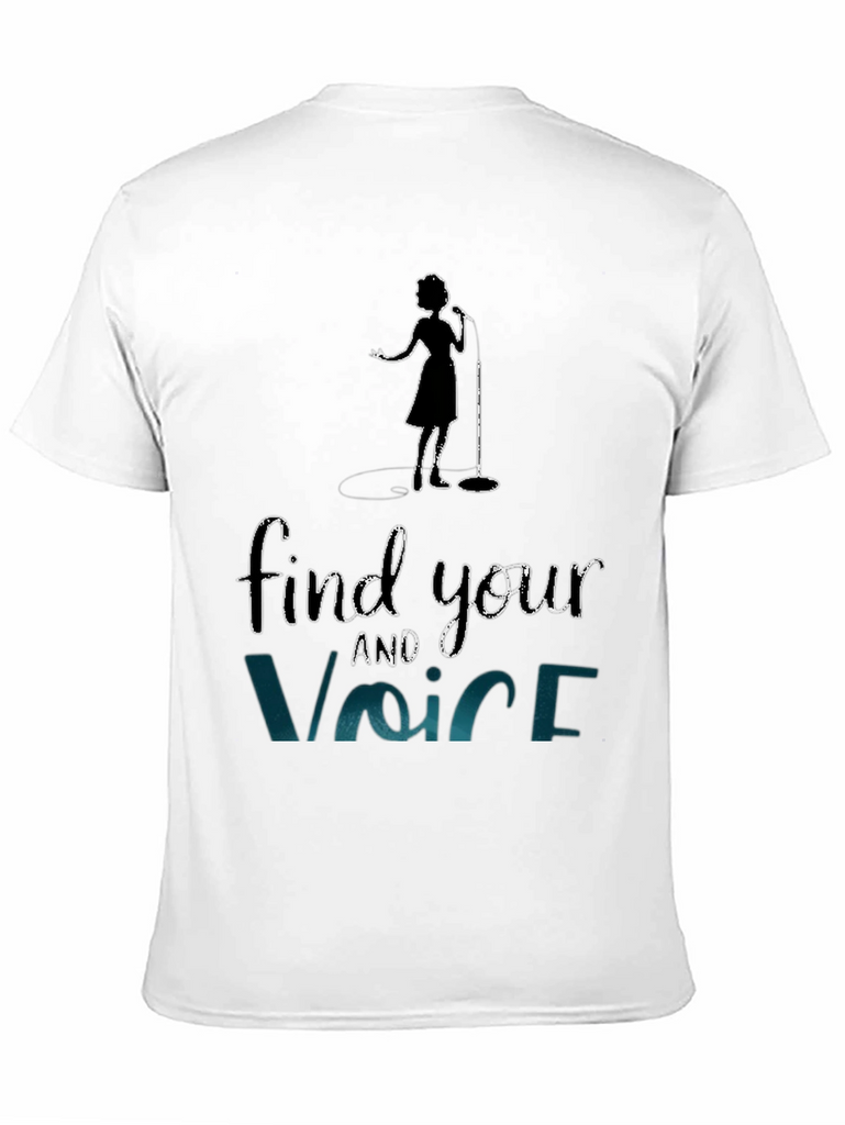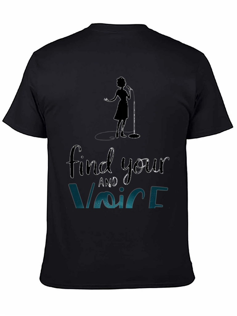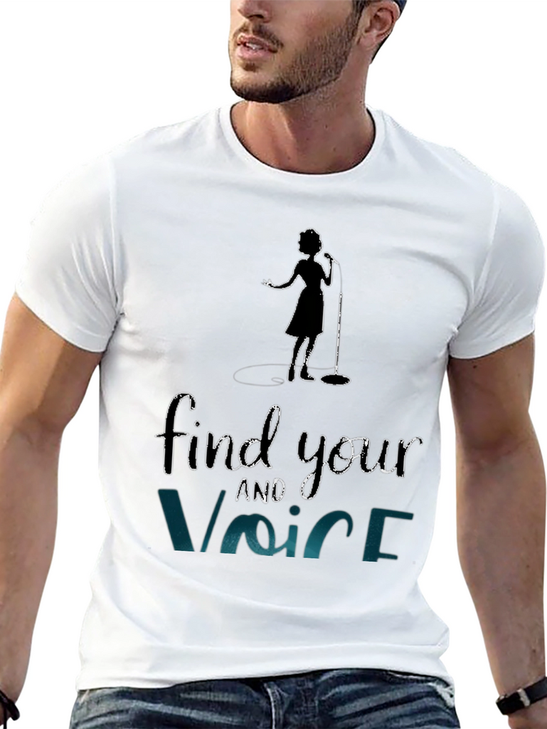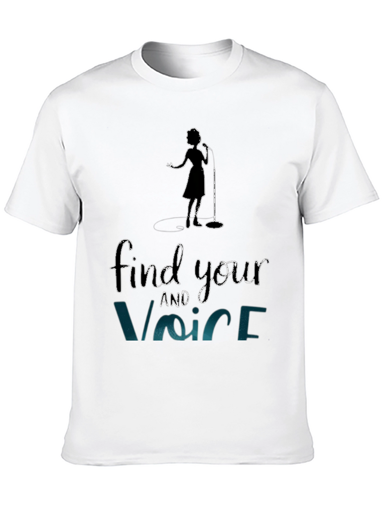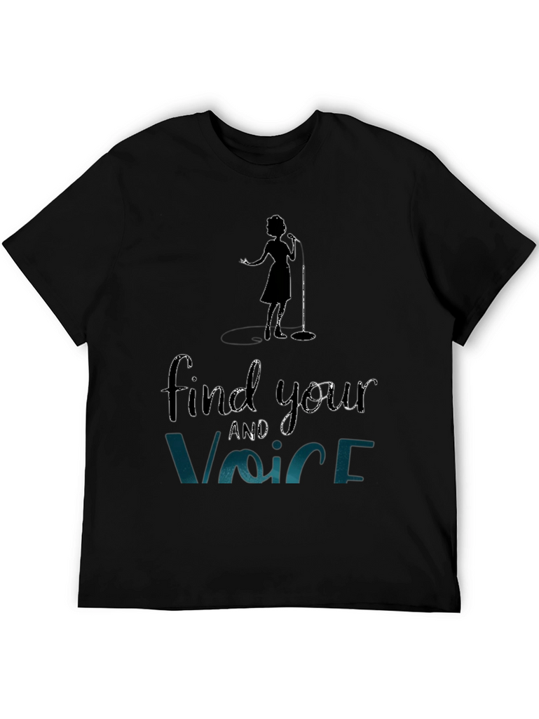 Express yourself with this stylish and empowering graphic tee. Featuring a silhouette of a woman singing on a microphone, complemented by the text "Find your and Voice", this black tee is a statement piece. Made from a soft, comfortable fabric, this shirt is perfect for everyday wear, concerts, karaoke nights, or any occasion where you want to showcase your passion for music and self-expression. The bold graphic design will catch everyone's attention. A perfect conversation starter and a great gift for singers, musicians, and anyone who wants to find their voice.