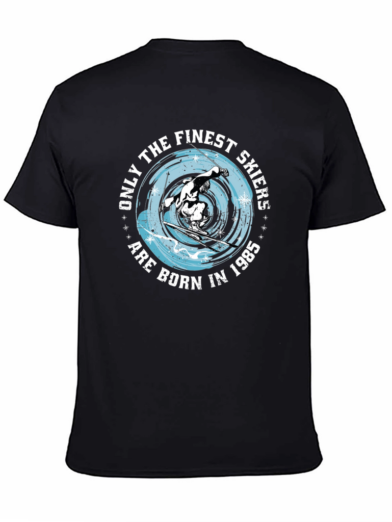 Showcase your passion for skiing with this unique black t-shirt! The tee features a bold graphic design with a skier in action, encircled by the phrase "Only the Finest Skiers Are Born in 1985." The design has a sporty look and cool blue color scheme. Made from a soft, breathable fabric, this t-shirt ensures all-day comfort and a great fit. Perfect for casual wear, ski trips, or as a gift for that ski enthusiast born in 1985. Grab yours and hit the slopes in style!