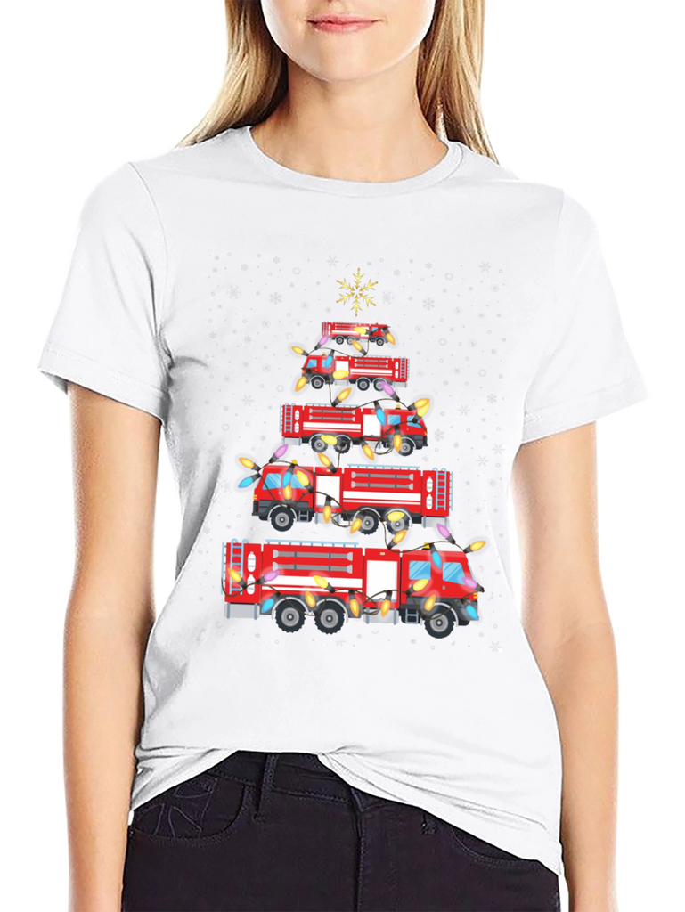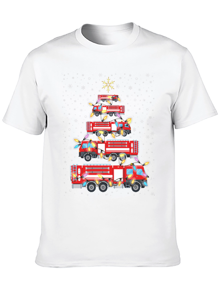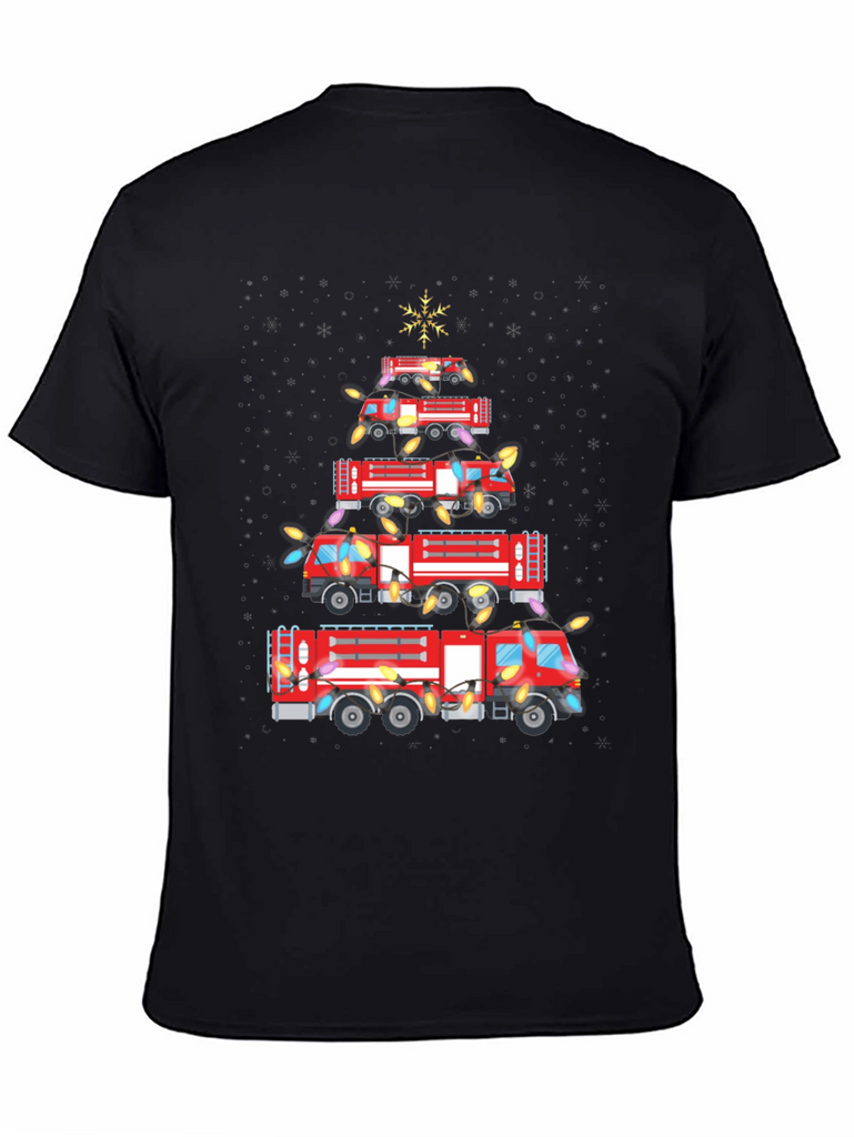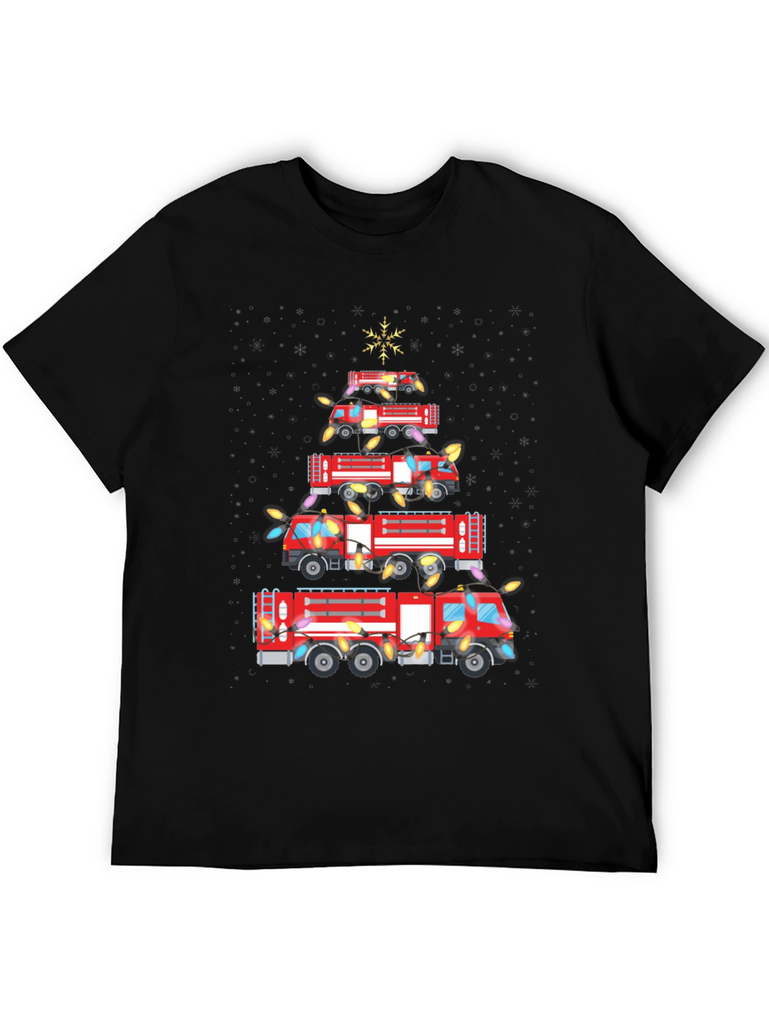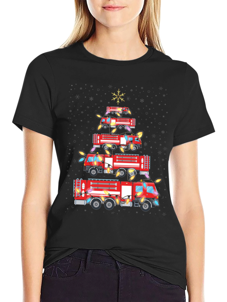 Get into the holiday spirit with this unique black t-shirt featuring a festive fire truck Christmas tree design! The eye-catching graphic showcases several red firetrucks stacked in the shape of a classic Christmas tree, complete with a golden star on top and adorned with colorful Christmas lights. This fun and playful shirt is made from a comfortable material and is perfect for firefighters, firetruck enthusiasts, or anyone looking to add a touch of quirky holiday cheer to their wardrobe. Wear it to holiday parties, family gatherings, or just around town to spread some Christmas joy. A sure conversation starter and a memorable gift!