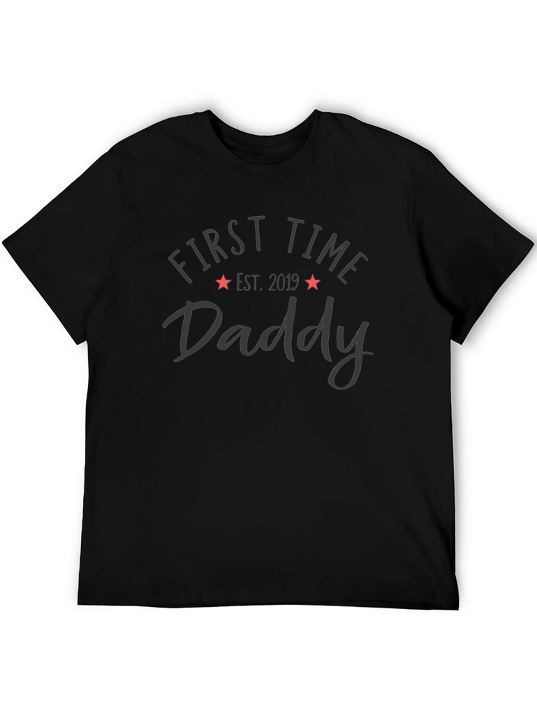 Celebrate becoming a new dad with this stylish black t-shirt. Featuring the words 'First Time Daddy' and 'Est. 2019' in a subtle gray font, this shirt is perfect for showing off your new role. The stars on each side of the year add an extra touch of flair. Made from soft, breathable fabric, it's comfortable enough for everyday wear. Whether you're running errands or spending quality time with your little one, this t-shirt is a great way to announce your proud papa status. A perfect gift for new dads!