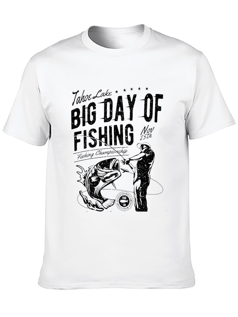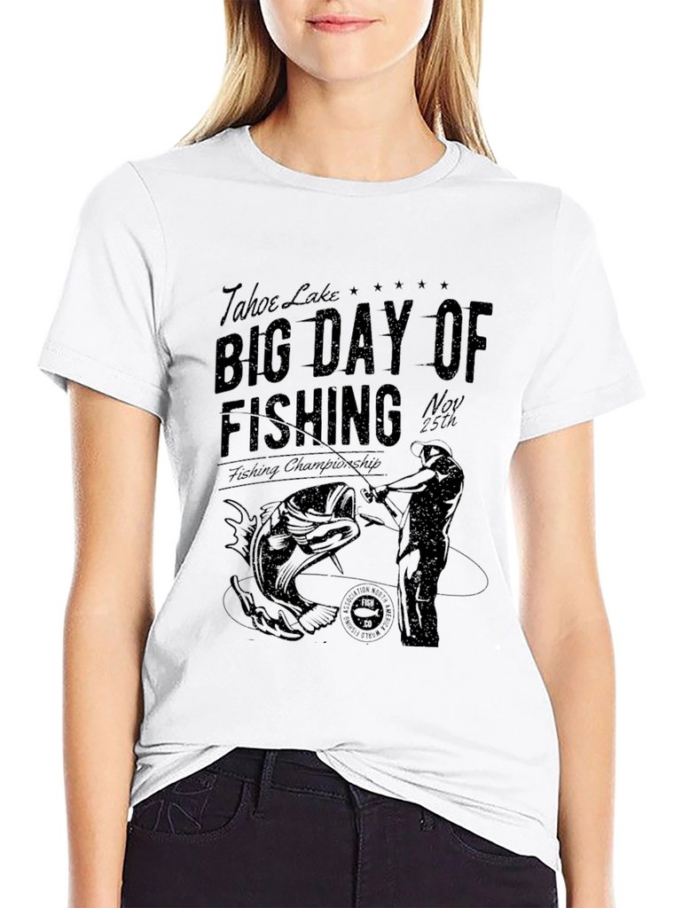 Reel in style with this cool, black graphic t-shirt. Featuring a distressed print design that reads "Tahoe Lake Big Day of Fishing" with a stylized graphic of a fisherman and a leaping bass, this tee is perfect for angling enthusiasts. The shirt appears to be made from a comfortable cotton blend, making it ideal for everyday wear or your next fishing trip. Show off your passion for fishing with this unique and eye-catching tee!