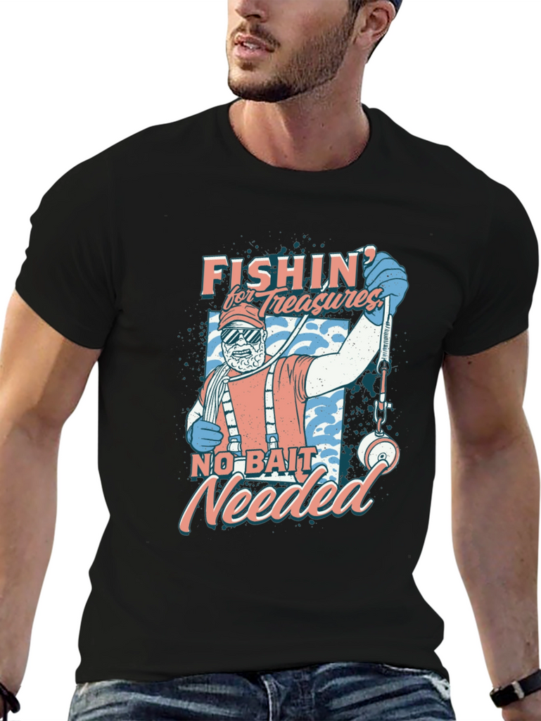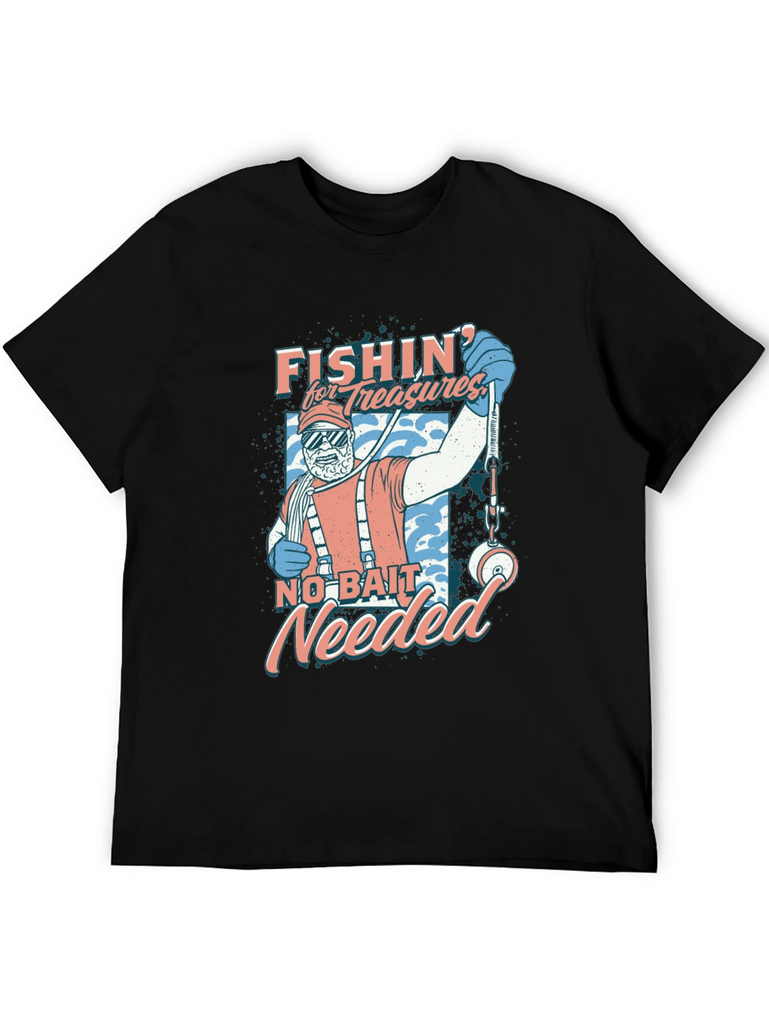 Cast a line for laughs with this unique "Fishing for Treasures" t-shirt! Featuring a cartoon fisherman sporting a hat and sunglasses, this tee is perfect for anyone who loves a good pun and the thrill of the find. The design also includes the witty text "NO BAIT Needed," adding a humorous twist to the classic fishing theme. Made from comfortable, breathable fabric, this tee is ideal for everyday wear. Whether you're heading out on the water, hanging out with friends, or just relaxing at home, this shirt is sure to spark conversation and show off your fun-loving personality. Get yours today and start fishing for compliments!