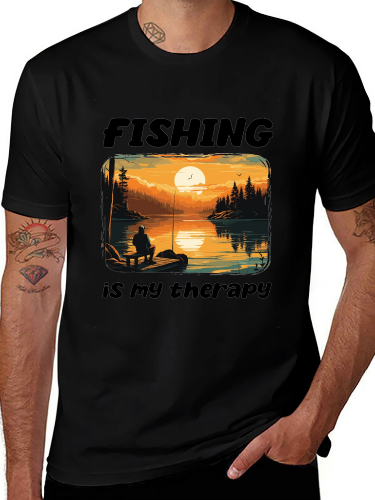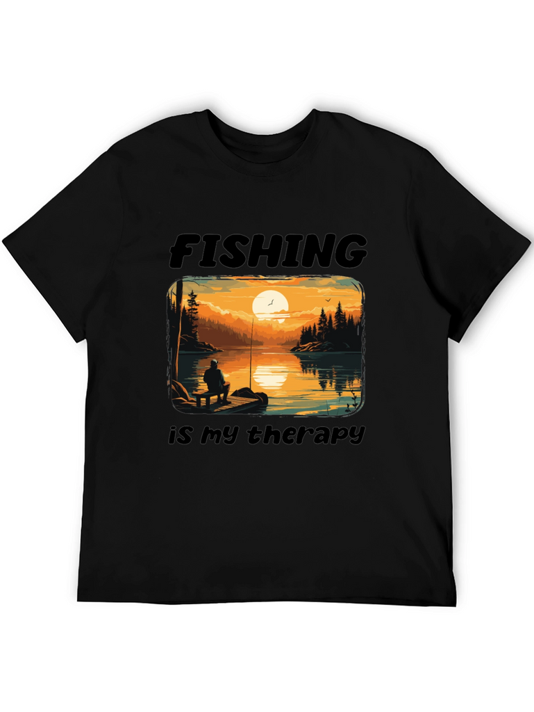This black graphic T-shirt features an image of someone fishing at sunset. The colorful scene showcases a serene lake surrounded by trees and mountains, with the words "FISHING is my therapy" printed above and below the image. The design is eye-catching and perfect for anyone who loves fishing and the outdoors. This tee offers a comfortable fit and can be worn casually or dressed up with a jacket. Show off your passion for fishing with this unique and stylish T-shirt. It makes a great gift for any fishing enthusiast. It is comfortable to wear on any fishing trip.