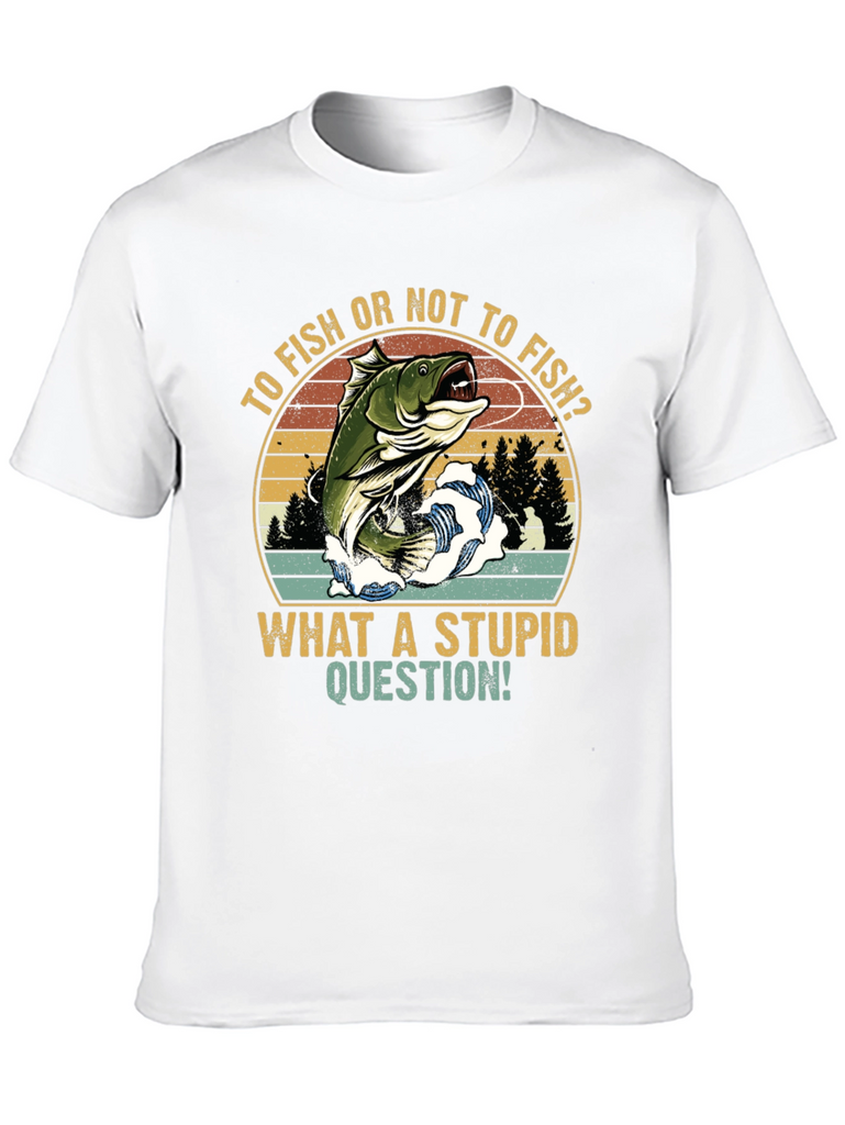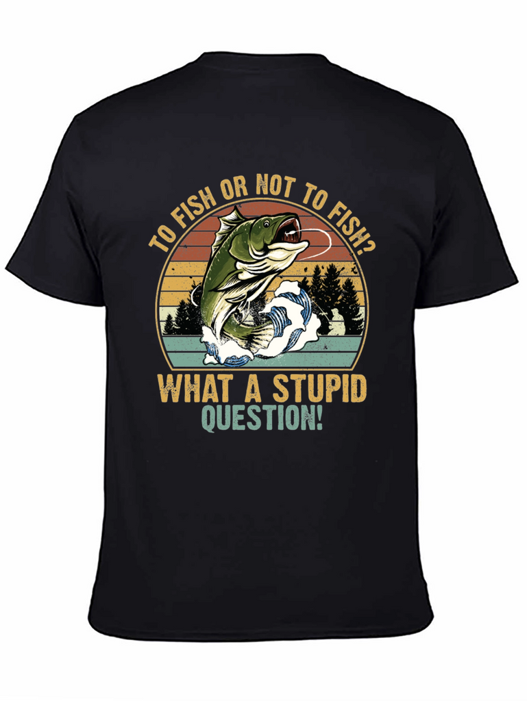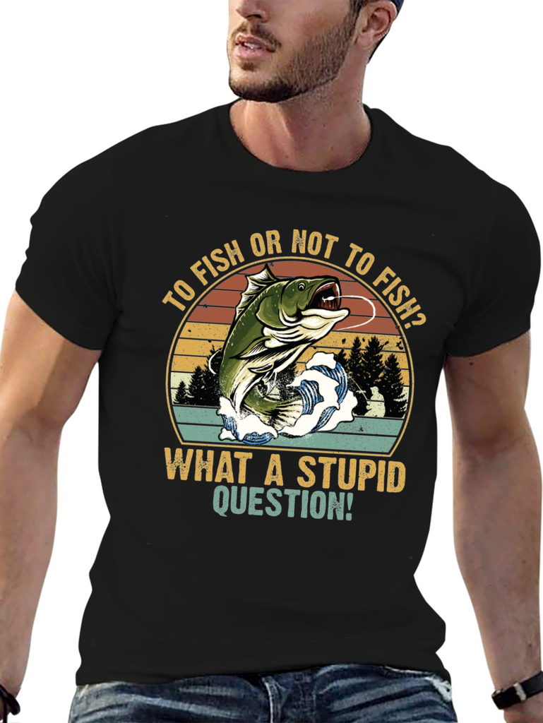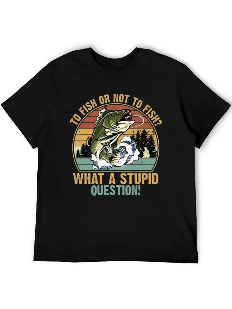 Reel in some laughs with this eye-catching black t-shirt featuring a bold graphic design! This shirt showcases a leaping fish against a retro sunset backdrop, framed by the humorous text "TO FISH OR NOT TO FISH? WHAT A STUPID QUESTION!" in a distressed font. The shirt is made from what appears to be comfortable, breathable cotton, perfect for casual wear or a day out on the lake. This t-shirt is ideal for fishing enthusiasts with a sense of humor, guaranteed to spark conversations and turn heads. A must-have addition to any angler's wardrobe!