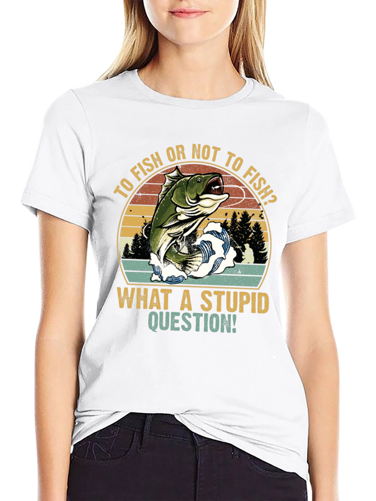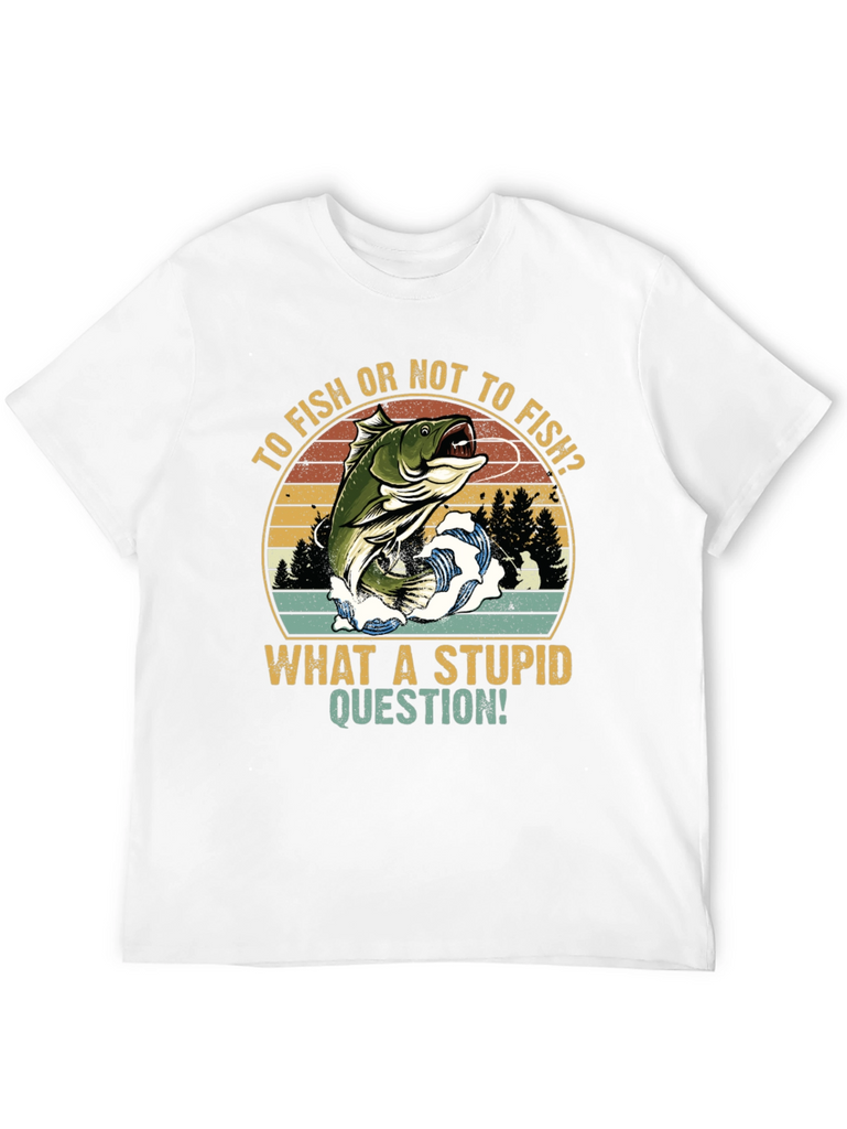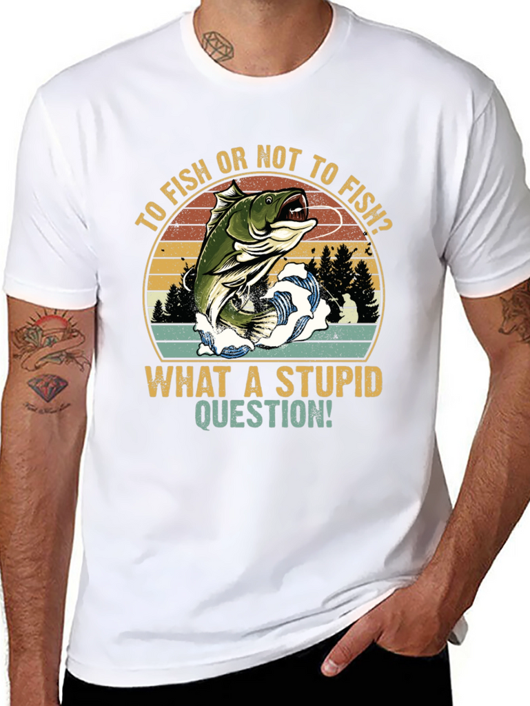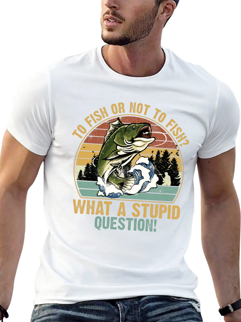 Reel in some laughs with this eye-catching black t-shirt featuring a bold graphic design! This shirt showcases a leaping fish against a retro sunset backdrop, framed by the humorous text "TO FISH OR NOT TO FISH? WHAT A STUPID QUESTION!" in a distressed font. The shirt is made from what appears to be comfortable, breathable cotton, perfect for casual wear or a day out on the lake. This t-shirt is ideal for fishing enthusiasts with a sense of humor, guaranteed to spark conversations and turn heads. A must-have addition to any angler's wardrobe!