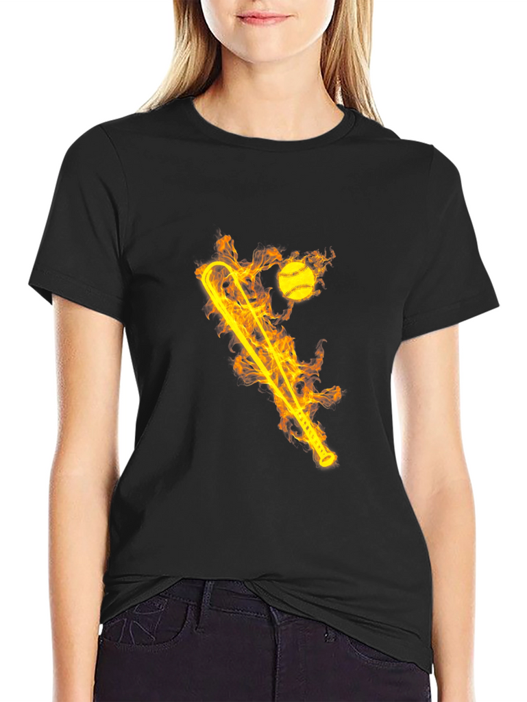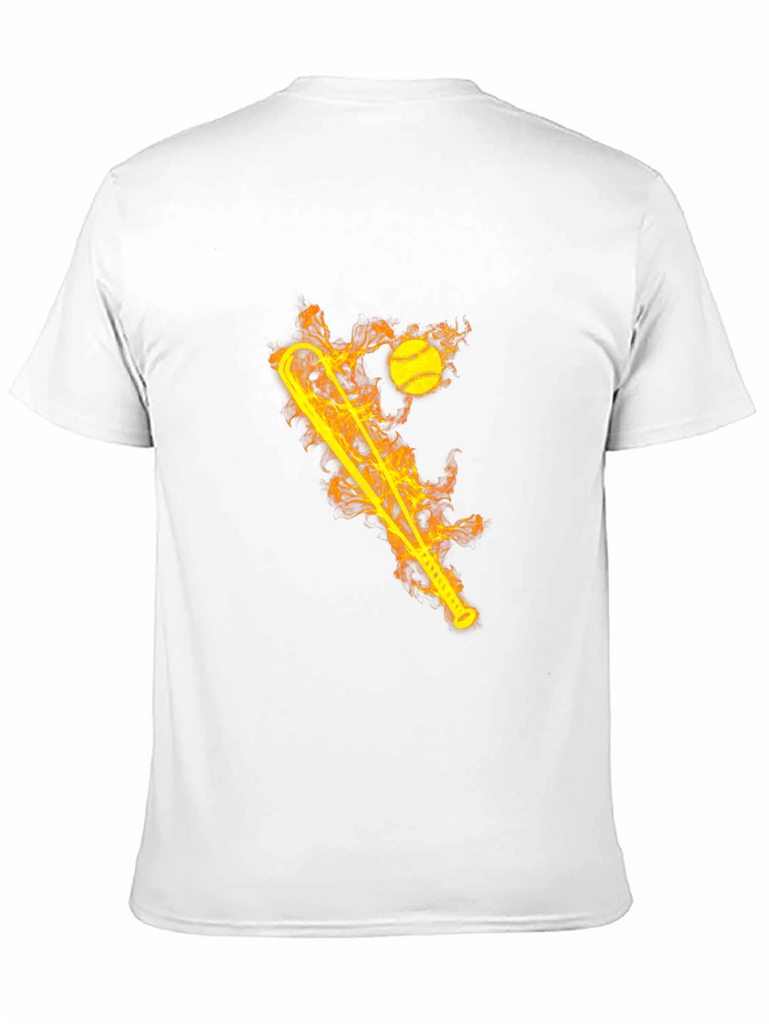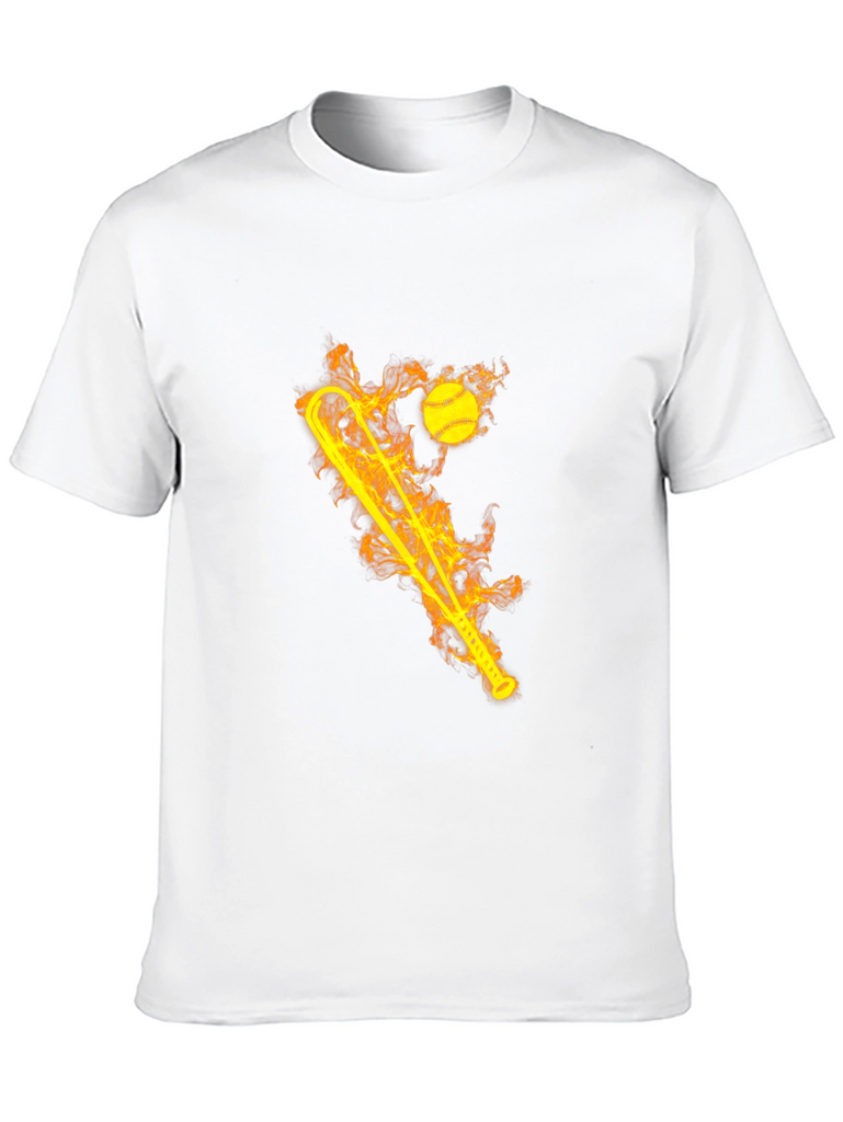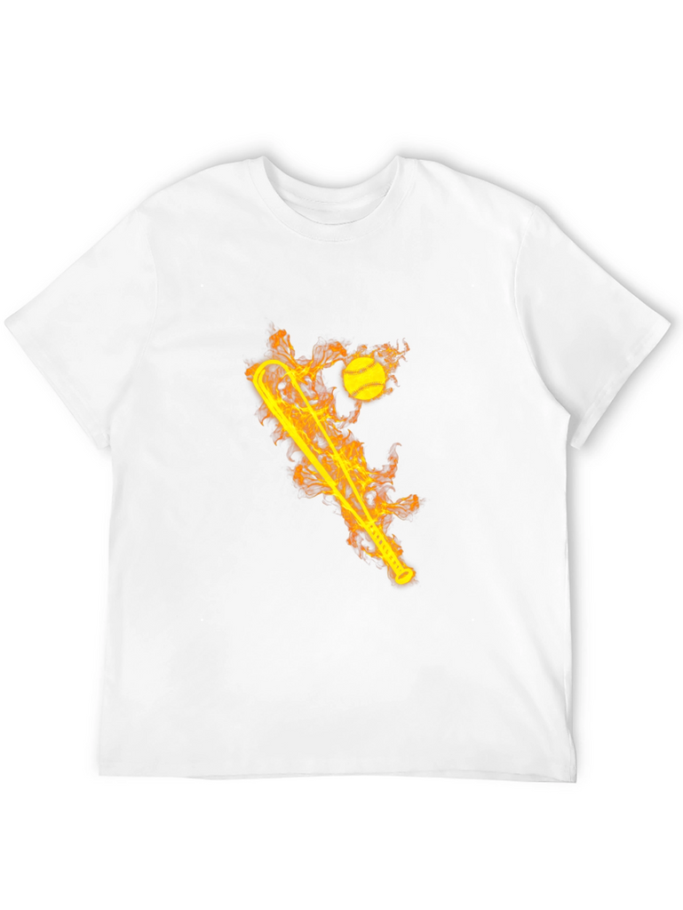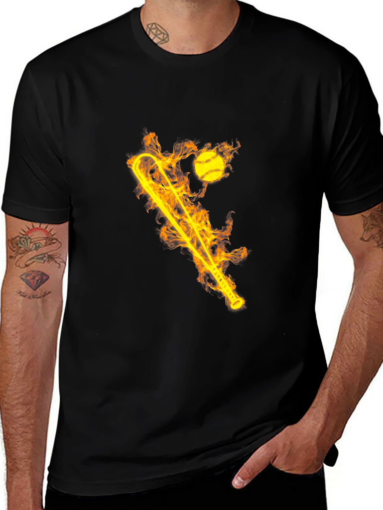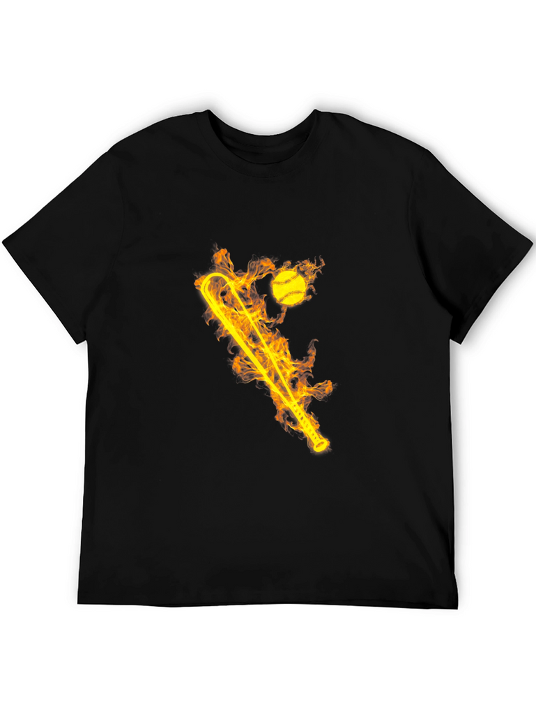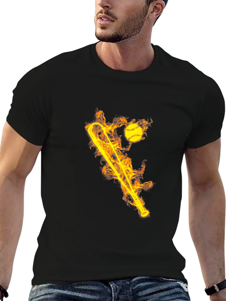 Ignite your style with this striking black graphic tee! The shirt features a bold, flaming design of a baseball bat and ball. The fiery graphic creates a dynamic and eye-catching look. Made from comfortable, breathable fabric, this t-shirt is perfect for everyday wear or for showing off your love of baseball. Whether you're hitting the ballpark or just hanging out with friends, this tee will keep you cool and comfortable. Makes a great gift for sports fans and anyone who loves unique designs. Add some heat to your wardrobe today!