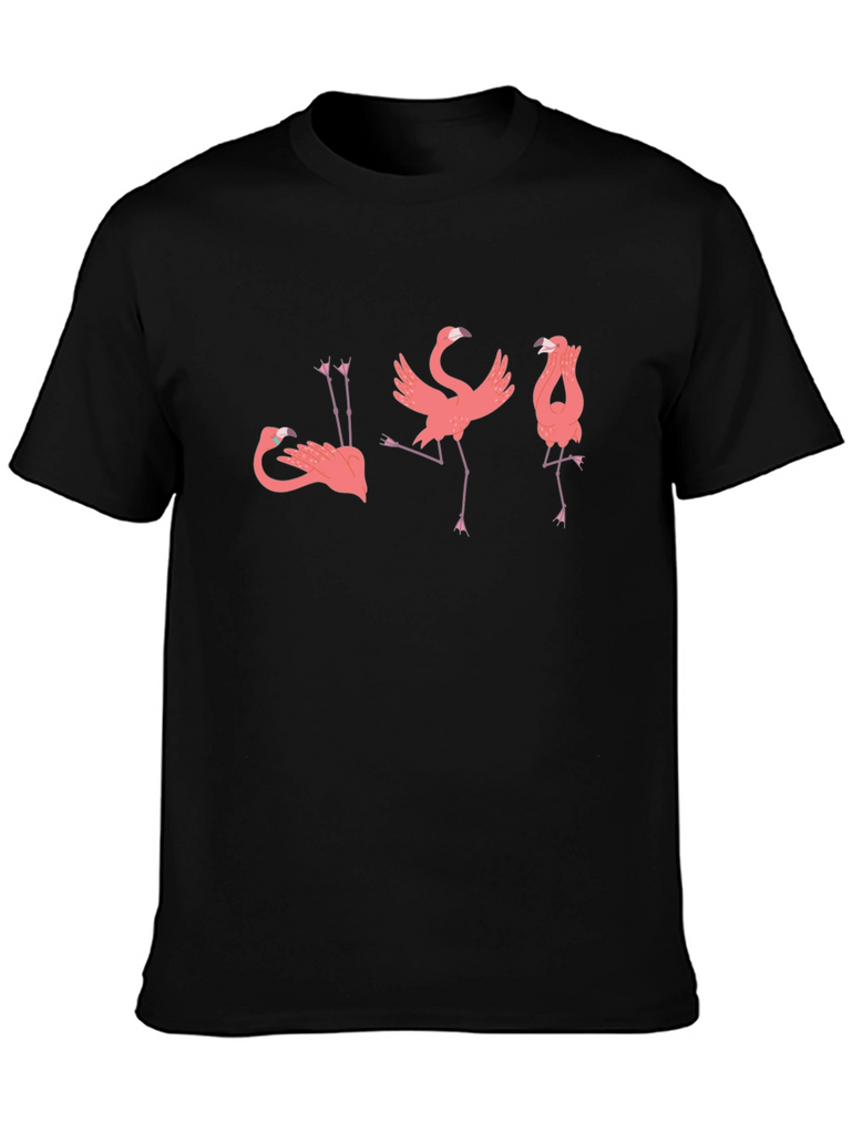 Flaunt your quirky side with this eye-catching black t-shirt! This comfortable tee features a playful design of three pink flamingos striking various yoga poses. Made from what appears to be a soft and breathable fabric, this shirt offers both style and comfort. The classic crew neck and short sleeves make it a versatile choice for casual wear. Ideal for yoga enthusiasts, flamingo lovers, or anyone with a fun sense of humor, this t-shirt is sure to turn heads and spark conversation. Wear it to your next yoga class, a casual outing with friends, or simply while relaxing at home. Add a touch of whimsical charm to your wardrobe with this unique piece!