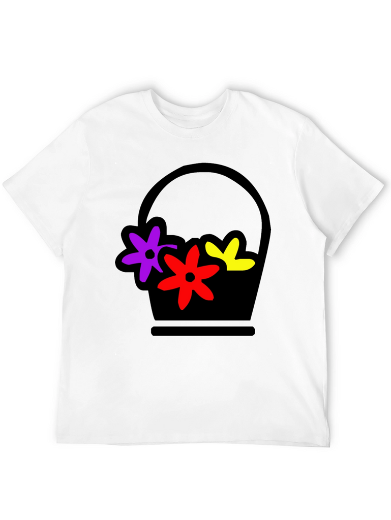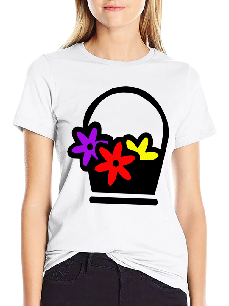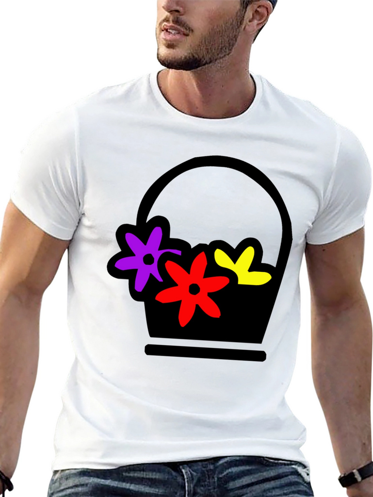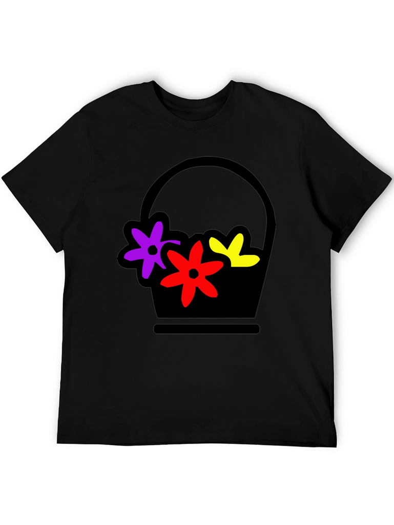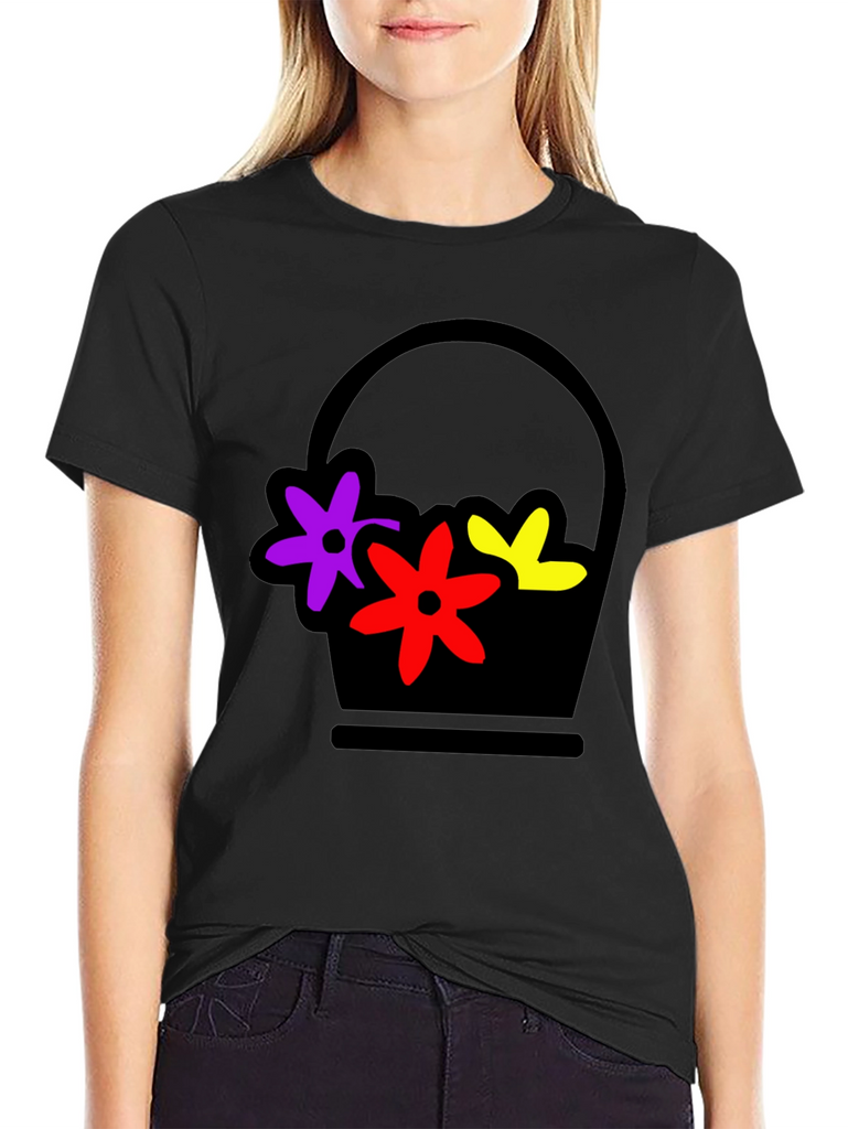 This stylish black T-shirt features a unique graphic design of a basket filled with colorful flowers. The bold black outline of the basket contrasts beautifully with the vibrant purple, red, and yellow flowers, creating a striking visual effect. Made from a soft, comfortable fabric, this tee is perfect for everyday wear. Its classic fit ensures a relaxed and flattering silhouette. Whether you're heading to a casual outing or just lounging at home, this T-shirt adds a pop of color and personality to your wardrobe. A great way to express your love for nature and art!