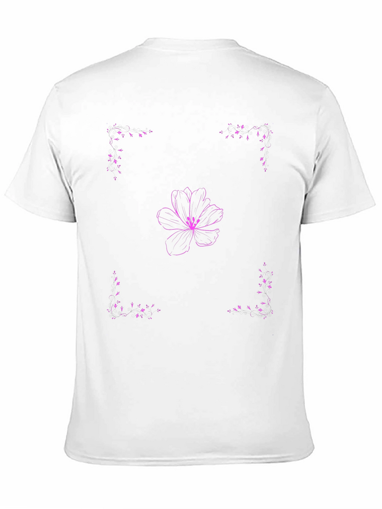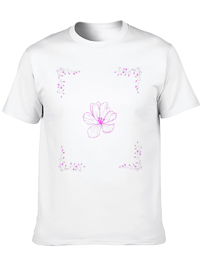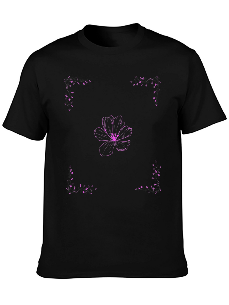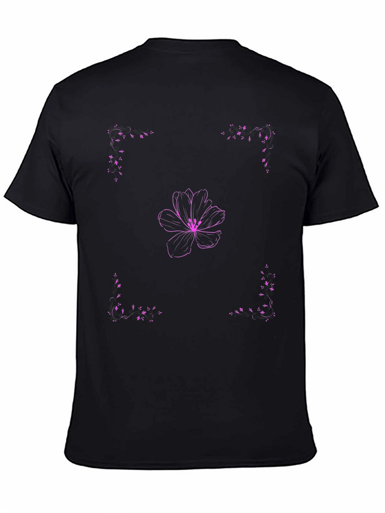 This classic black T-shirt features a unique and eye-catching floral design. A large pink flower is centered, with smaller floral elements arranged in each corner. The design offers a touch of delicate style to this versatile wardrobe staple. Made from a soft, comfortable material, this T-shirt is perfect for everyday wear. Its relaxed fit makes it ideal for casual outings, workouts, or simply lounging at home. Pair it with jeans, shorts, or even a skirt for a stylish and effortless look. Dress it up with a blazer or keep it casual with your favorite sneakers.