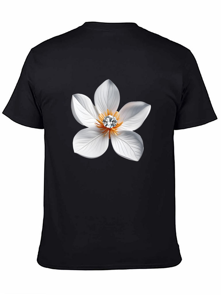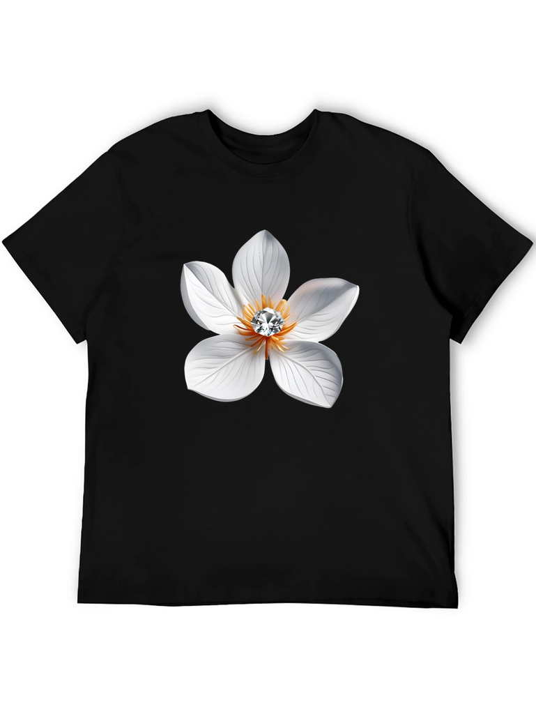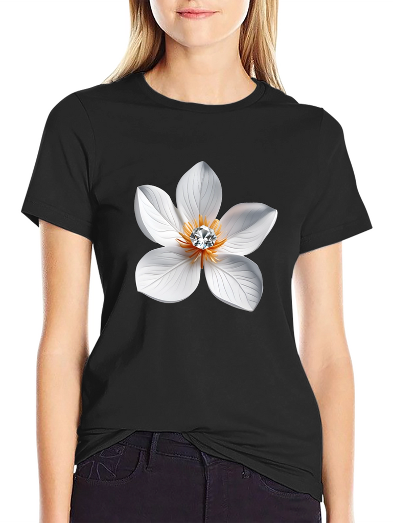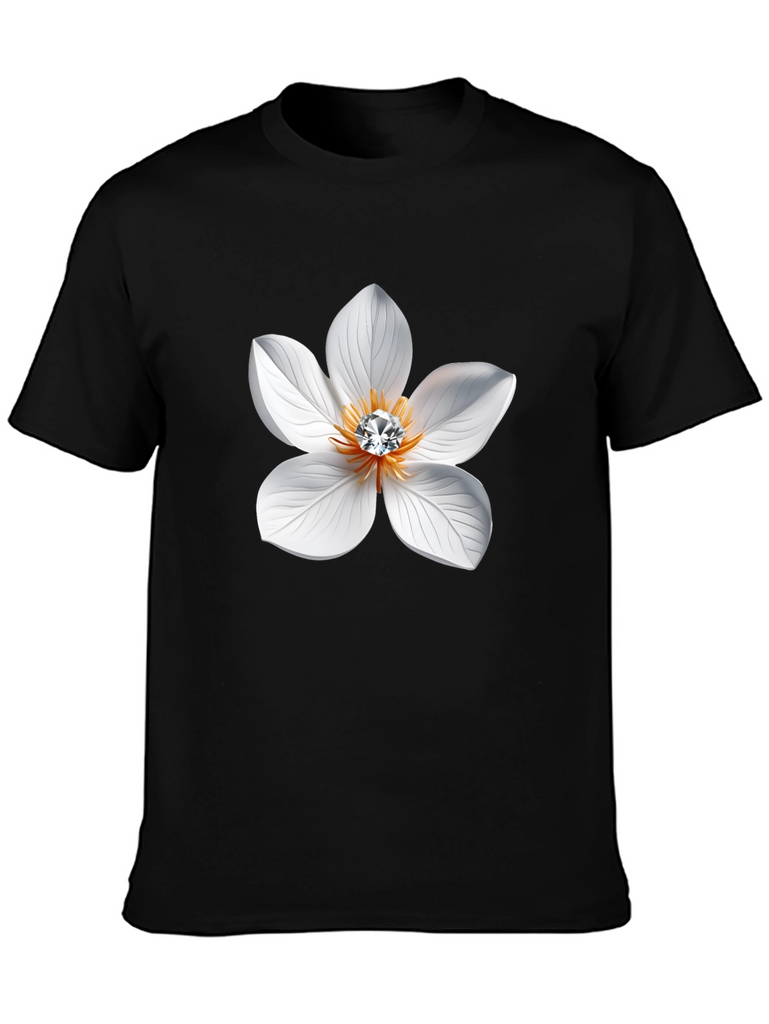 Elevate your casual wardrobe with this sophisticated black t-shirt. The shirt features a striking graphic of a white flower with a gemstone center, adding a touch of elegance to your everyday look. Made from comfortable material, this tee offers a relaxed fit, perfect for all-day wear. Whether you're heading out for a casual brunch, running errands, or simply relaxing at home, this t-shirt effortlessly combines style and comfort. The unique floral design is sure to turn heads and make a statement. A great choice for those who appreciate understated elegance.