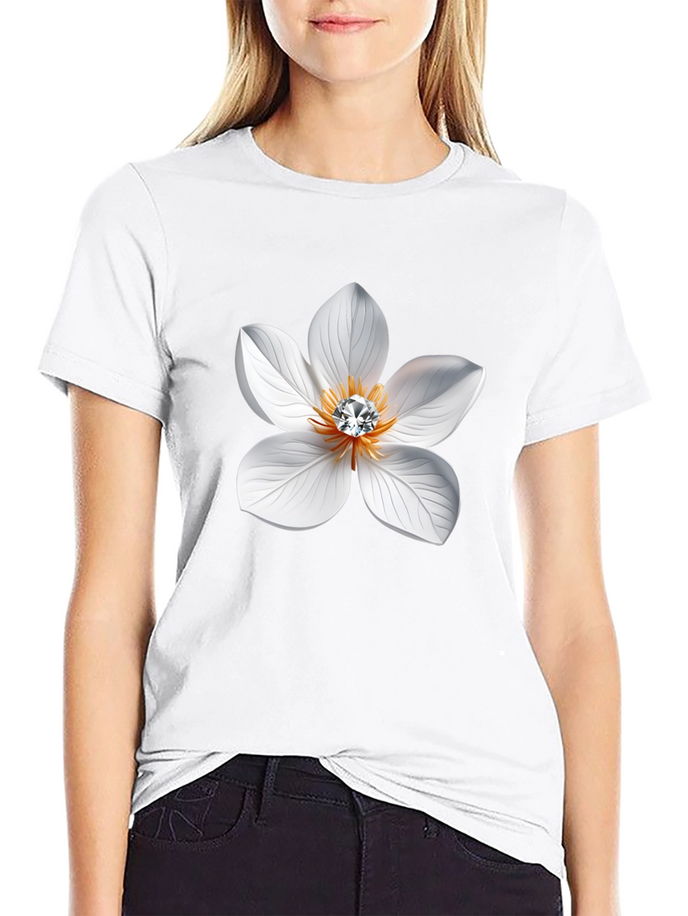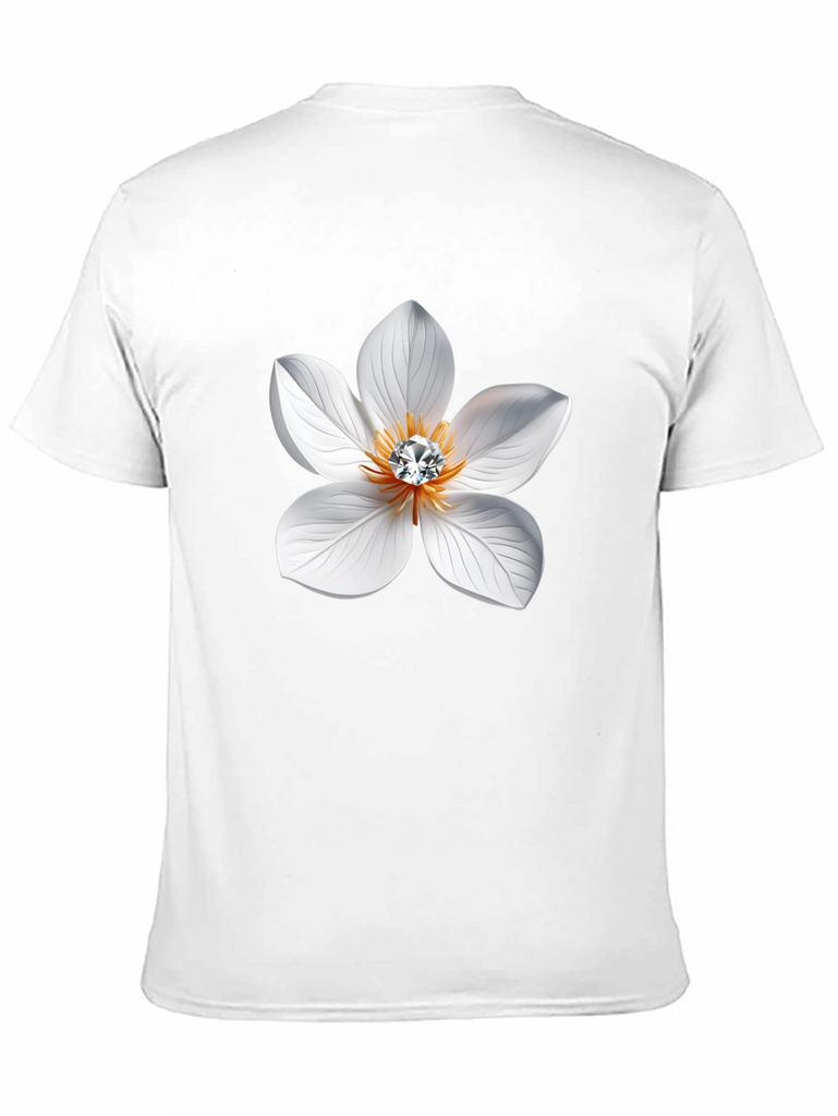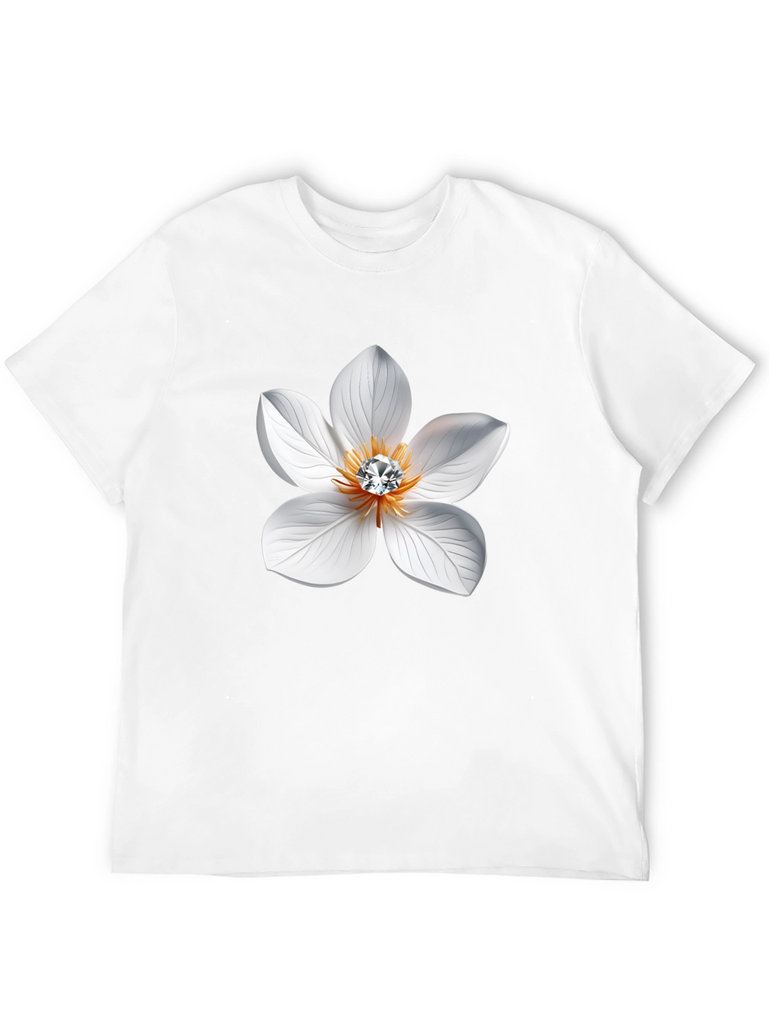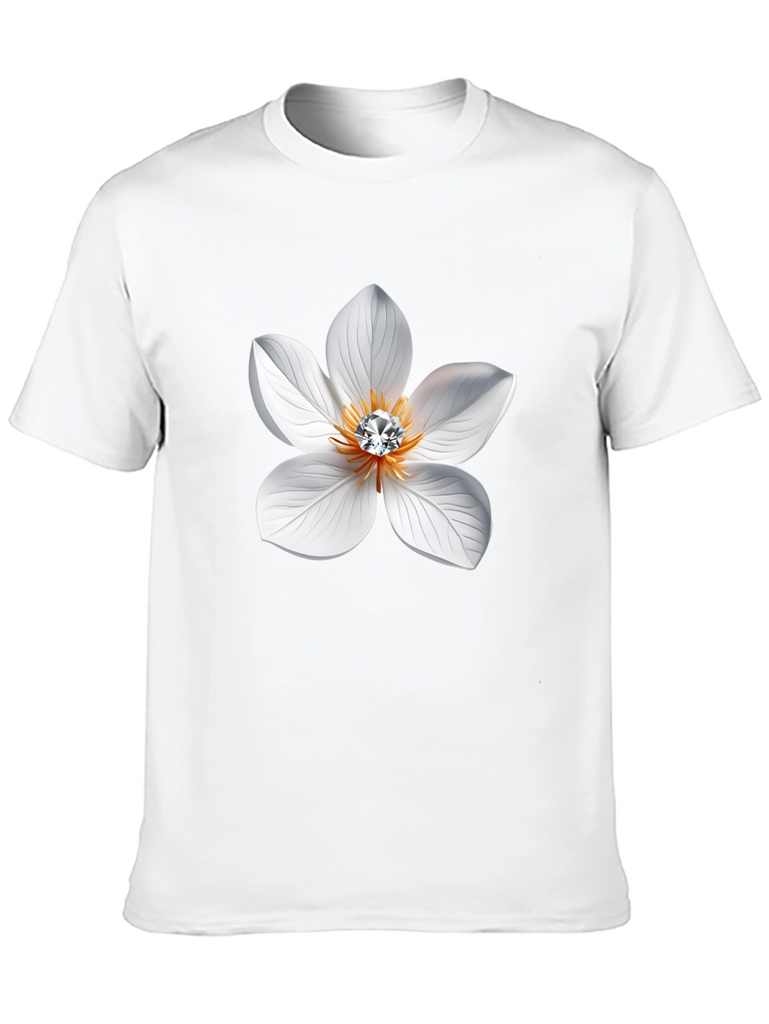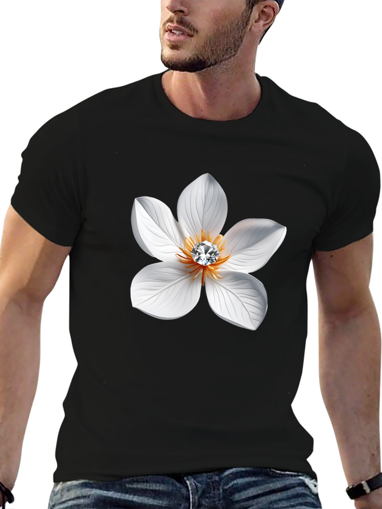 Elevate your casual wardrobe with this sophisticated black t-shirt. The shirt features a striking graphic of a white flower with a gemstone center, adding a touch of elegance to your everyday look. Made from comfortable material, this tee offers a relaxed fit, perfect for all-day wear. Whether you're heading out for a casual brunch, running errands, or simply relaxing at home, this t-shirt effortlessly combines style and comfort. The unique floral design is sure to turn heads and make a statement. A great choice for those who appreciate understated elegance.