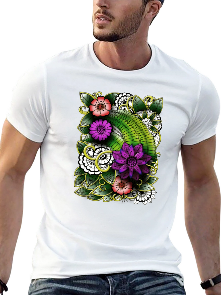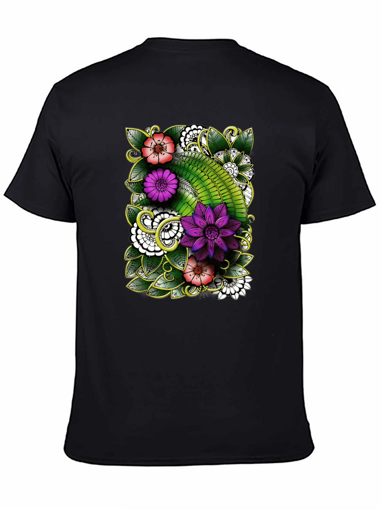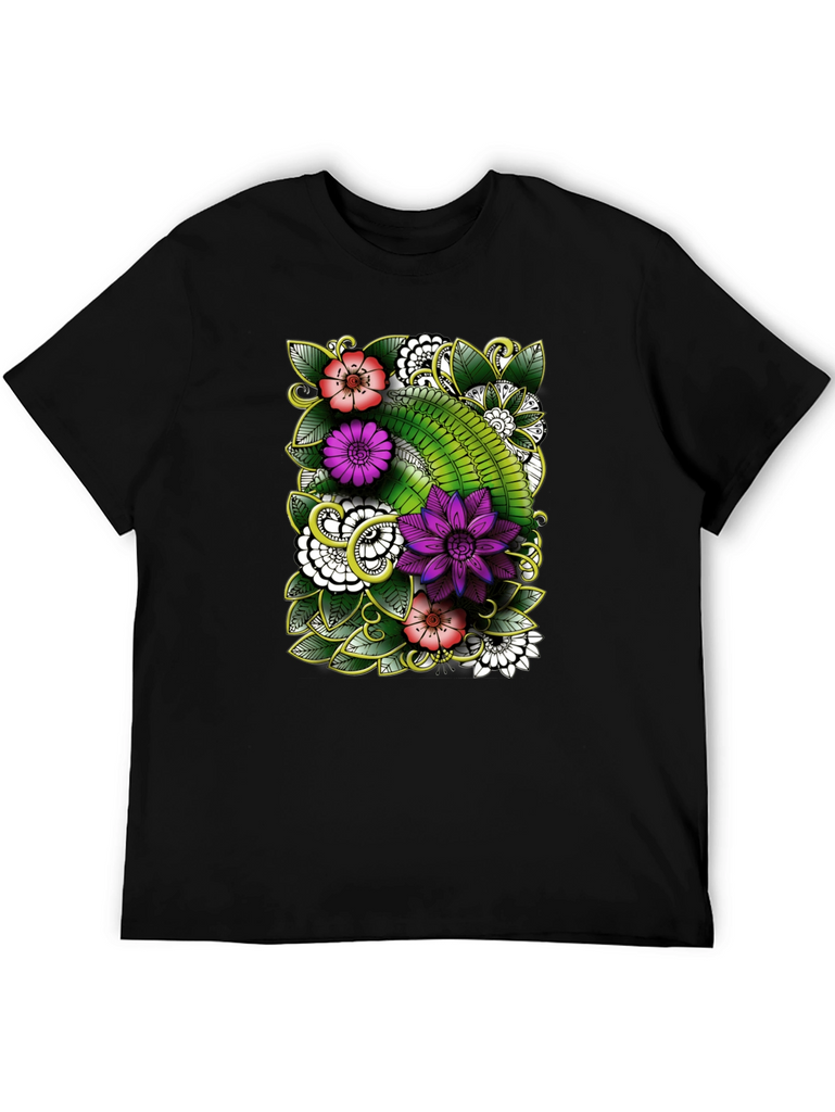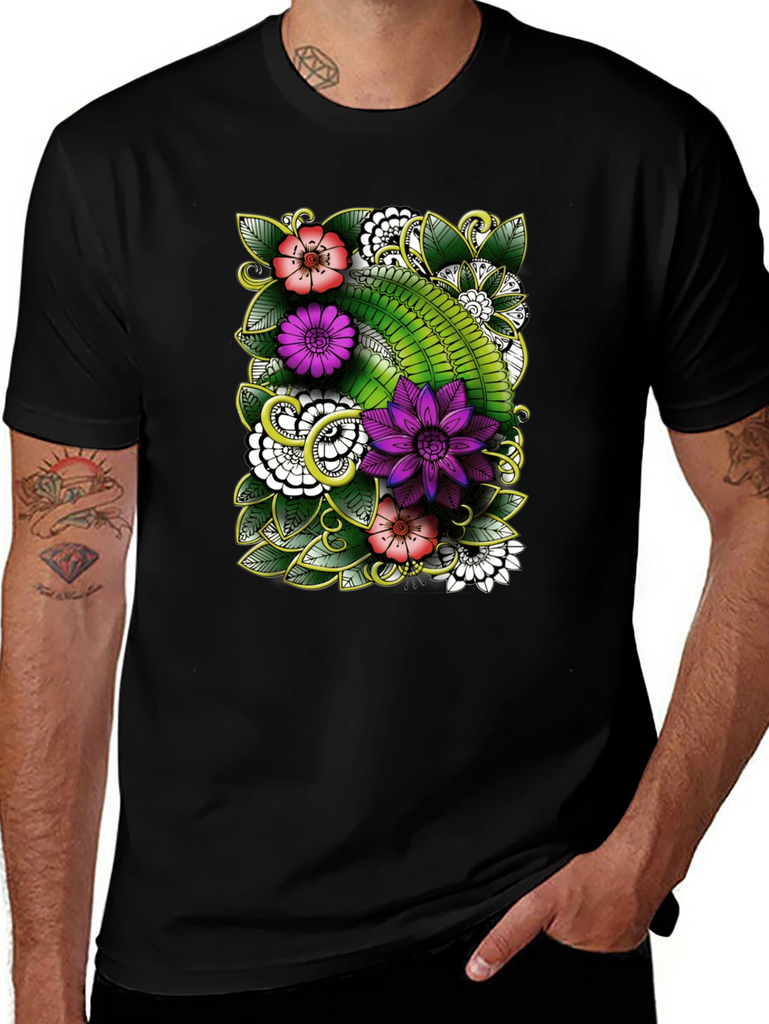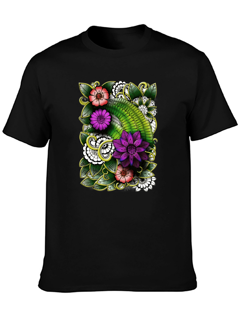This stylish men's black t-shirt features a vibrant and intricate floral pattern. The design showcases a blend of colorful blooms and verdant leaves, creating an eye-catching and artistic aesthetic. The print appears to be high-quality, suggesting durability and longevity. The shirt itself is a classic crew neck style, likely made from a comfortable and breathable fabric perfect for everyday wear. This t-shirt is ideal for adding a touch of personality and flair to any casual outfit. Dress it up with a jacket or wear it on its own for a relaxed, trendy look.