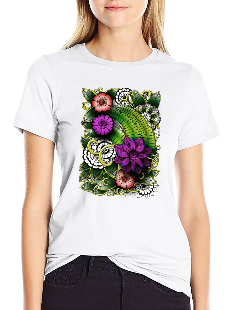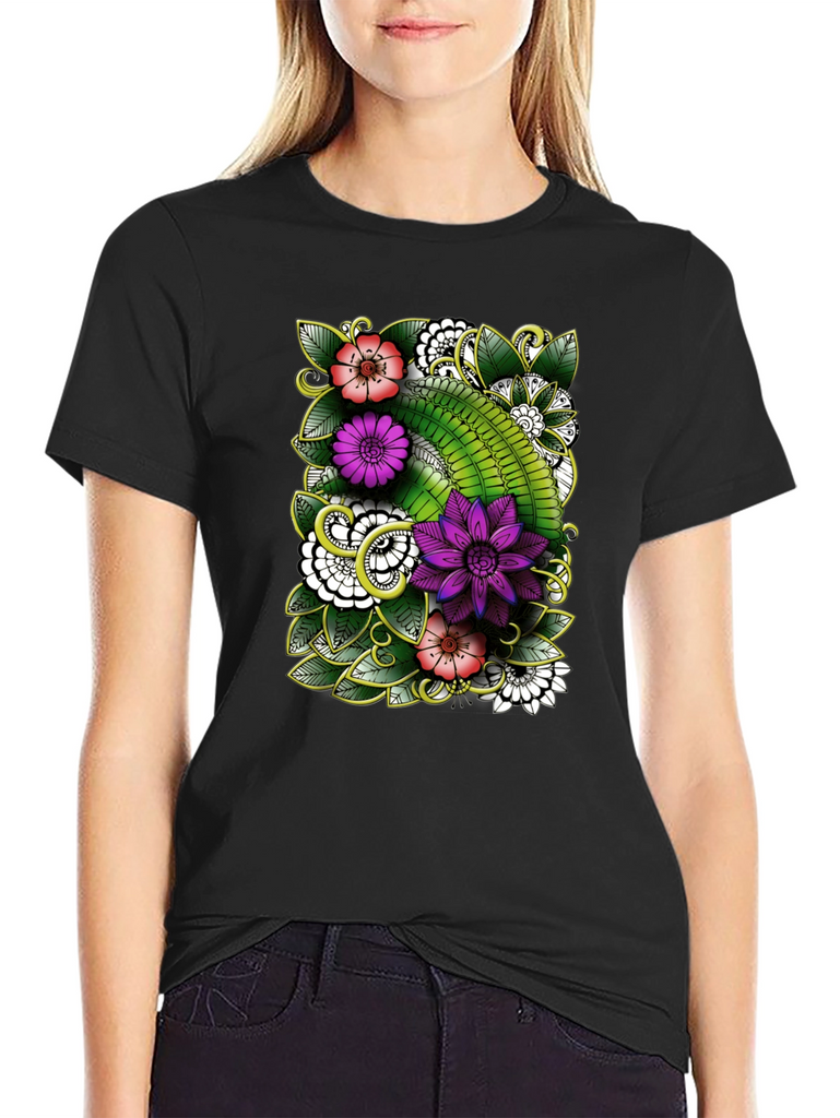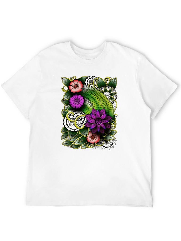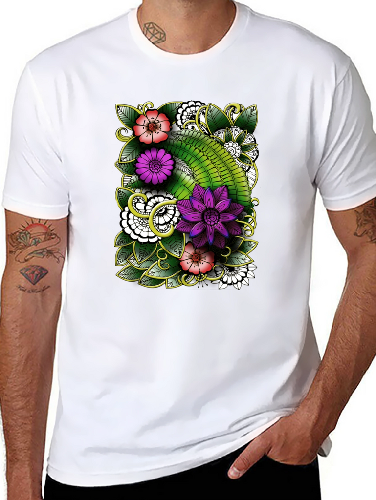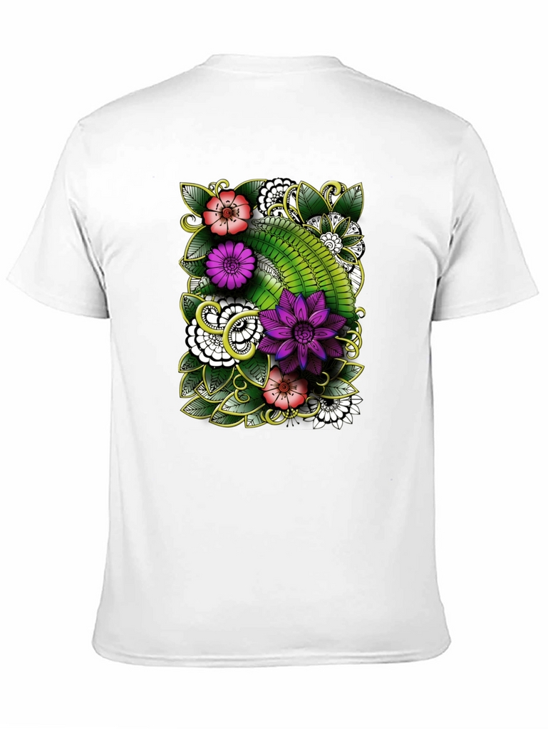 This stylish men's black t-shirt features a vibrant and intricate floral pattern. The design showcases a blend of colorful blooms and verdant leaves, creating an eye-catching and artistic aesthetic. The print appears to be high-quality, suggesting durability and longevity. The shirt itself is a classic crew neck style, likely made from a comfortable and breathable fabric perfect for everyday wear. This t-shirt is ideal for adding a touch of personality and flair to any casual outfit. Dress it up with a jacket or wear it on its own for a relaxed, trendy look.