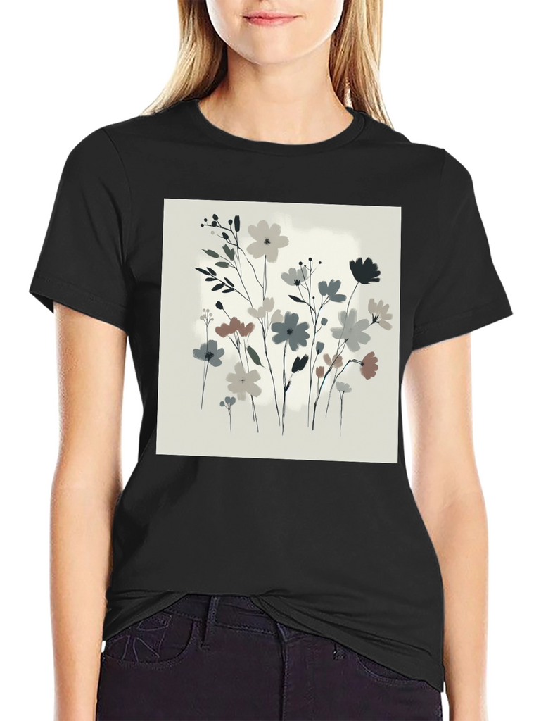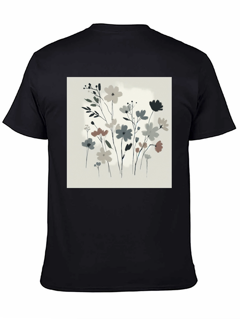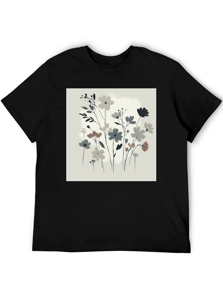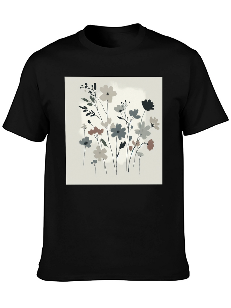Elevate your casual wardrobe with this stylish black t-shirt featuring a delicate floral design. The t-shirt showcases an array of pastel flowers and foliage, creating an elegant and artistic visual appeal. The neutral color palette makes it versatile for various outfits. Perfect for everyday wear, casual outings, or adding a touch of sophistication to your relaxed style. This comfortable and fashionable t-shirt is a must-have addition to any fashion-forward individual's collection. The design gives off a modern yet subtle vintage vibe.