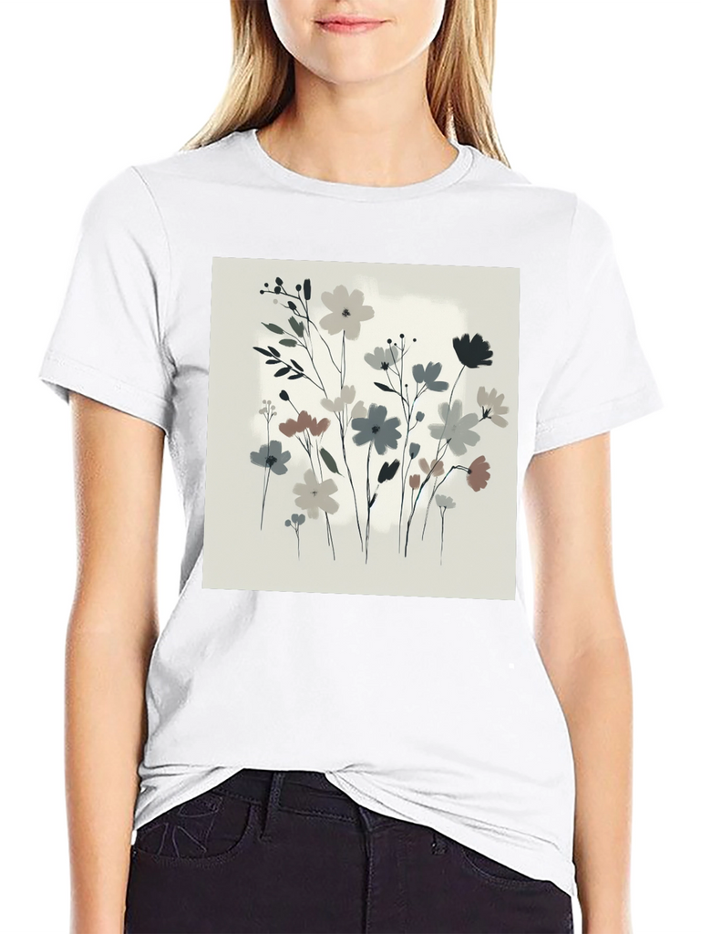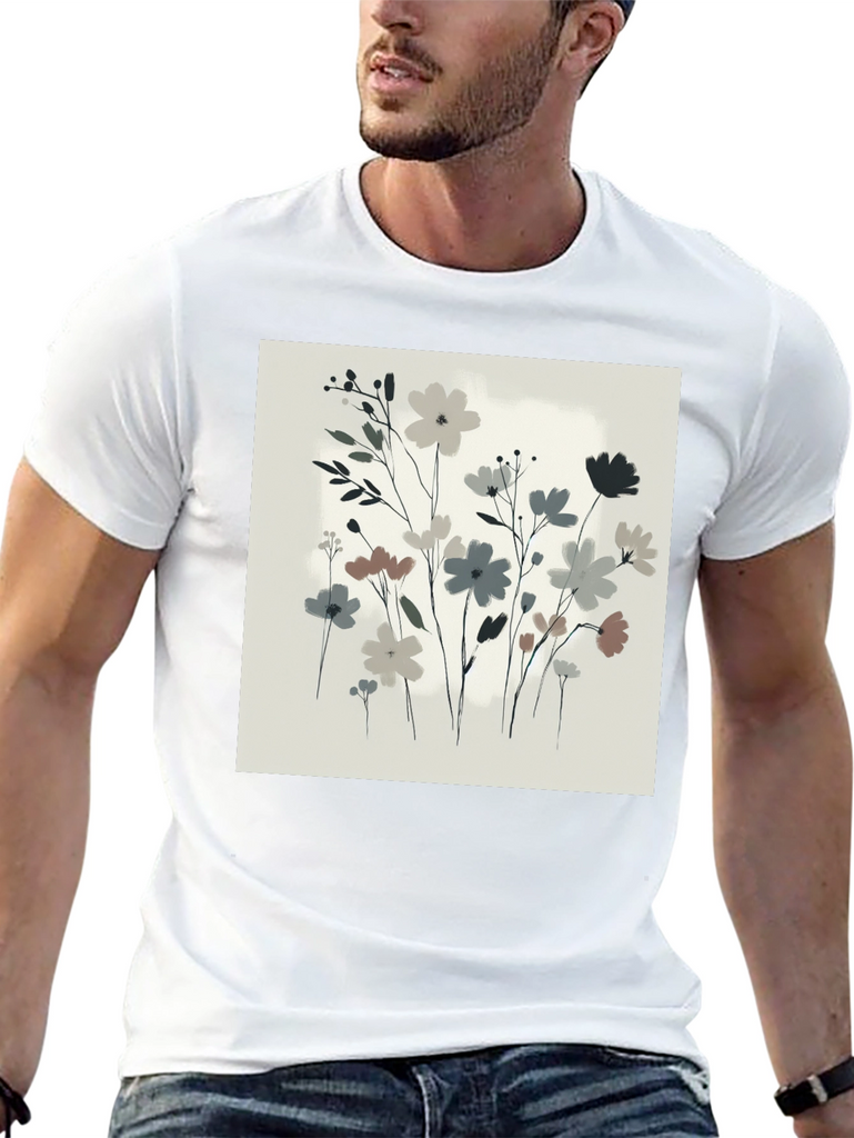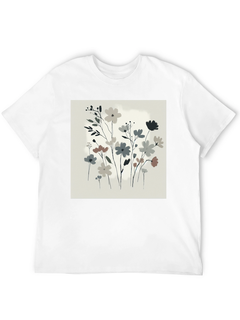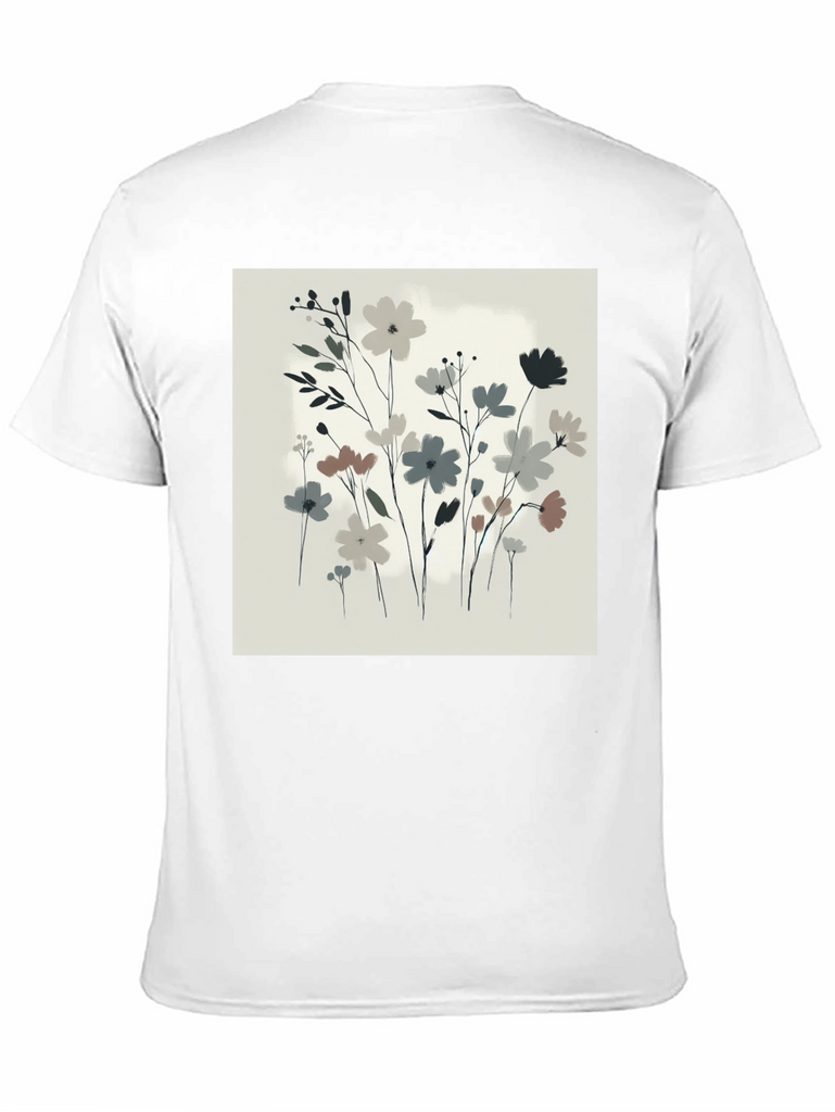 Elevate your casual wardrobe with this stylish black t-shirt featuring a delicate floral design. The t-shirt showcases an array of pastel flowers and foliage, creating an elegant and artistic visual appeal. The neutral color palette makes it versatile for various outfits. Perfect for everyday wear, casual outings, or adding a touch of sophistication to your relaxed style. This comfortable and fashionable t-shirt is a must-have addition to any fashion-forward individual's collection. The design gives off a modern yet subtle vintage vibe.