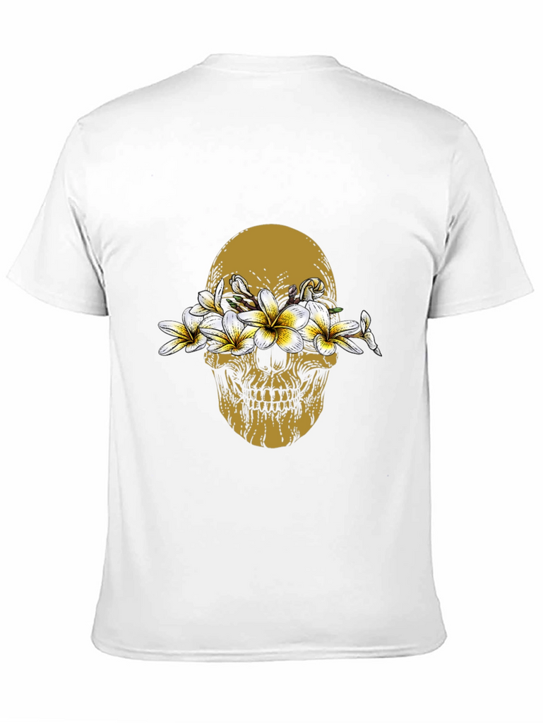 Show off your unique style with this eye-catching graphic tee. This black t-shirt features a striking design of a golden skull adorned with a delicate arrangement of white and yellow flowers. The intricate details of the skull and the soft contrast of the floral accents create a bold and artistic statement. Made from comfortable fabric, it's perfect for everyday wear, casual outings, or making a statement at your next social gathering. Pair it with jeans, shorts, or your favorite bottoms for a versatile and stylish look.