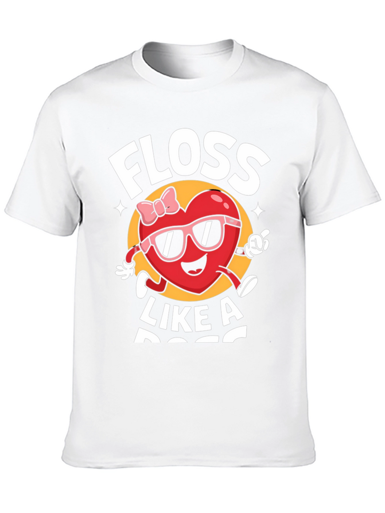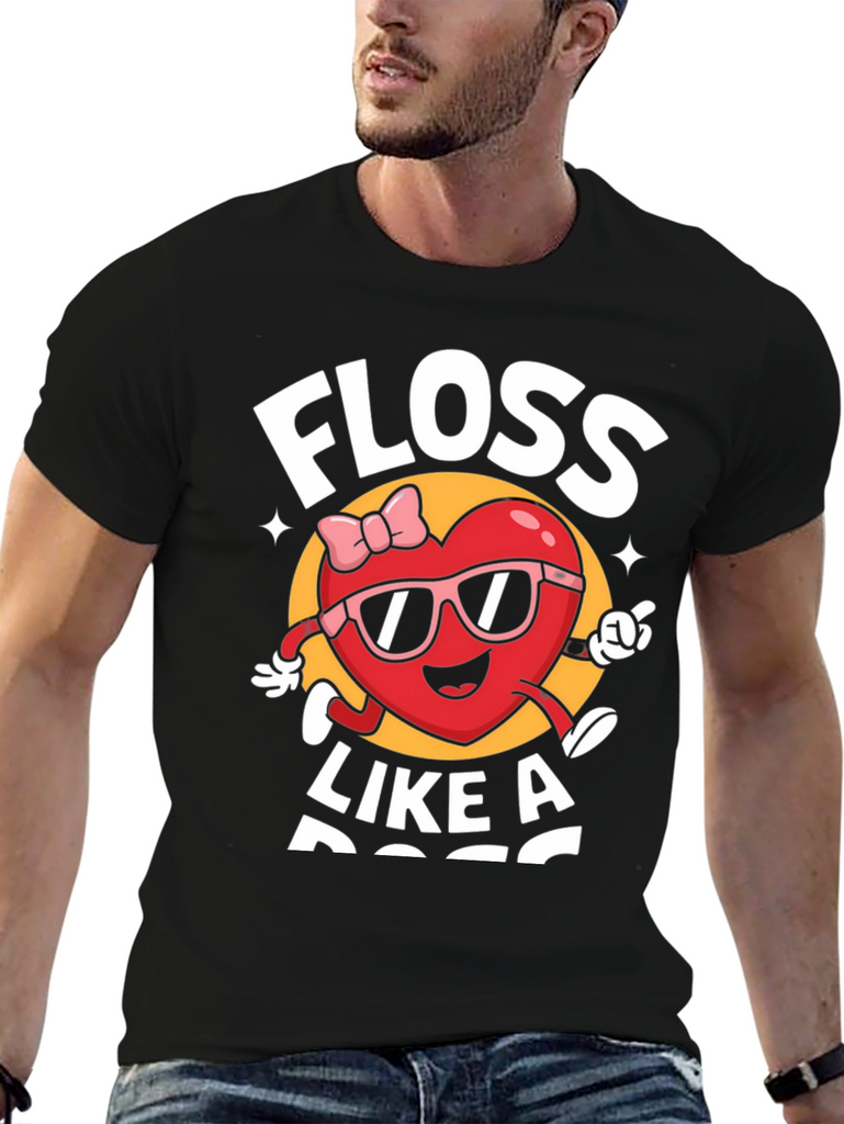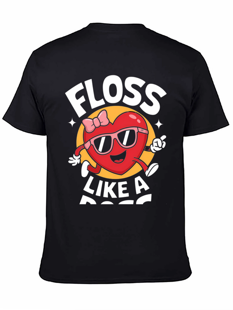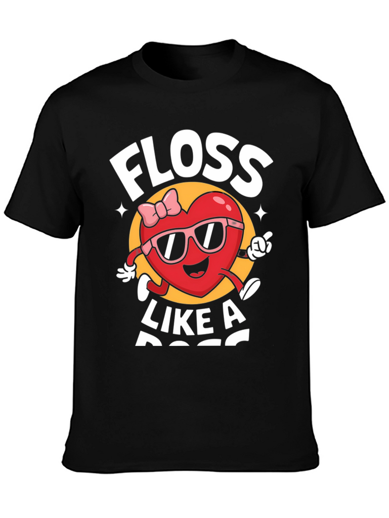 Show off your fun personality with this black graphic tee. Featuring a playful "Floss Like A Boss" design with a cartoon heart character wearing sunglasses and a bow, this shirt is sure to turn heads. Made from a soft, comfortable fabric, it's perfect for everyday wear. Whether you're hitting the streets or hanging out with friends, this tee is a stylish way to express your unique sense of humor. Add this must-have piece to your wardrobe today!