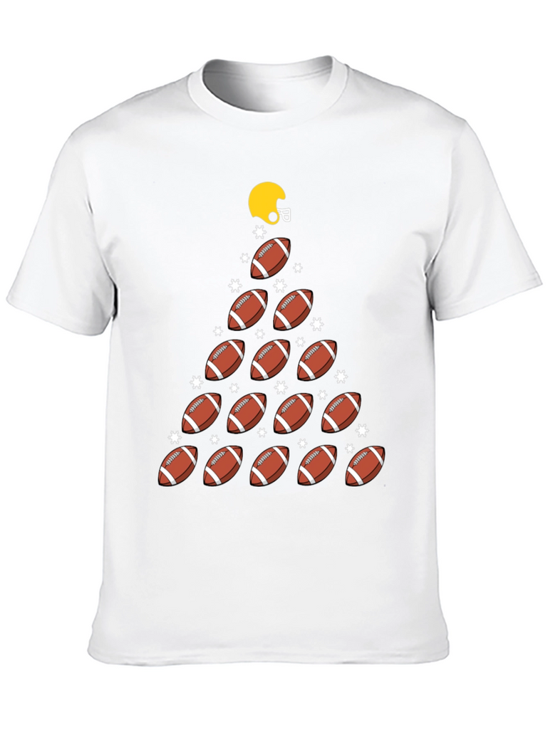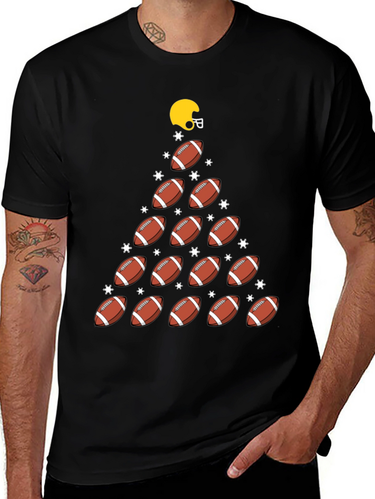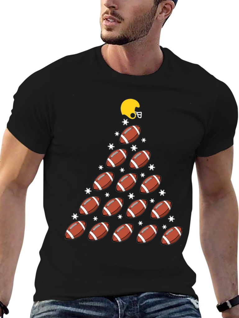 Get ready for the holidays with this fun and festive football-themed t-shirt! Made from a soft, comfortable black fabric, this tee features a unique Christmas tree design constructed from footballs and shimmering star accents. A bright yellow helmet tops the "tree", adding a playful touch. Perfect for football fans and holiday enthusiasts alike, this shirt is sure to be a hit at your next game day gathering or Christmas party. Show off your love for the game and the holiday season with this one-of-a-kind t-shirt!