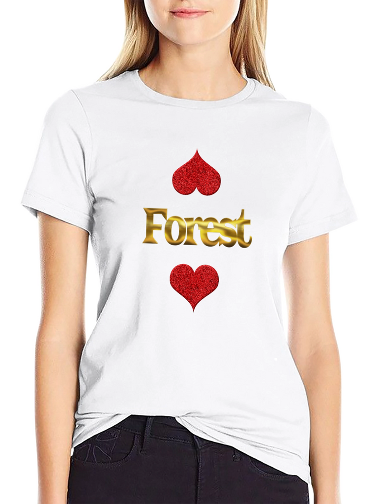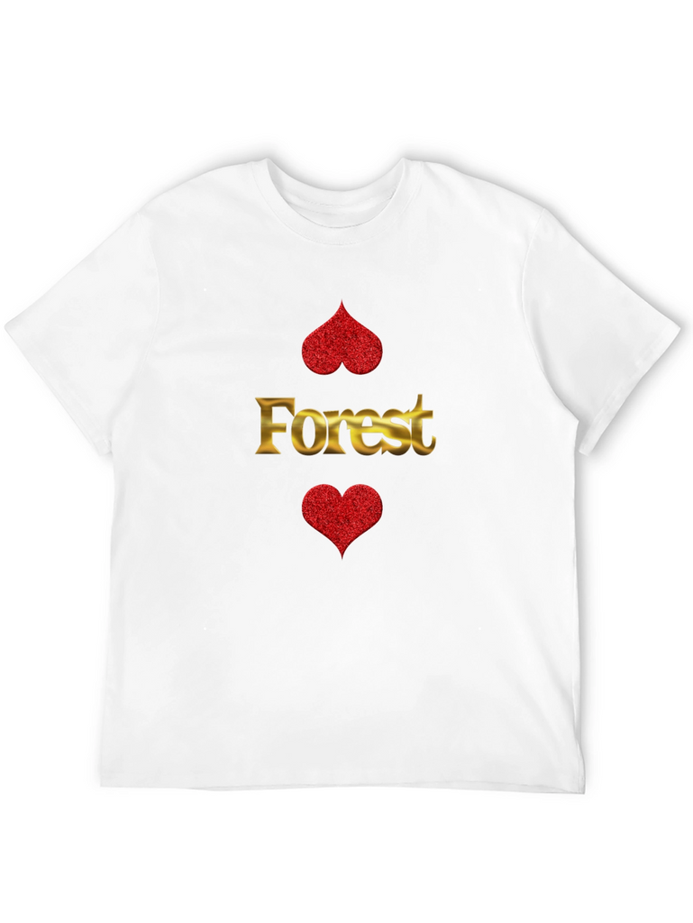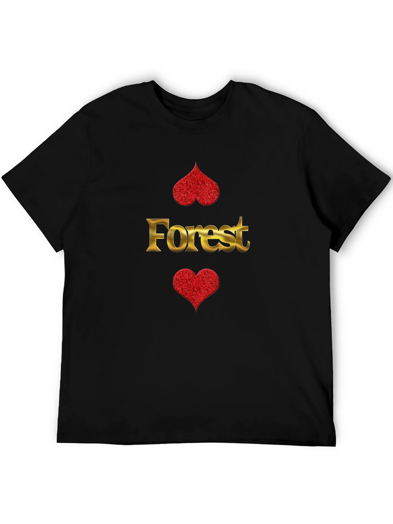 Show your love for nature with this unique black t-shirt. The shirt features a bold graphic with the golden word "Forest" between two red glitter hearts. The design is eye-catching and playful, making it a great conversation starter. Made from comfortable, breathable fabric, this tee is perfect for everyday wear. Dress it up with jeans and sneakers for a casual-cool look, or pair it with shorts for a relaxed weekend vibe. A must-have for anyone who appreciates stylish, nature-inspired apparel. Stand out from the crowd with this stylish and comfortable tee. Great gift idea for a friend or loved one!