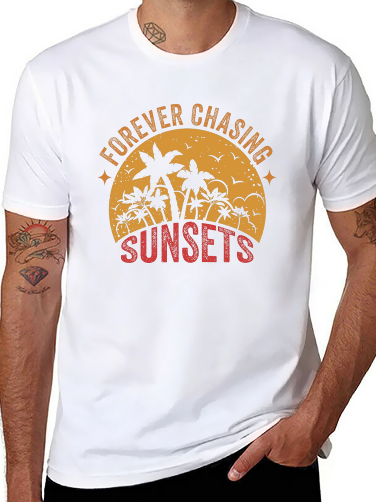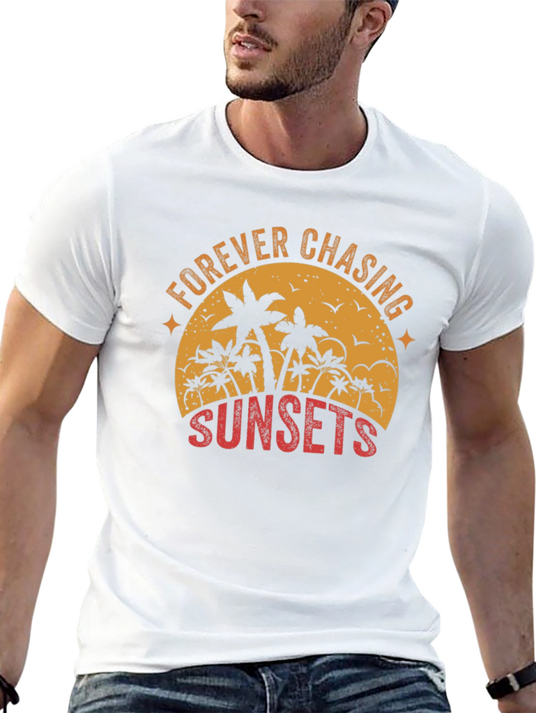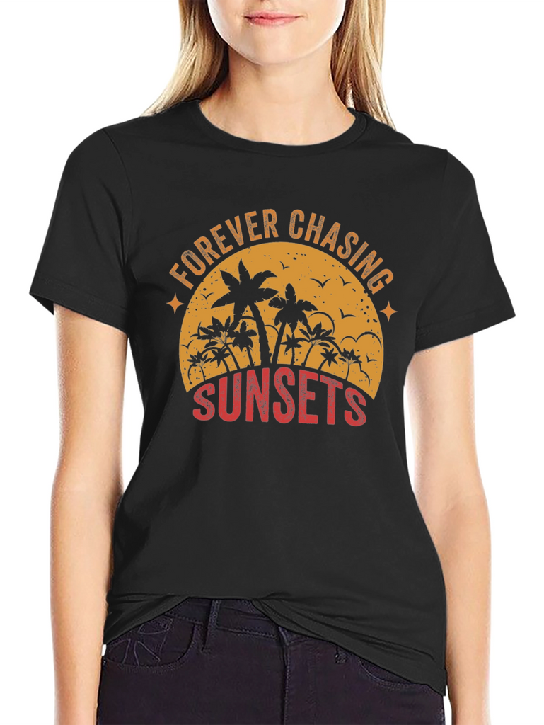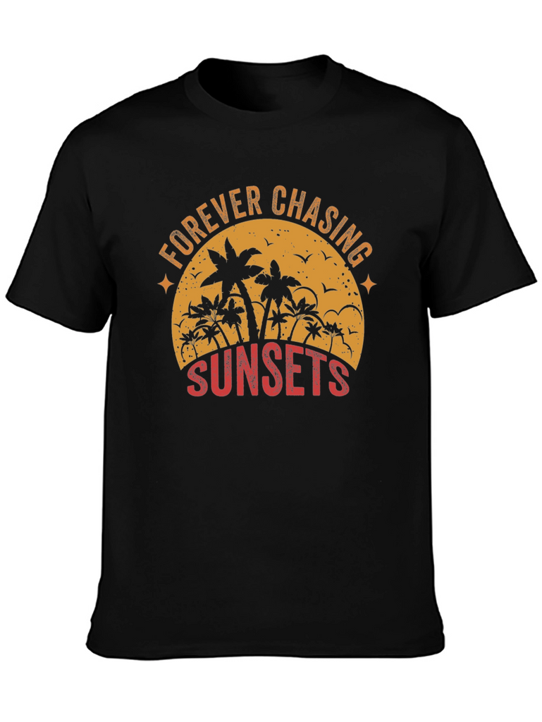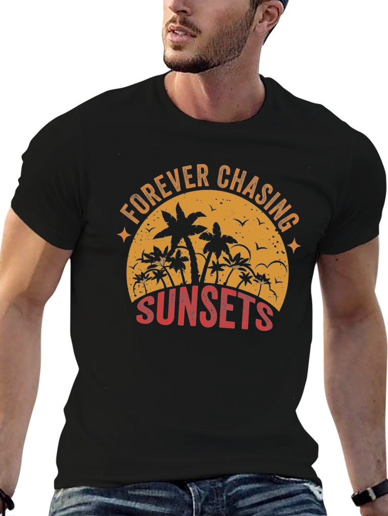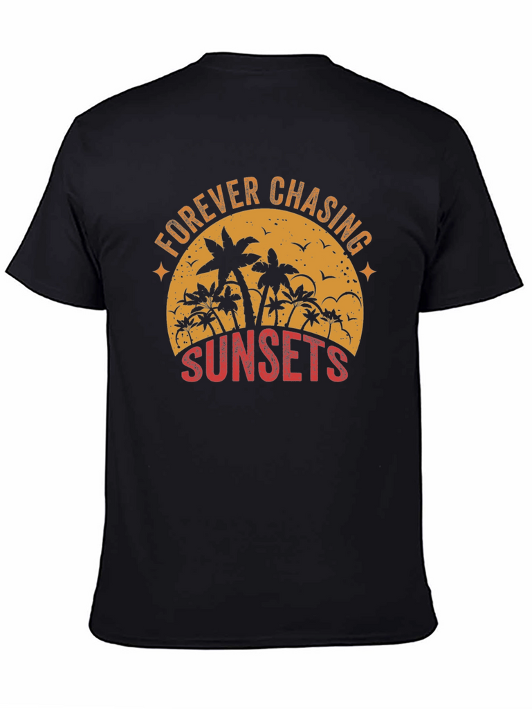 Embrace the wanderlust spirit with this stylish black graphic tee. The shirt features a captivating sunset-themed design with palm trees silhouetted against a vintage-style orange sun. The text 'FOREVER CHASING SUNSETS' is artistically arranged around the design, adding a touch of adventure to your wardrobe. Crafted from a comfortable and durable fabric, this tee is perfect for casual outings, beach days, or simply relaxing in style. Pair it with your favorite jeans or shorts for an effortlessly cool look that captures the essence of summer.