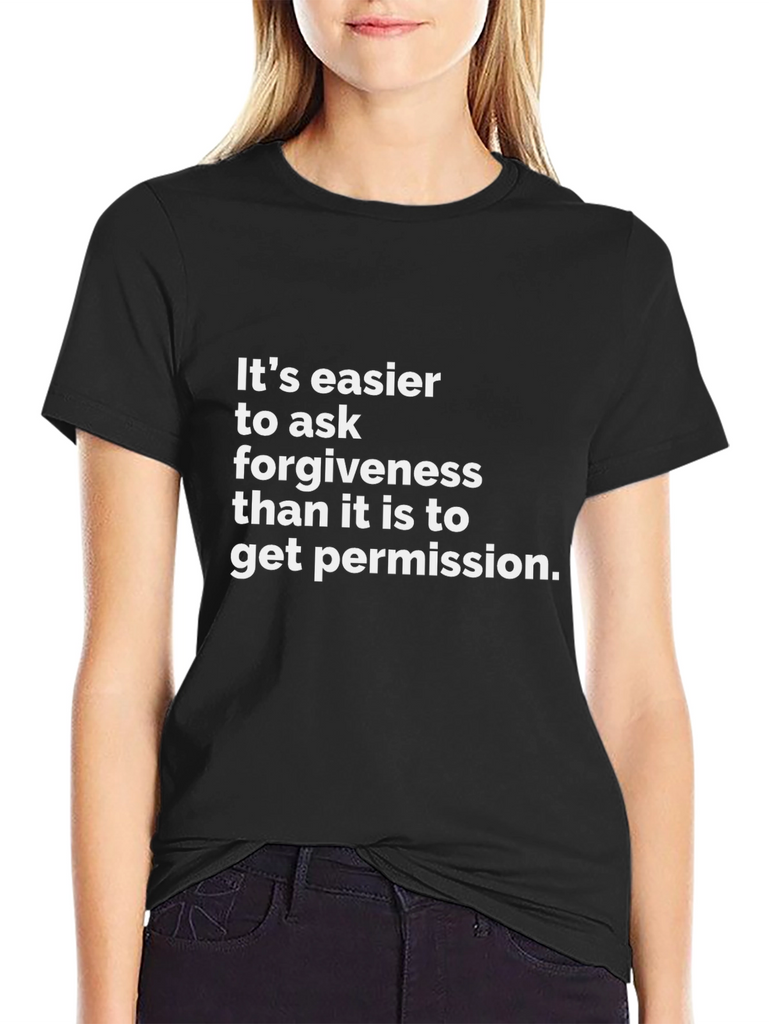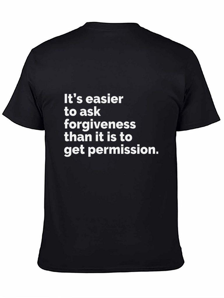 This bold, black t-shirt features a thought-provoking white text quote that reads "It's easier to ask forgiveness than it is to get permission." The shirt appears to be made of a comfortable cotton blend, ideal for everyday wear. Its classic fit and short sleeves make it a versatile addition to any wardrobe. Wear it to spark conversation, make a statement, or simply express your independent spirit. Perfect for casual outings, social gatherings, or as a unique gift for the daring individual. Embrace your rebellious side with this eye-catching and comfortable t-shirt.