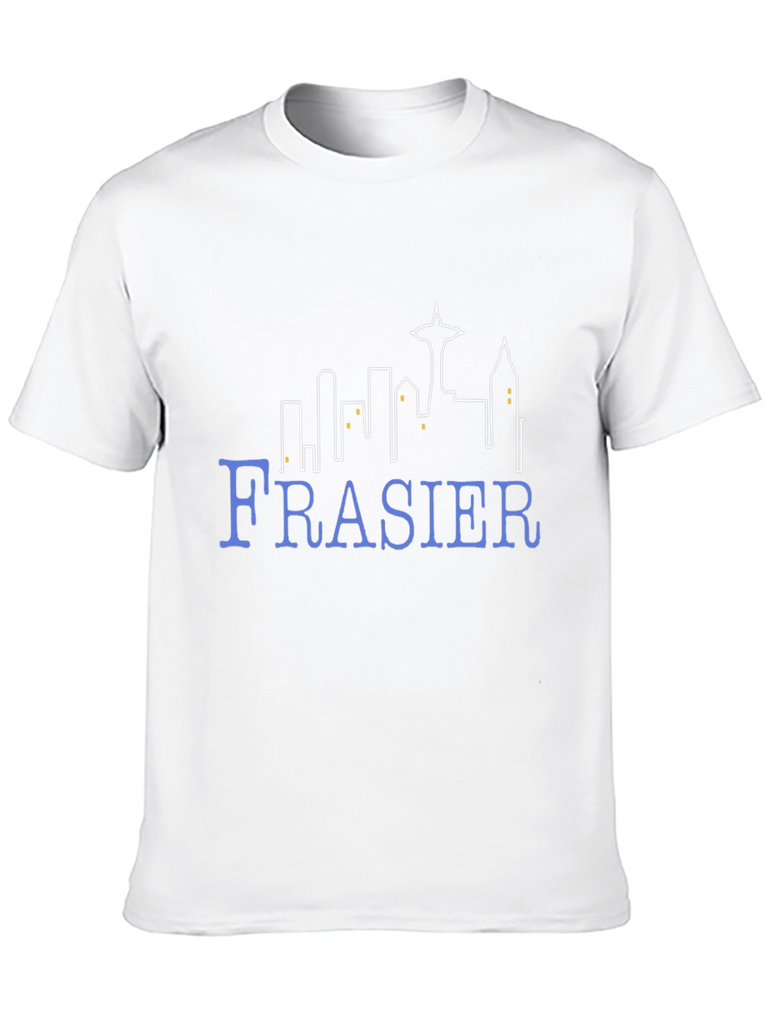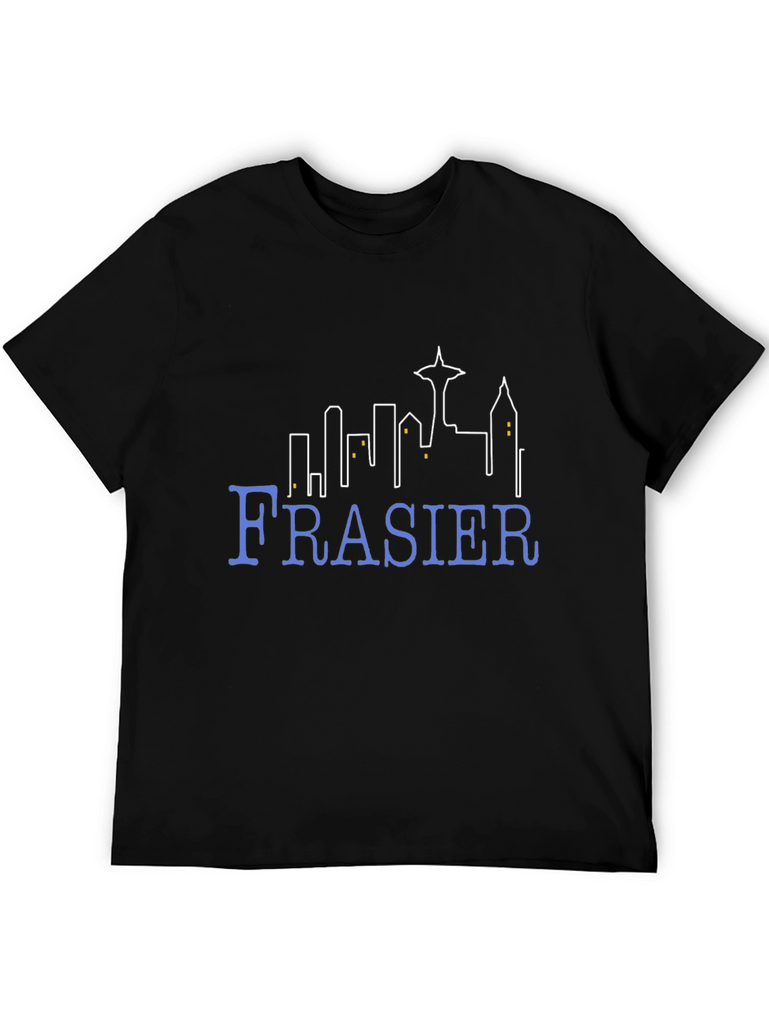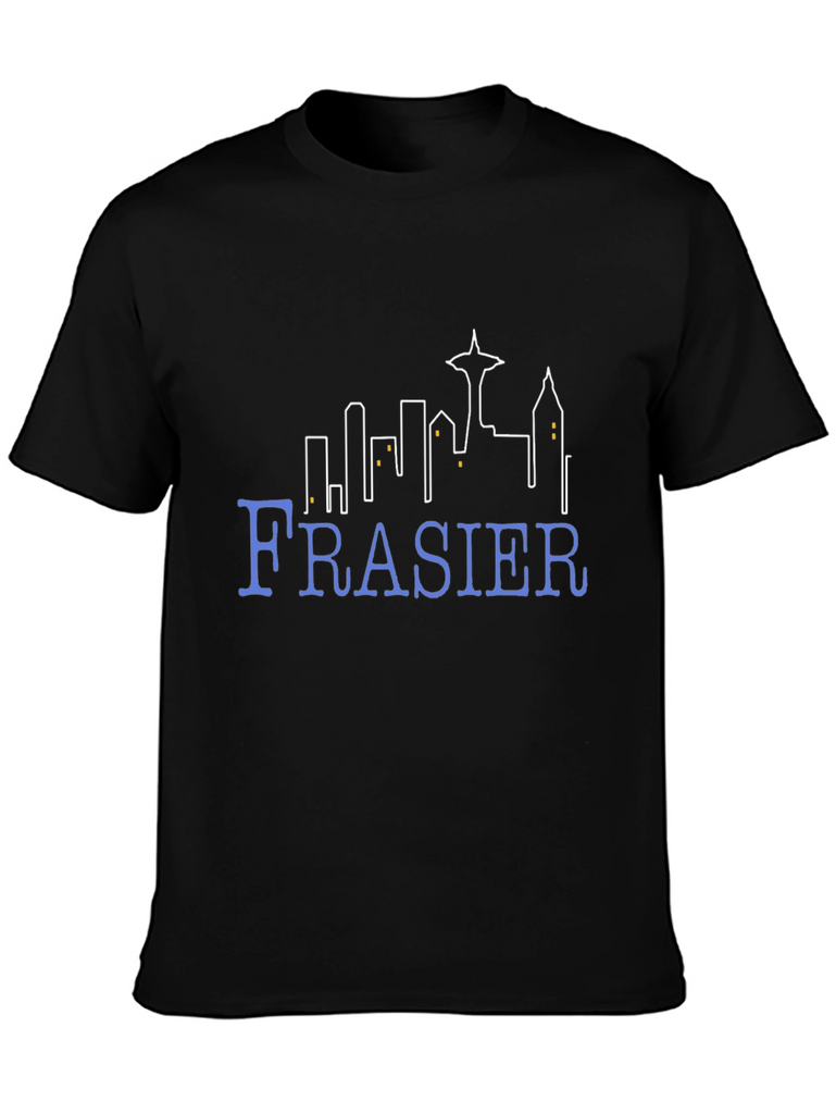 Show your love for the classic sitcom Frasier with this stylish black t-shirt! Featuring a unique skyline design of Seattle, where the show is set, along with the "FRASIER" in bold blue text, this shirt is a must-have for any fan. The design features silhouettes of the Space Needle, buildings, and window lights. Made from comfortable, breathable fabric, it's perfect for everyday wear. Whether you're lounging at home, running errands, or attending a Frasier watch party, this t-shirt will make a statement. Available in various sizes. Get yours today and let everyone know you're a Frasier fanatic!