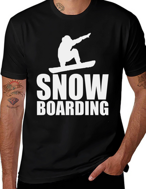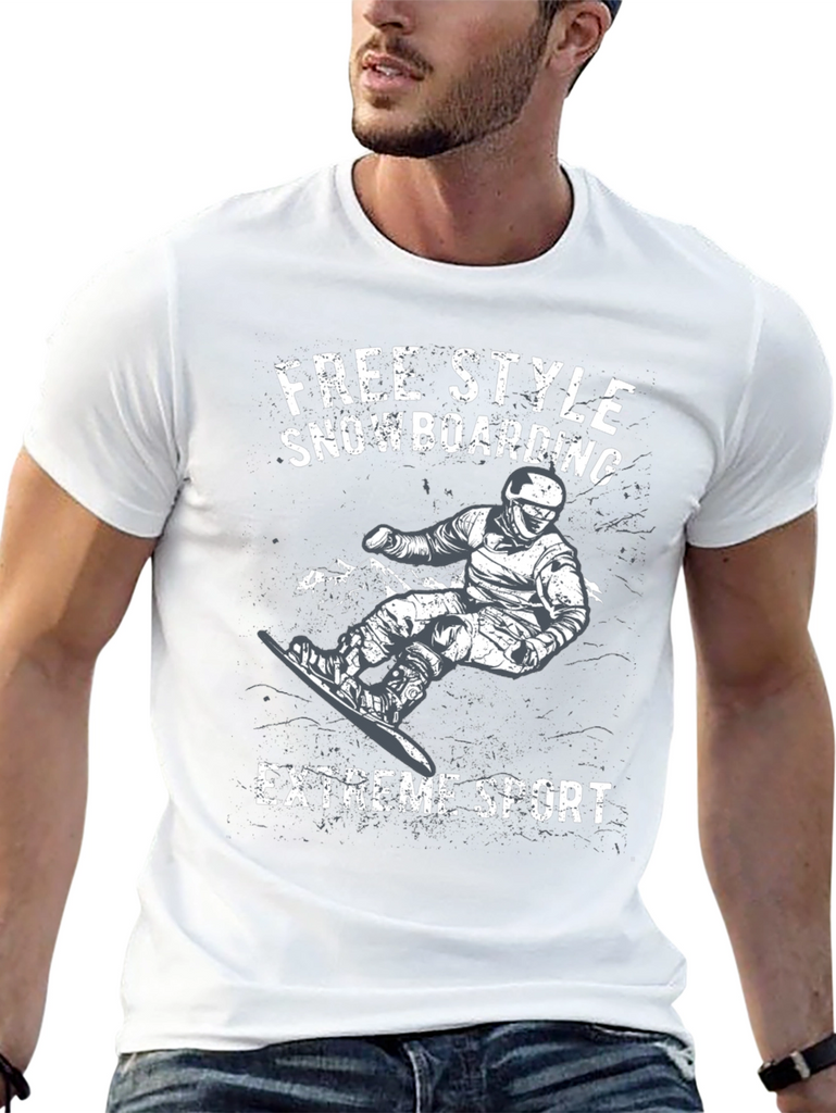 This black t-shirt features a bold design perfect for snowboarding enthusiasts. The graphic displays a snowboarder in action against a mountain backdrop, with distressed white text reading "FREE STYLE SNOWBOARDING" above and "EXTREME SPORT" below the image. It suggests a love for the adrenaline-pumping world of extreme sports. Made from a comfortable-looking fabric, this tee is ideal for casual wear or as a statement piece at winter sports events. Show off your passion for snowboarding with this eye-catching and stylish t-shirt. Perfect for layering or wearing on its own, it's a must-have for anyone who loves hitting the slopes.