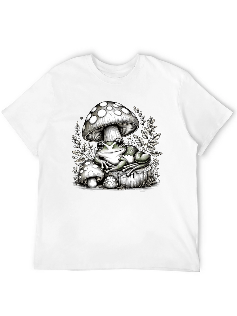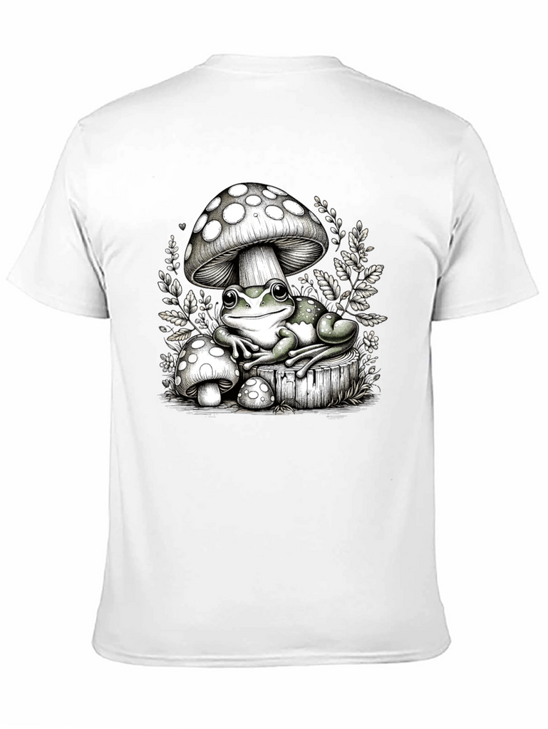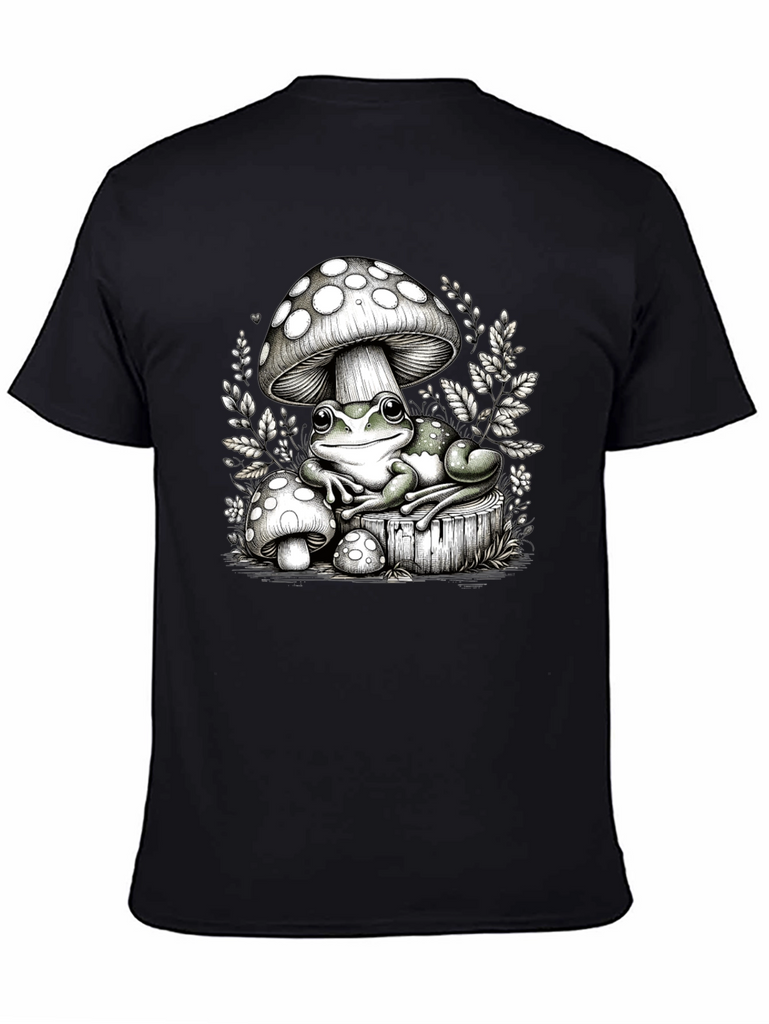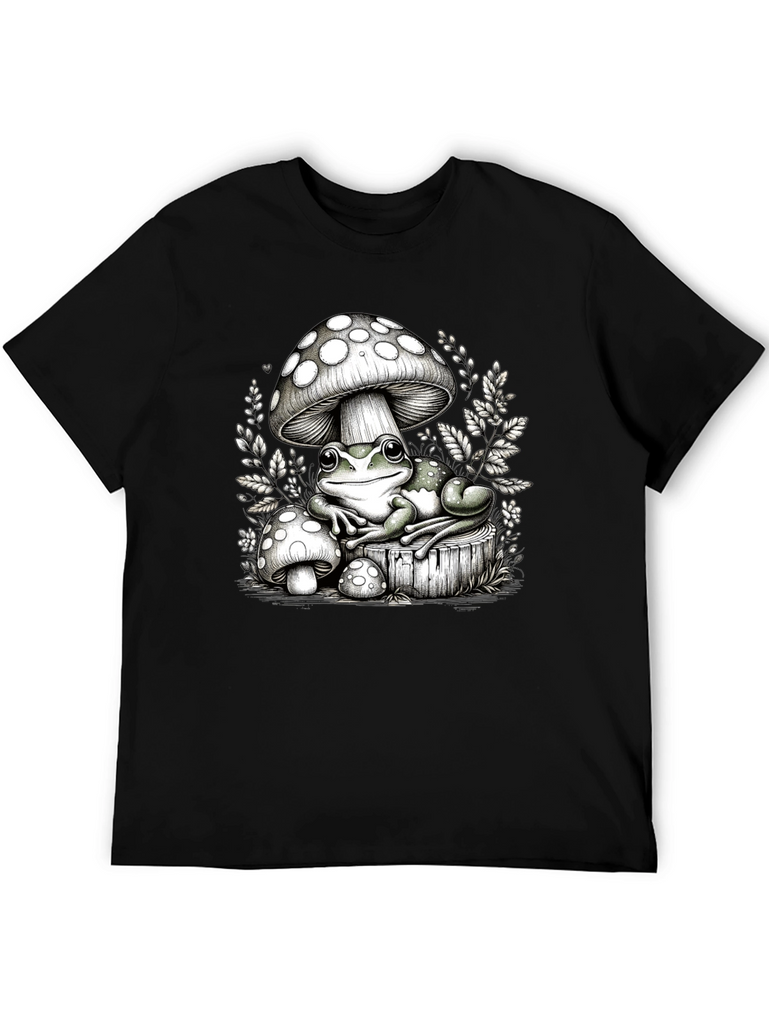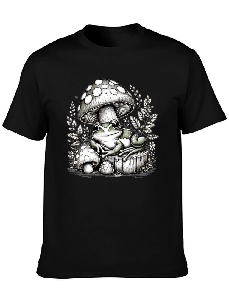 This black t-shirt features a charming illustration of a frog sitting on a tree stump under a large mushroom, surrounded by leafy plants. The design is detailed and eye-catching, making it a standout piece. The shirt appears to be made of soft, comfortable fabric, perfect for casual wear. Ideal for nature lovers, fans of whimsical art, or anyone who wants to add a touch of fun to their wardrobe. This tee is a great conversation starter and a stylish way to express your unique personality. Pair it with jeans or shorts for a relaxed and cool look.