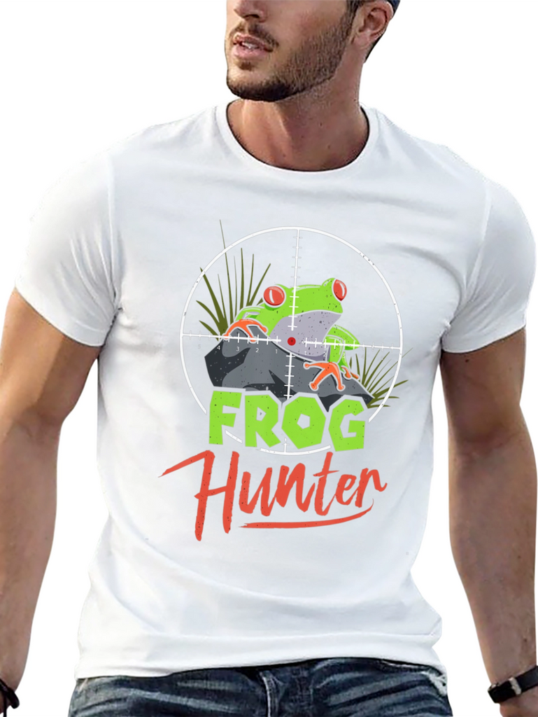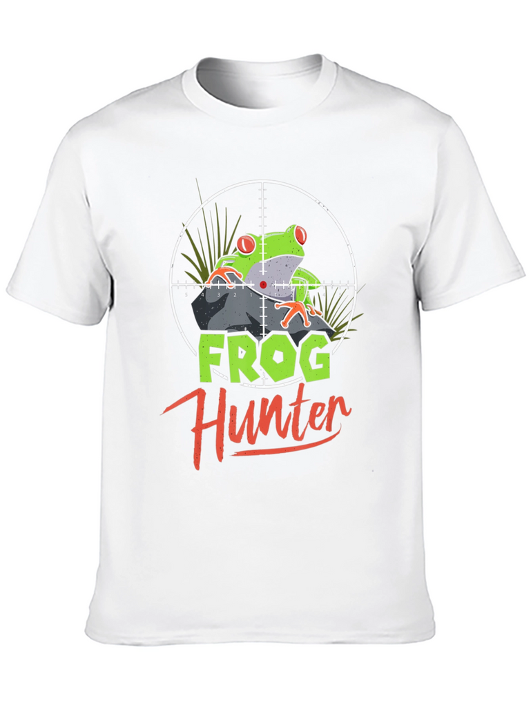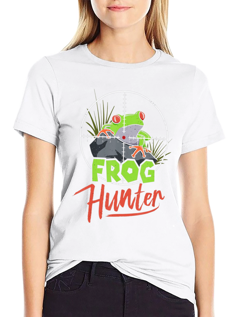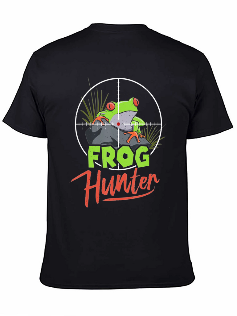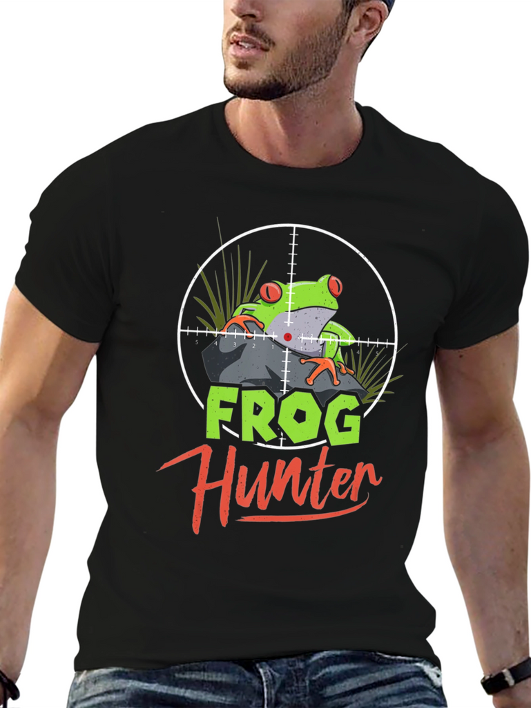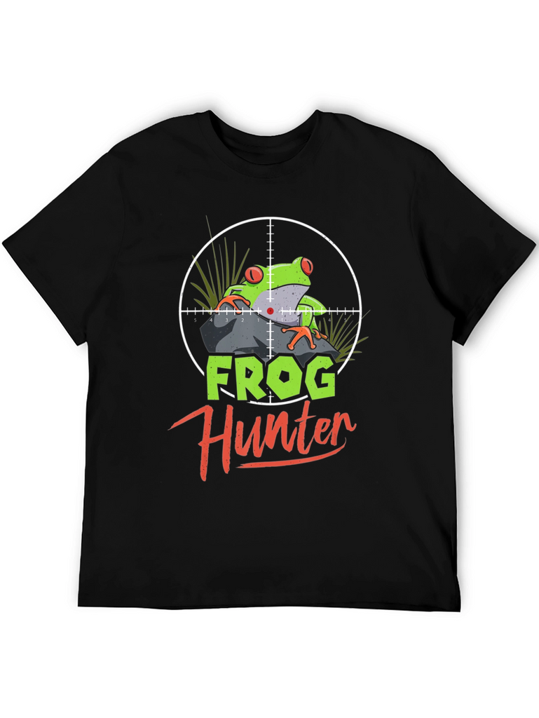 This stylish black t-shirt features a unique and humorous design. A green tree frog is centered inside a white target scope, giving the impression that it's being hunted. Bold green text spells out "FROG" with "Hunter" written in eye-catching red beneath it, creating a playful yet slightly edgy vibe. Crafted from comfortable fabric, this tee is perfect for casual wear, making a statement, or showcasing a love for wildlife. It is ideal for outdoor enthusiasts, nature lovers, or anyone with a sense of humor. Wear it on your next adventure, to a casual gathering, or simply to express your unique personality. Get yours today and stand out from the crowd!