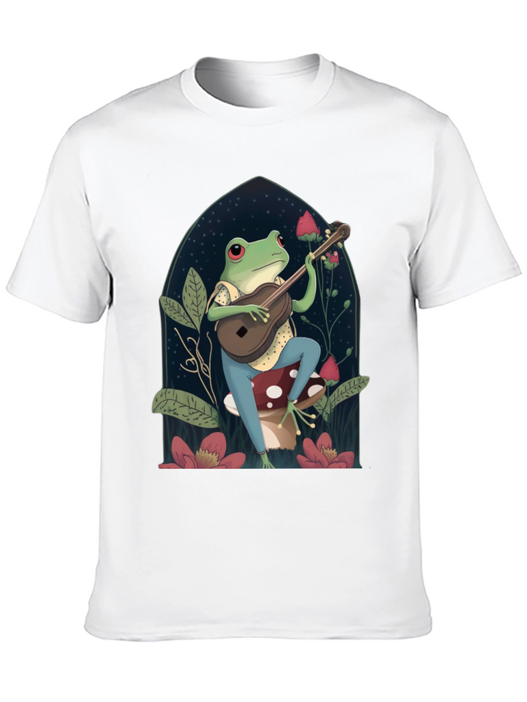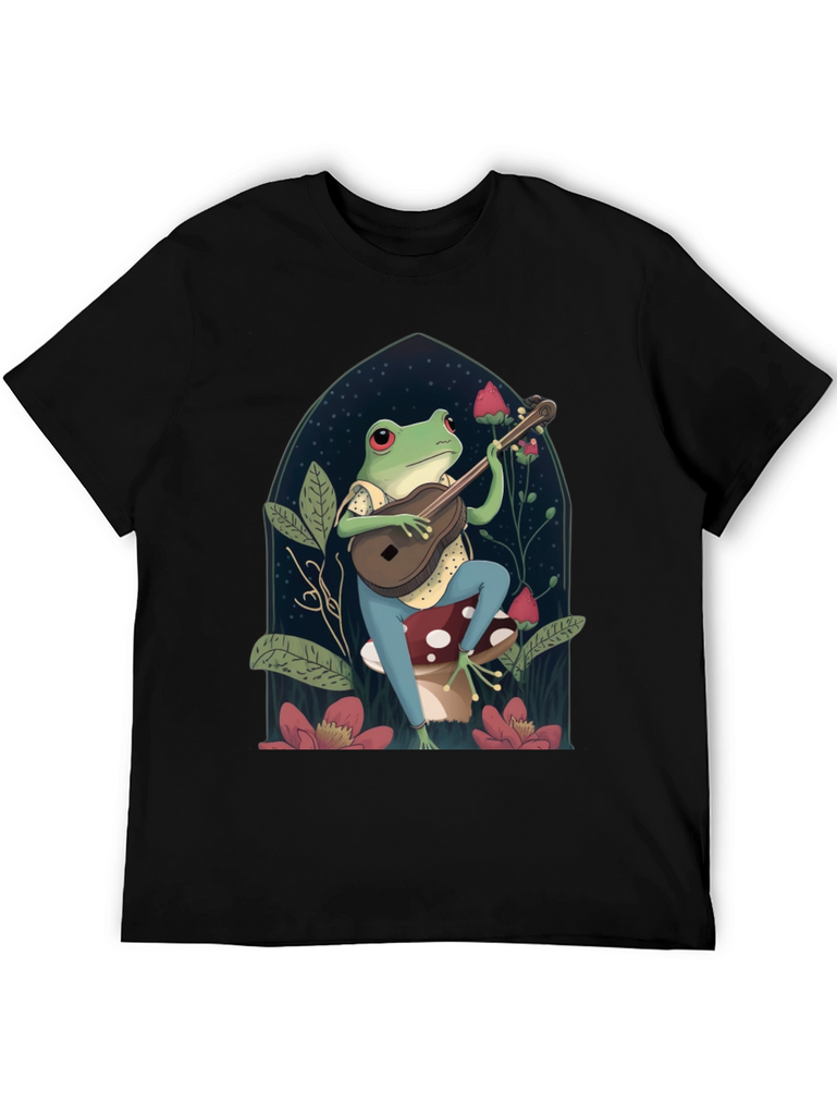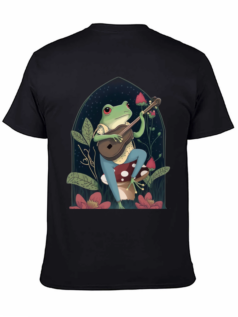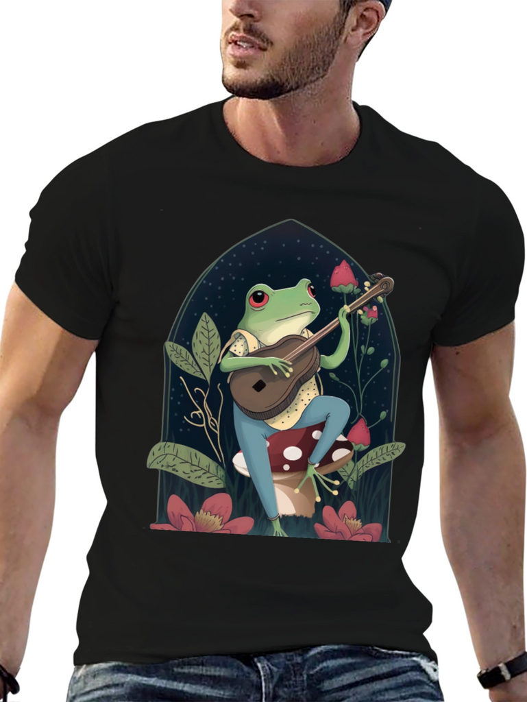 Express your love for music and nature with this unique t-shirt. The design features an artistic illustration of a frog in a light colored shirt and blue pants, sitting on a mushroom and playing a guitar, set against a night backdrop with starry sky and flowers. Made from comfortable, breathable fabric, this black t-shirt offers a relaxed fit for everyday wear. Ideal for casual outings, music events, or as a quirky gift for the frog/music lover in your life. Make a statement with this eye-catching design!