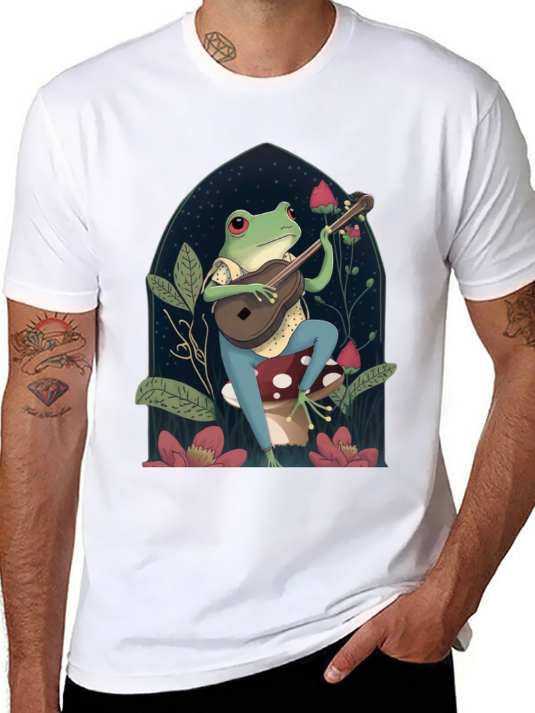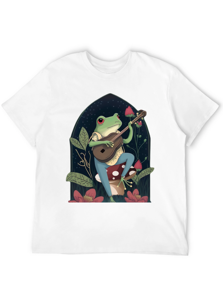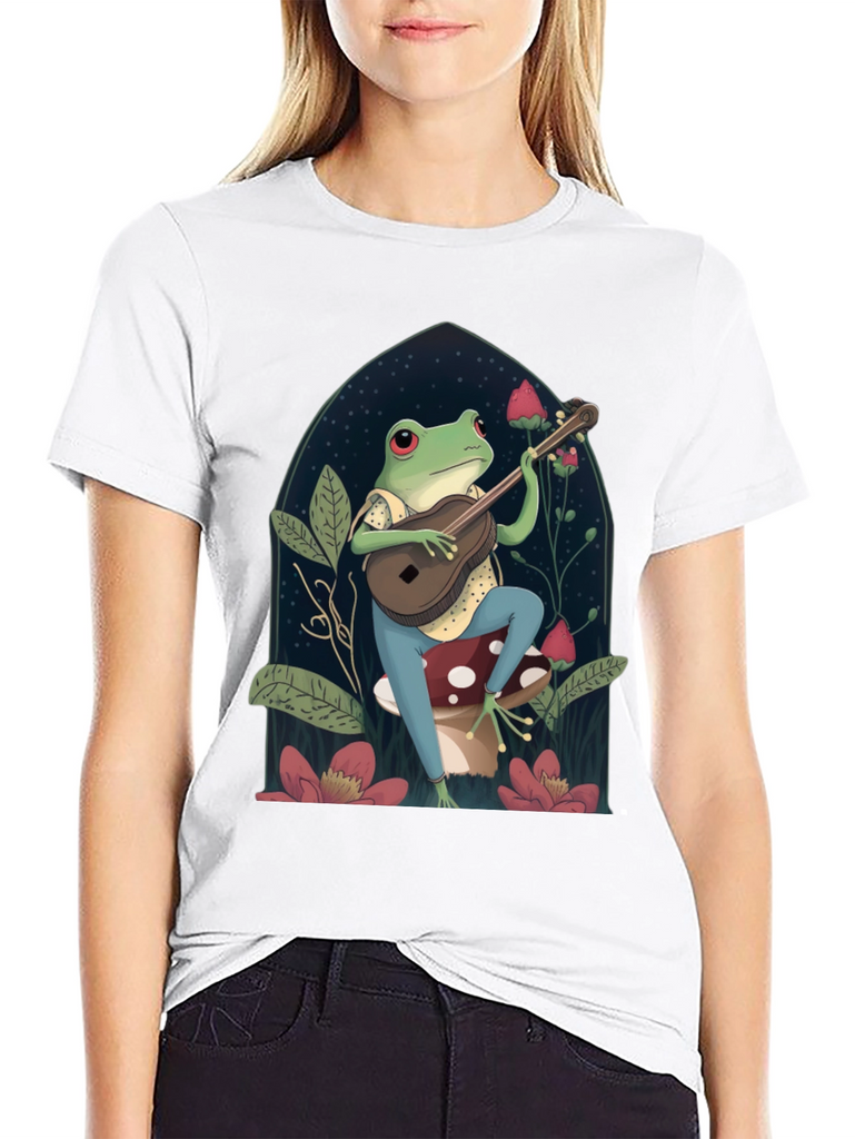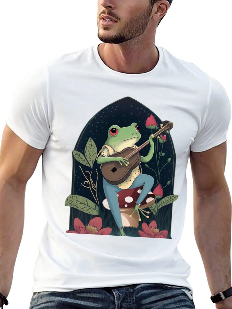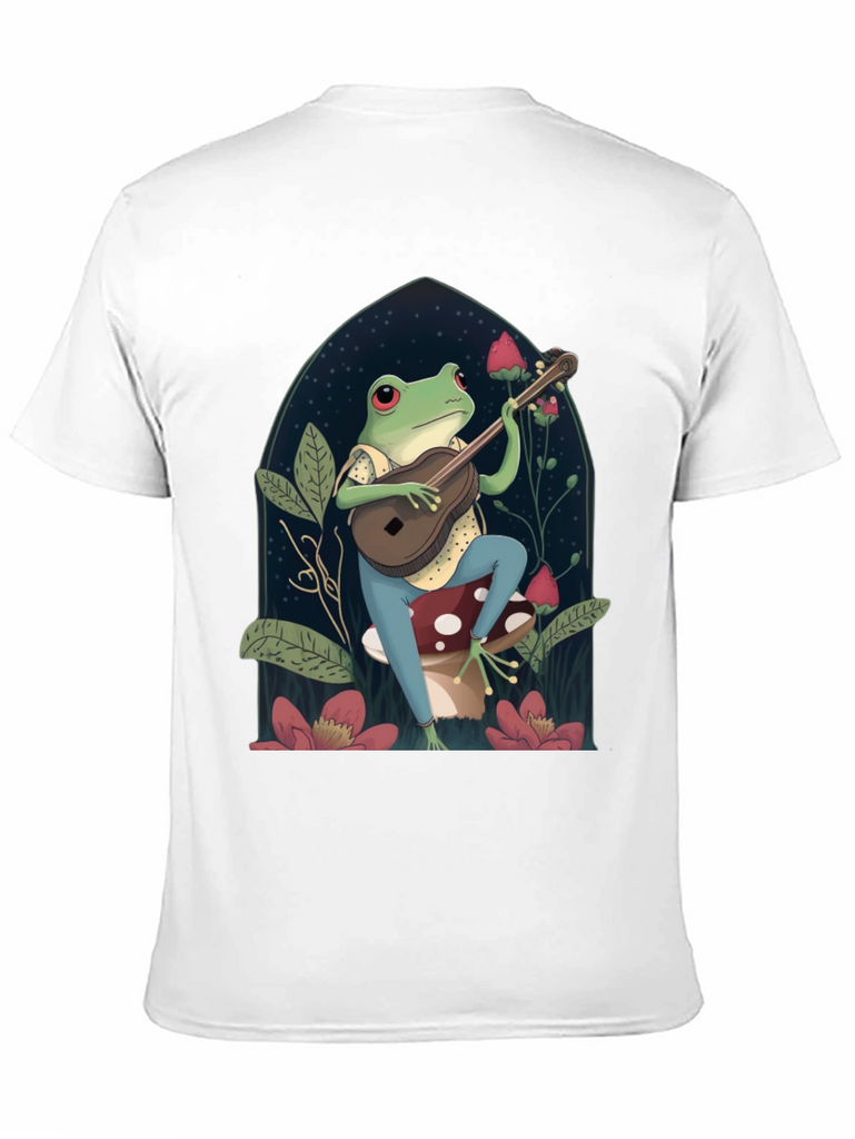 Express your love for music and nature with this unique t-shirt. The design features an artistic illustration of a frog in a light colored shirt and blue pants, sitting on a mushroom and playing a guitar, set against a night backdrop with starry sky and flowers. Made from comfortable, breathable fabric, this black t-shirt offers a relaxed fit for everyday wear. Ideal for casual outings, music events, or as a quirky gift for the frog/music lover in your life. Make a statement with this eye-catching design!