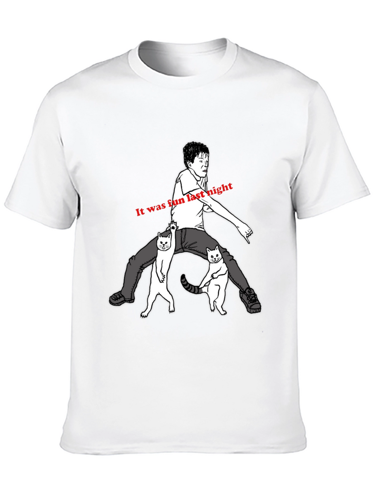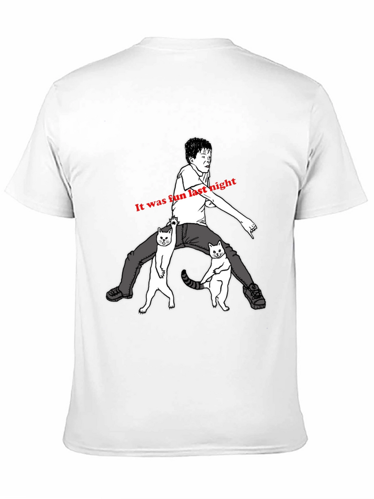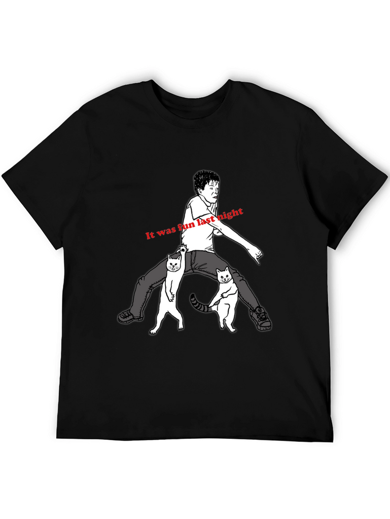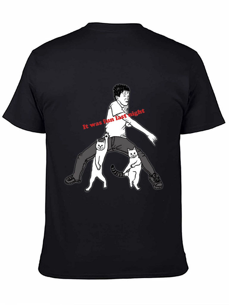 This stylish black t-shirt features a unique graphic design of a person with two cats. Above the character is the text "It was fun last night". The design is eye-catching and adds a playful touch to your casual wardrobe. The t-shirt is made of soft and comfortable fabric, ensuring all-day comfort. This tee is perfect for casual outings, weekend gatherings, or simply lounging at home. Show off your love for cats with this unique and fashionable t-shirt.